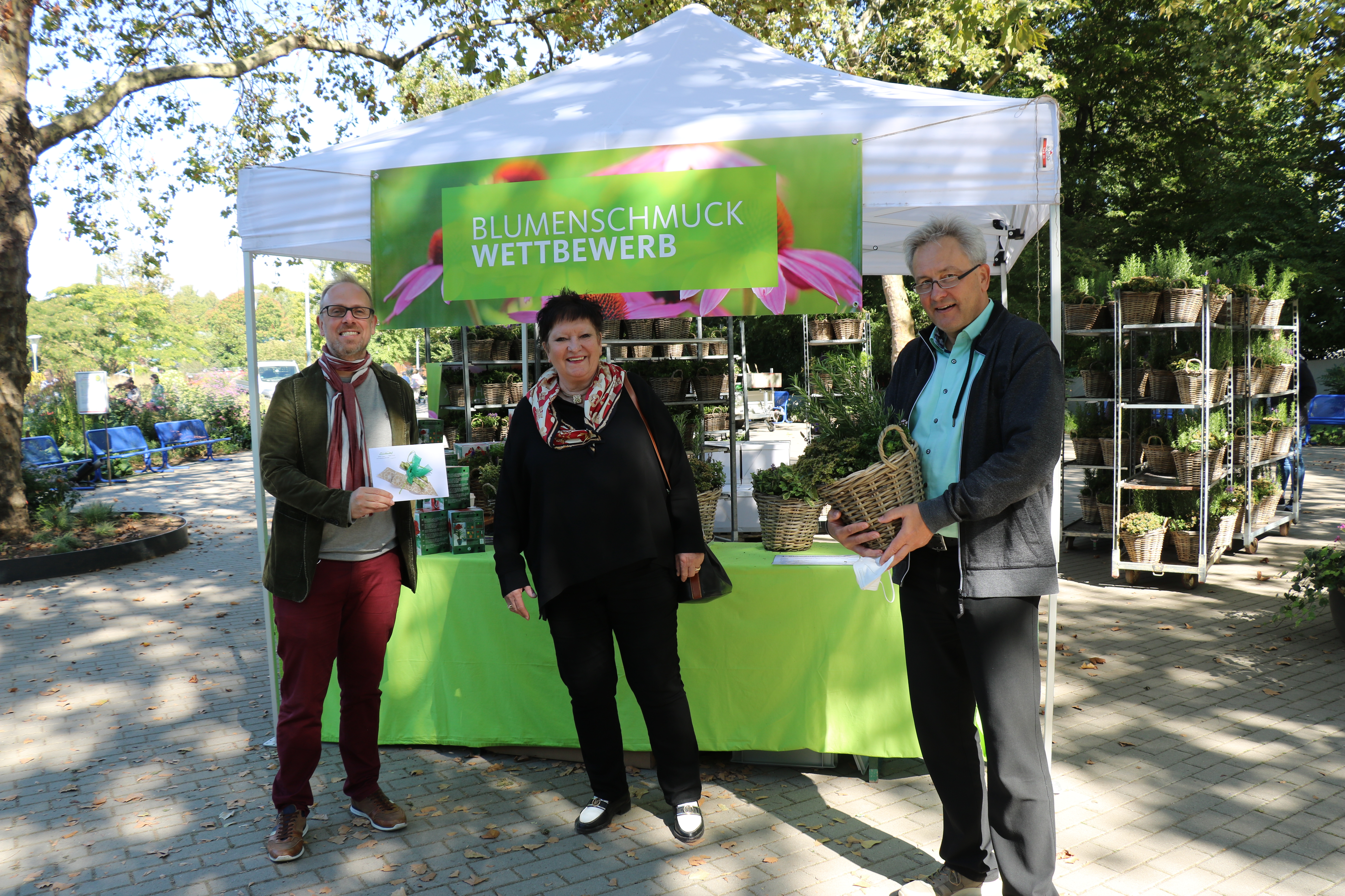 Bürgermeister Dirk Grunert (l.) übergibt zusammen mit Herr Schwennen (r.) vom Stadtraumservice den Hauptpreis des diesjährigen Blumenschmuck-Wettbewerbs an Frau Häußler (m.).