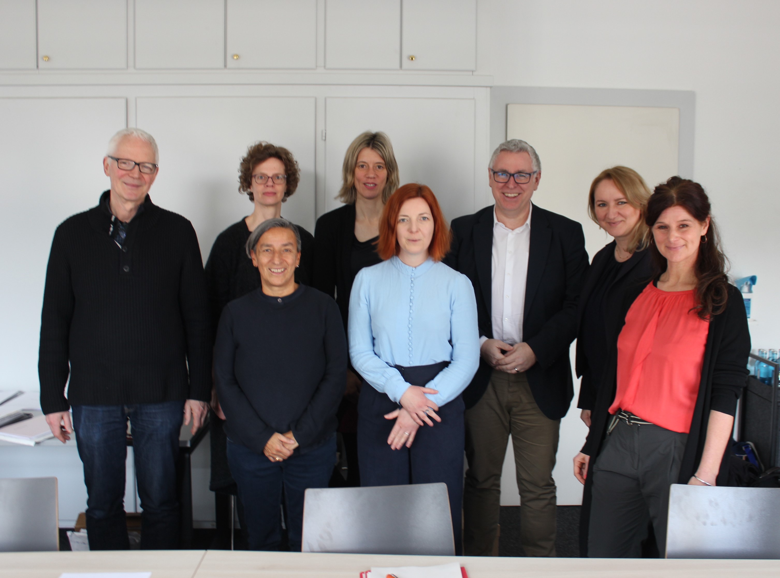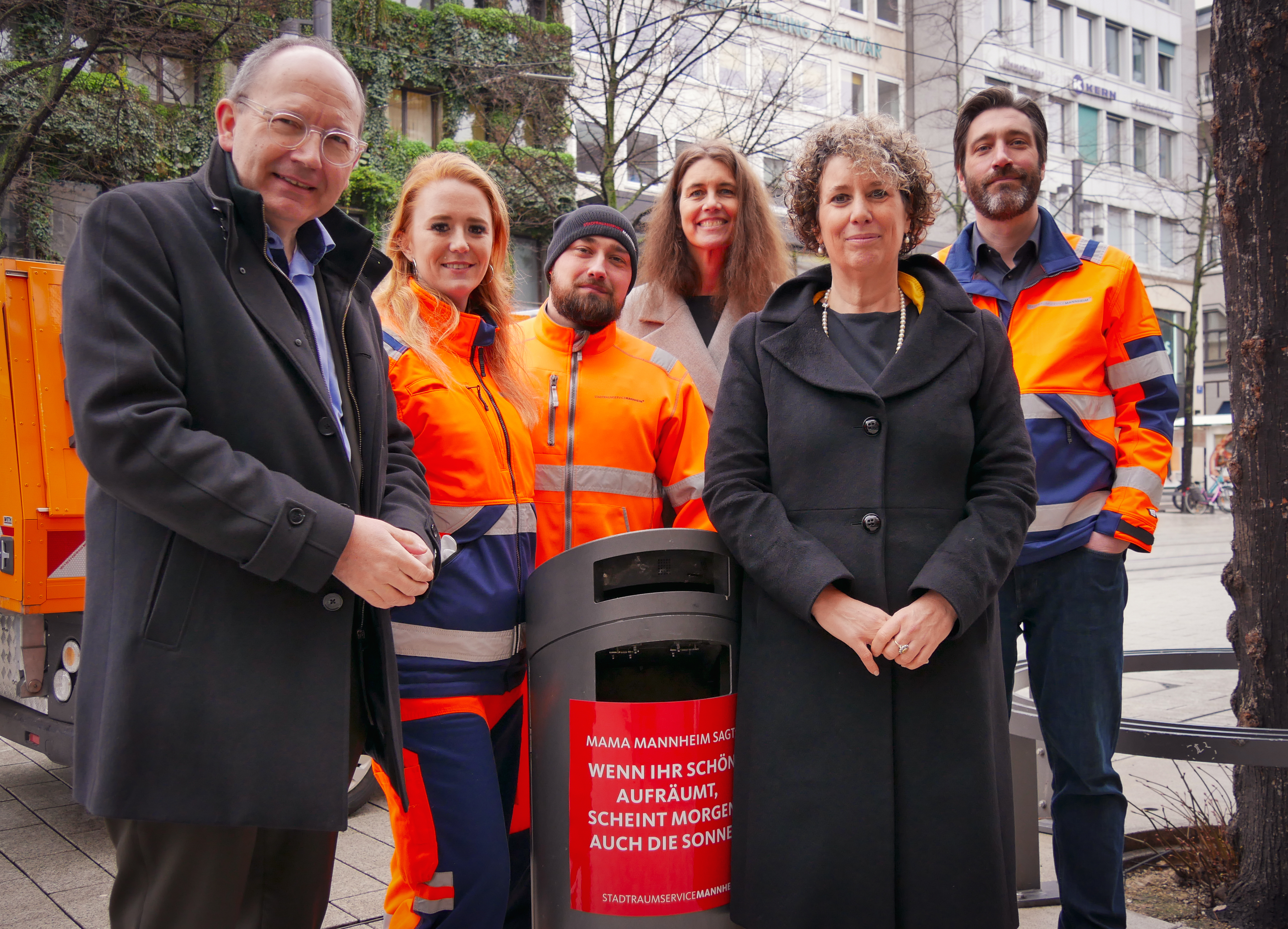 Oberbürgermeister Christian Specht und Erste Bürgermeisterin Prof. Dr. Diana Pretzell (beide vorne) mit René Bison (Abteilungsleiter Stadtreinigung) und Alexandra Kriegel (Eigenbetriebsleitung Stadtraumservice) sowie zwei Kollegen der Stadtreinigung freuen sich über coole Sprüche auf den Abfalleimern in der Innenstadt.
