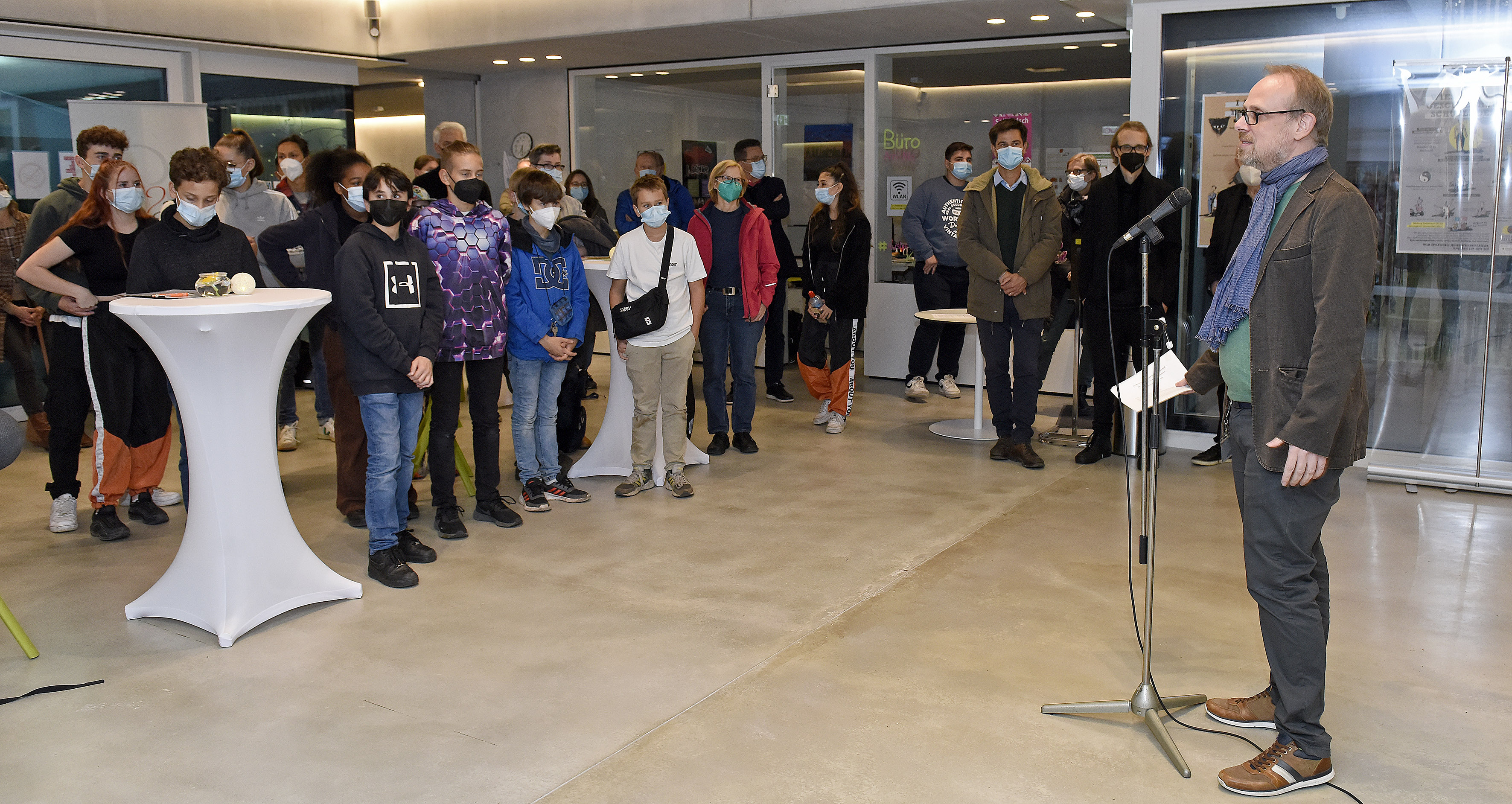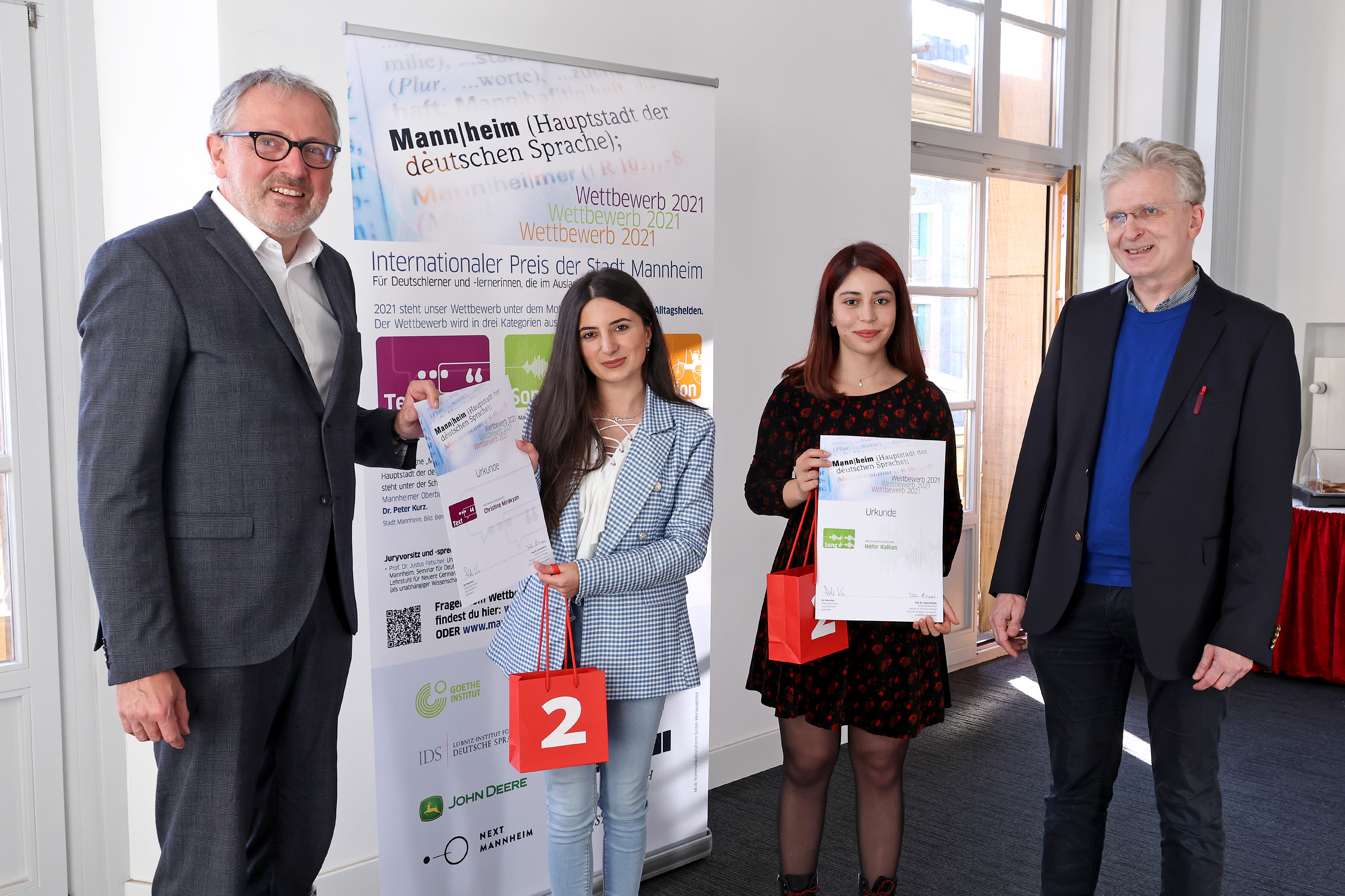 Unser Bild zeigt von links nach rechts: Oberbürgermeister Dr. Peter Kurz, Christine Mirakyan, Nehir Kalkan und Prof. Dr. Justus Fetscher von der Universität Mannheim