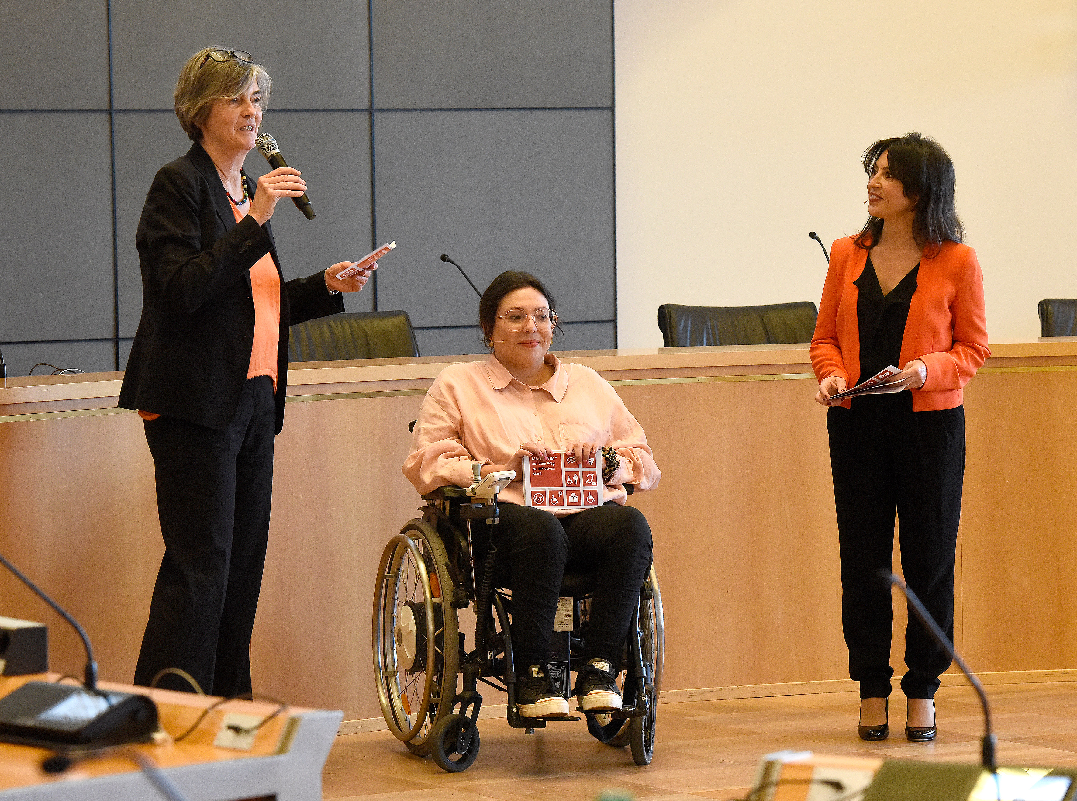 Forum für Inklusion und Barrierefreiheit: Kommunikation in der inklusiven Stadt: Ursula Frenz, Beauftragte für die Belange von Menschen mit Behinderungen, Stadt Mannheim und die Moderatorinnen Kim Lumelius und Rosa Omenaca Prado (v.l.n.r.)