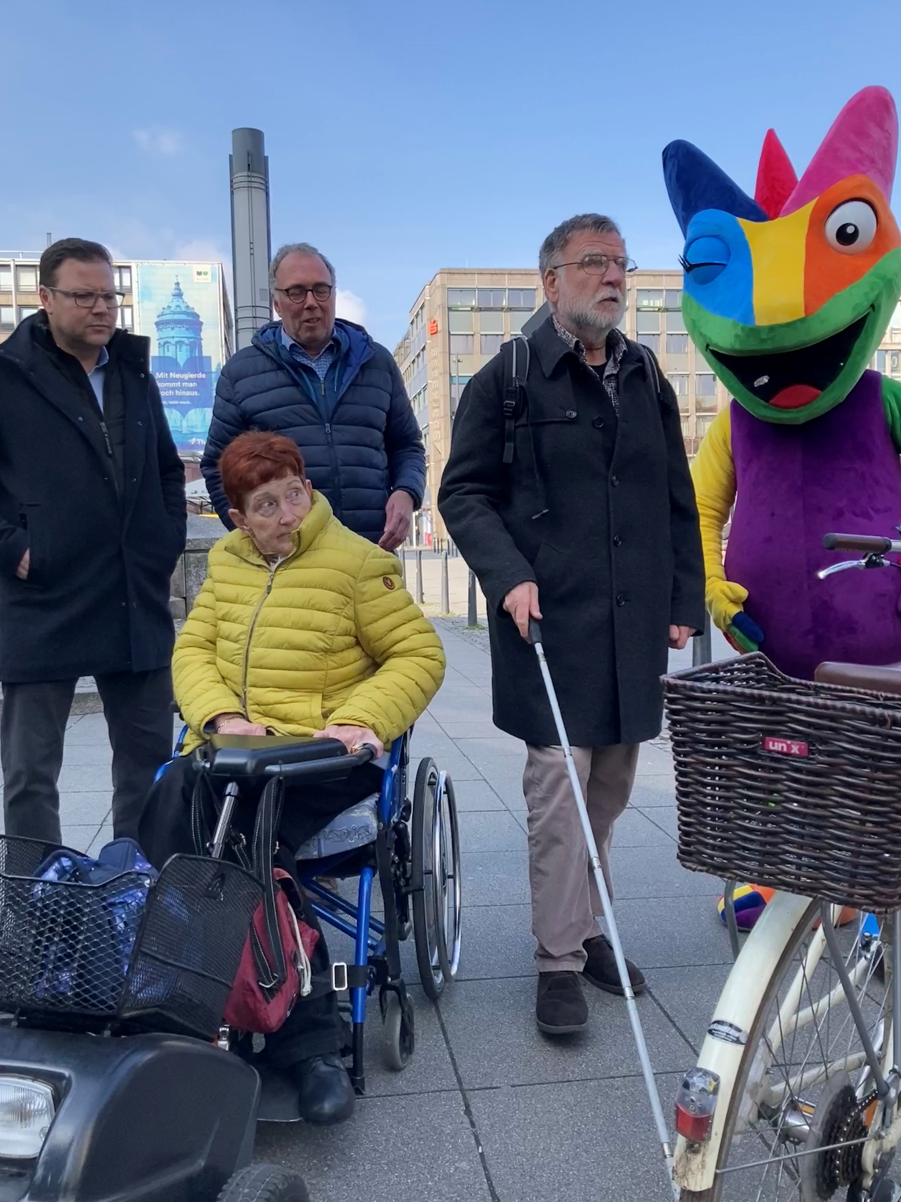 • Bürgermeister und Sicherheitsdezernent Dr. Volker Proffen, Maskottchen Chämy, Karlheinz Schneider vom BBSV, Elke Campioni von der AG Barrierefreiheit Rhein-Neckar e. V. beim Rundgang