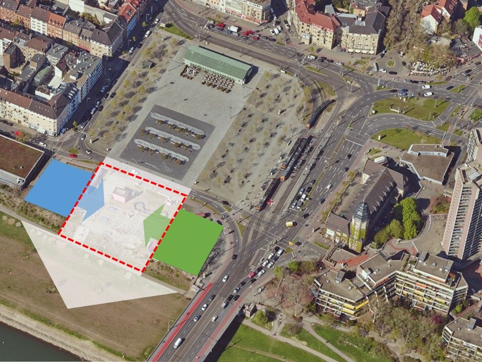 So soll der südliche Alte Meßplatz künftig aussehen: Das Forum Deutsche Sprache (blau) sowie die Zwischennutzer ALTER und Einraumhaus und das Folgeprojekt OASE (gelb) sollen auf den Platz integriert und eine Öffnung zum Neckar angestrebt werden.
