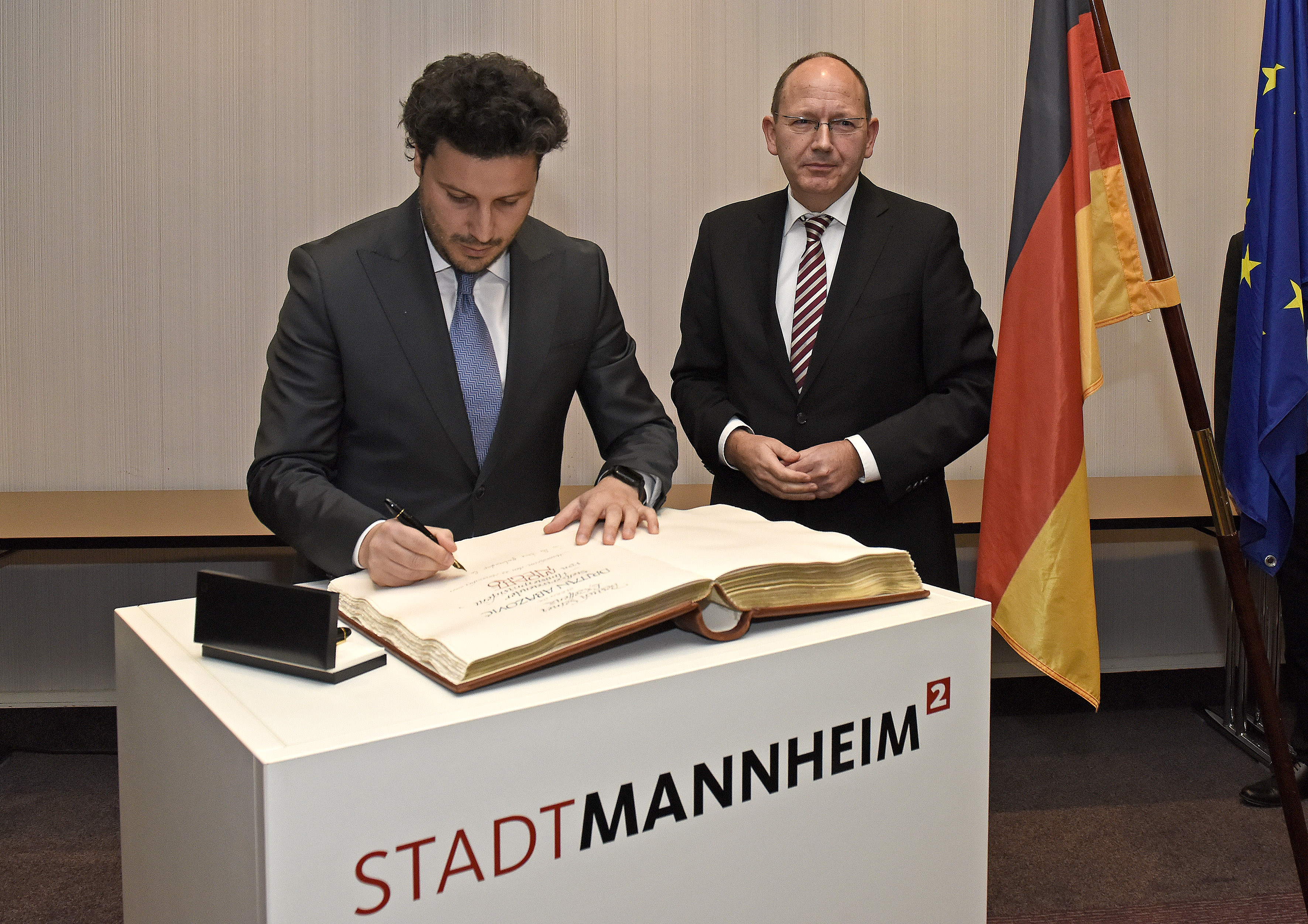 Dr. Dritan Abazović, stellvertretender Ministerpräsident von Montenegro, mit Christian Specht, Erster Bürgermeister der Stadt Mannheim, beim Eintrag in das Goldene Buch der Stadt Mannheim.