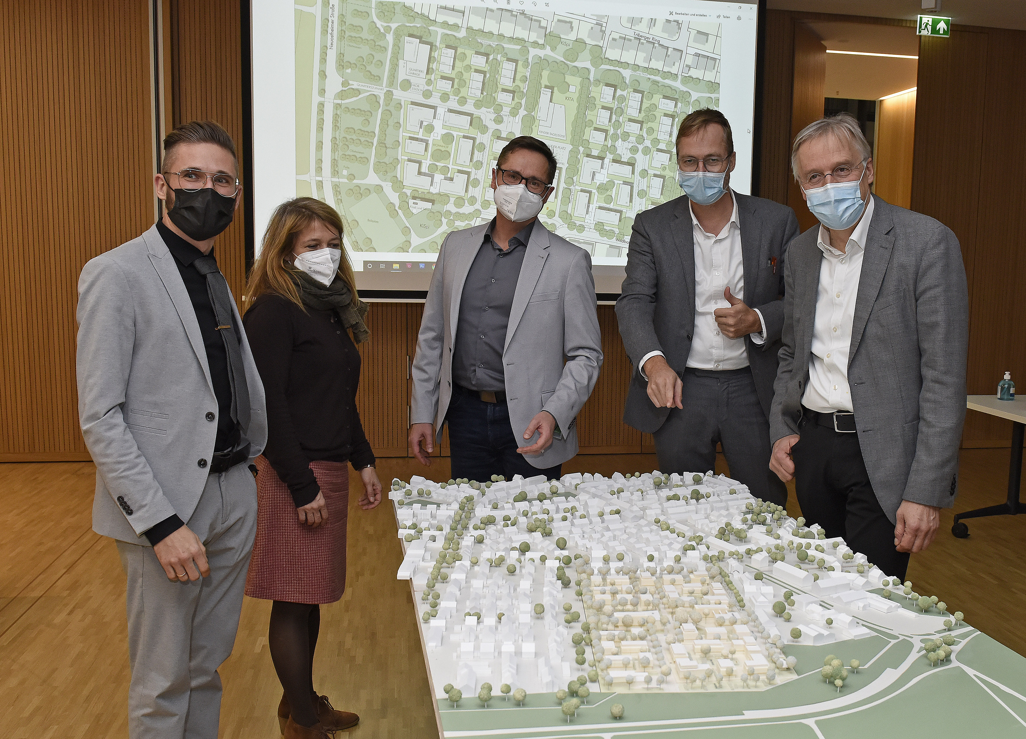 Freuen sich über das Wettbewerbsergebnis (von links): Verfahrensbetreuer Fabrice Tesch, Preisgerichtsvorsitzende Prof. Dr. Barbara Engel, Baubürgermeister Ralf Eisenhauer, Verfahrensbetreuer Marcus Hille und Klaus Elliger, Leiter des wettbewerbsausrichtenden Fachbereichs Geoinformation und Stadtplanung.