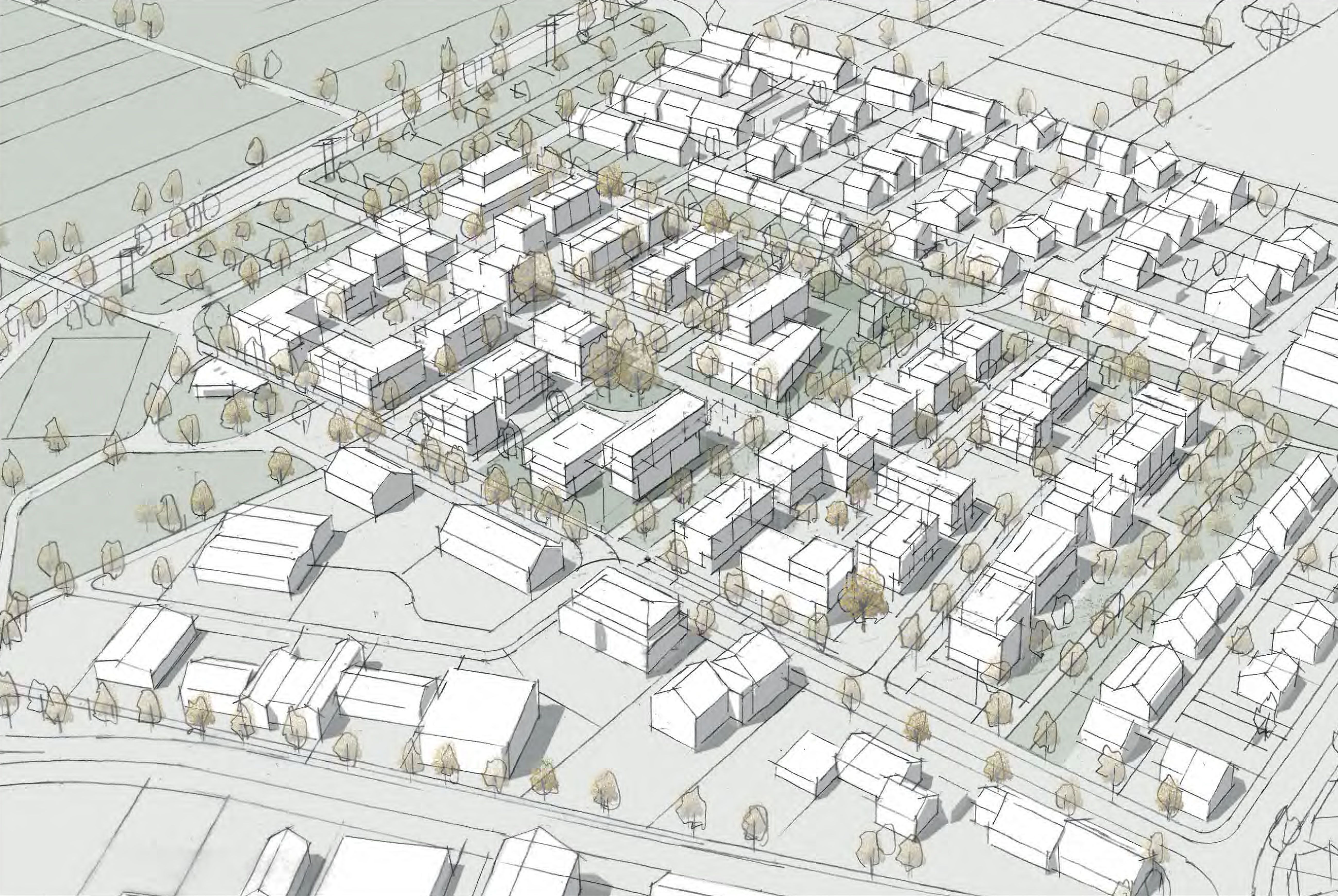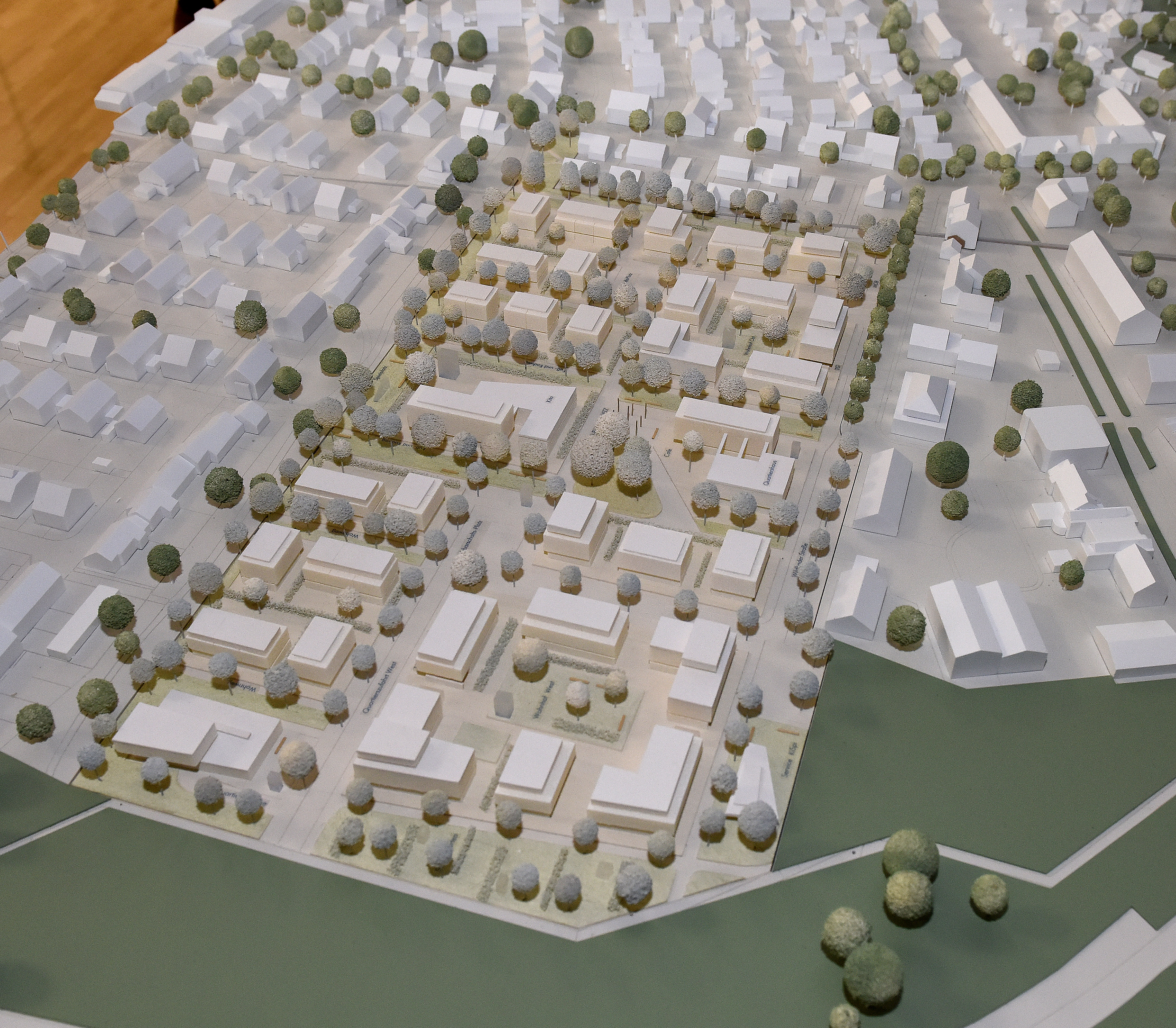 Der Siegerentwurf von Trojan + Trojan zeigt, wie sich das neue Stadtquartier auf der Otto-Bauder-Anlage (gelb unterlegt) stimmig in die bereits bestehende Baustruktur Seckenheims einfügt.
