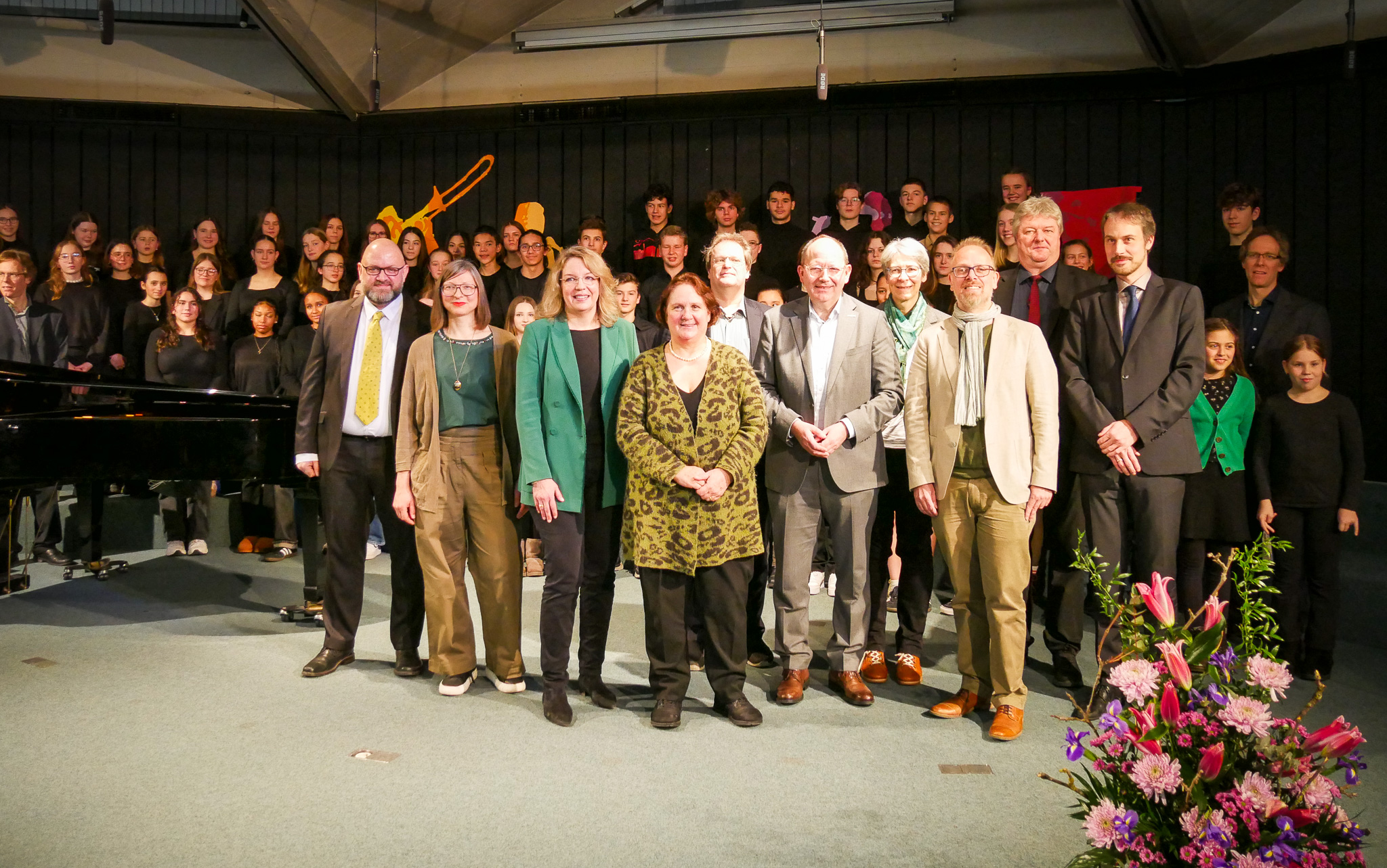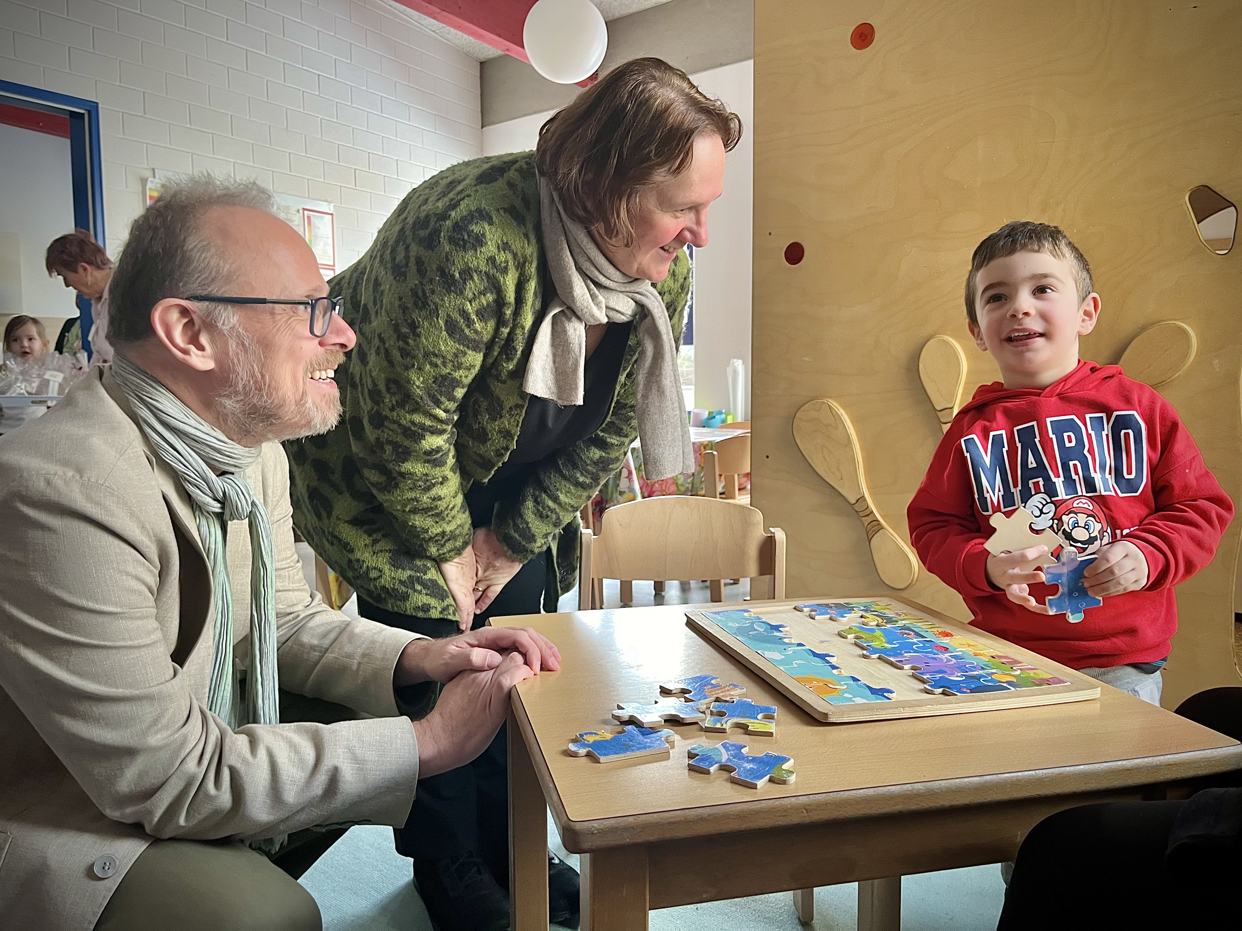 Ministerin Schopper und Bildungsbürgermeister Grunert mit Kind