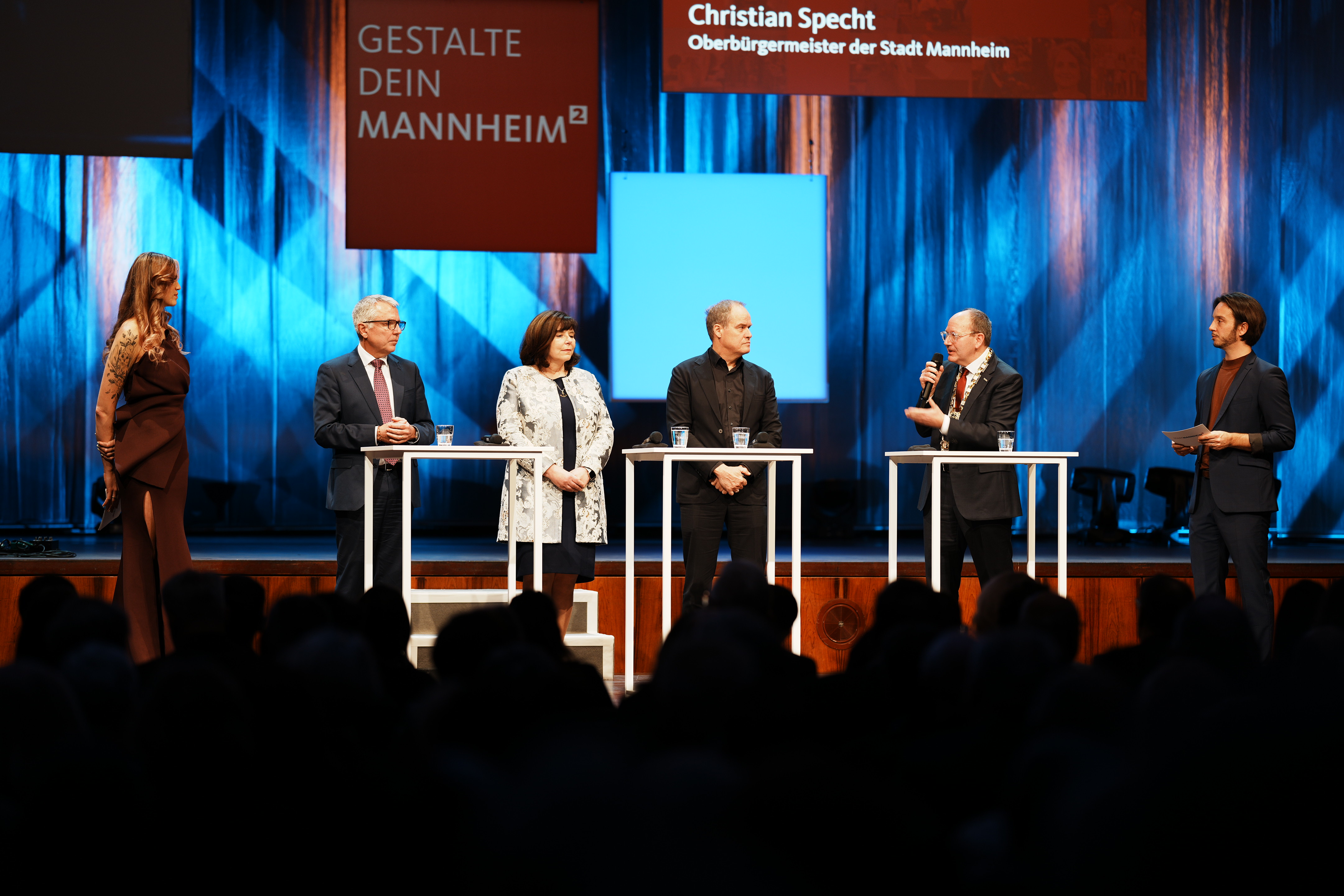 Neujahrsempfang 2024: Talkrunde zum Ehrenamt mit Dominik Mondl vom TV 1880 Käfertal e.V., Ines Reichel von der Freiwilligen Feuerwehr und Esther Noack, Vorlesepatin des Projekts „Mannheim liest vor“