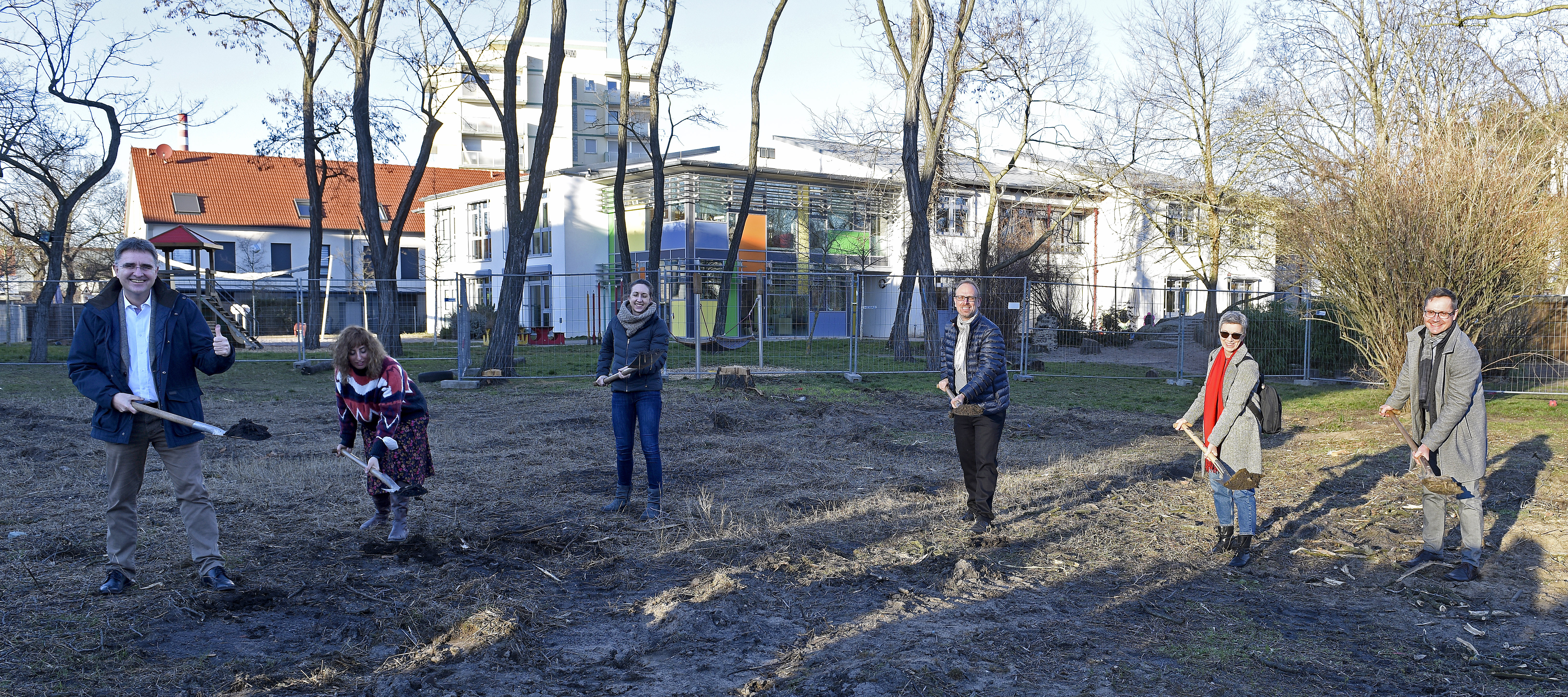 Freuen sich gemeinsam, dass der Bau des neuen Jugendtreffs im Stadtteil Luzenberg nun los geht (von rechts): Baubürgermeister Ralf Eisenhauer, Architektin Karin M. Storch, Bildungsbürgermeister Dirk Grunert, Sarah Mehring (Leiterin Eltern-Kind-Zentrum), Bilgehan Cetin (Streetworkerin Luzenberg) und Stefan Fulst-Blei (Vorsitzender Förderverein Jugendtreff Luzenberg).