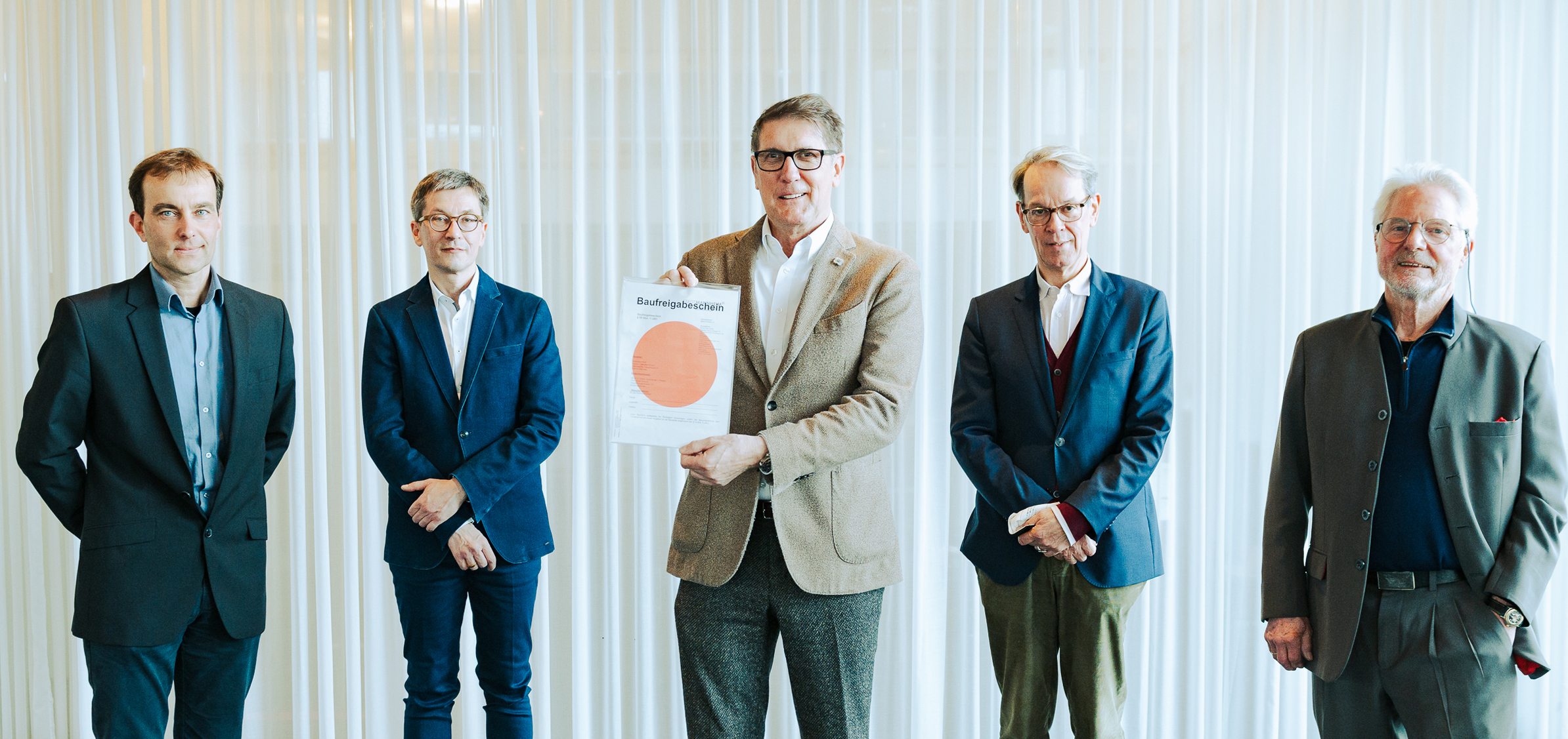 Auf dem Bild: Marcus Augsburger (Leiter der Geschäftsstelle Generalsanierung Nationaltheater Mannheim), Christian Hauss (Architekt Nationaltheater Mannheim), Bürgermeister Michael Grötsch, Albrecht Puhlmann (Intendant Oper), Prof. Peter Schuck (Architekt Metron Vilshofen GmbH)