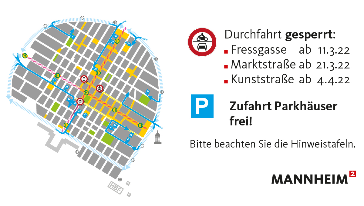 Ab dem 11. März gilt in der Mannheimer Innenstadt eine neue Verkehrsführung. Die Durchfahrt in der Fressgasse, Marktstraße und Kunststraße wird dann unterbrochen.