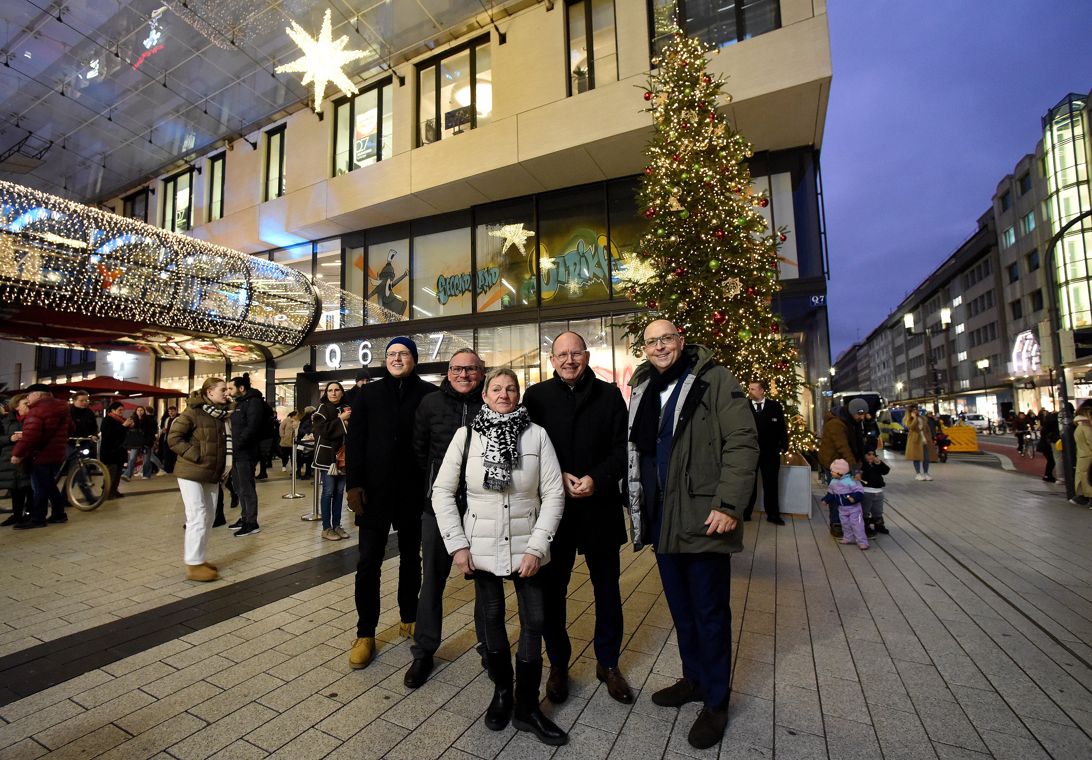 Markus Erhardt, Vizepräsident des Rotaract Clubs Mannheim, Rainer Hartel, Geschäftsführer der Ravensburger Freizeit & Promotion GmbH, Traudl Bellon, Leiterin des Haus St. Agnes des Kath. Kinder- und Jugendheim St. Josef, Mannheims Oberbürgermeister Christian Specht und Quartier-Chef Hendrik Hoffmann (v.l.n.r.) haben die Weihnachtszeit auf dem Münzplatz eingeläutet und die Weihnachtsbeleuchtung eingeschaltet.