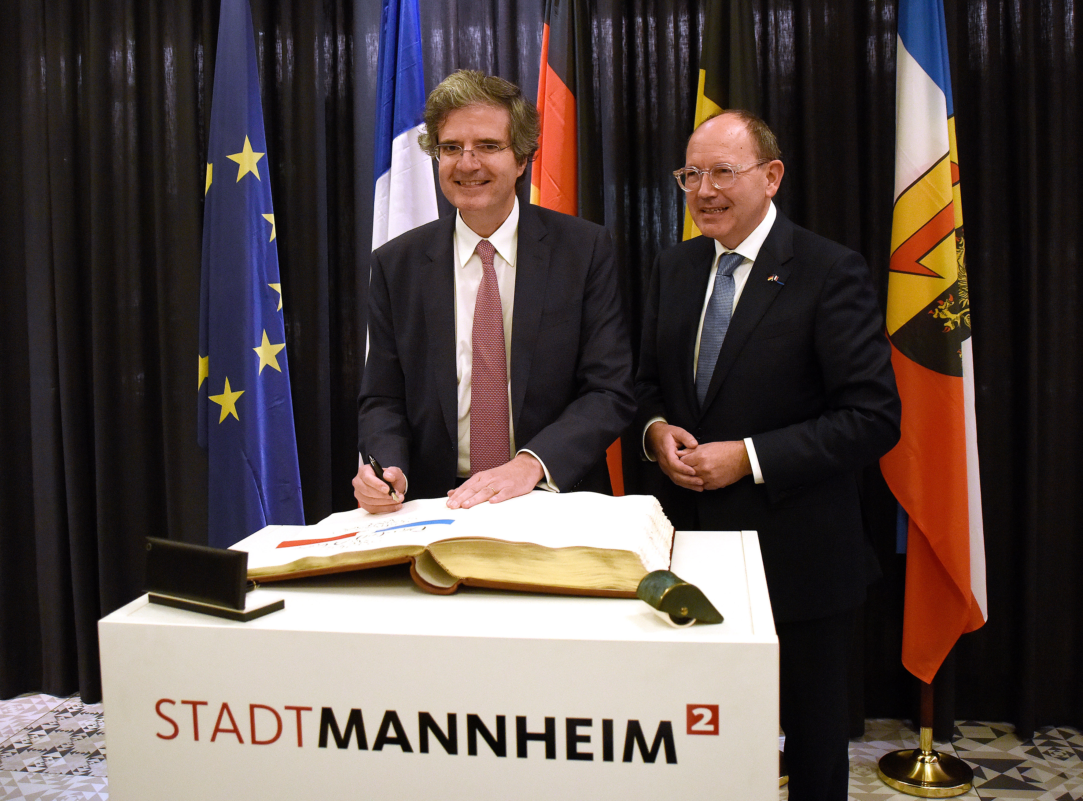 Unser Bild zeigt Botschafter François Delattre, der sich im Beisein von Oberbürgermeister Christian Specht ins Goldene Buch der Stadt Mannheim eintrgät.