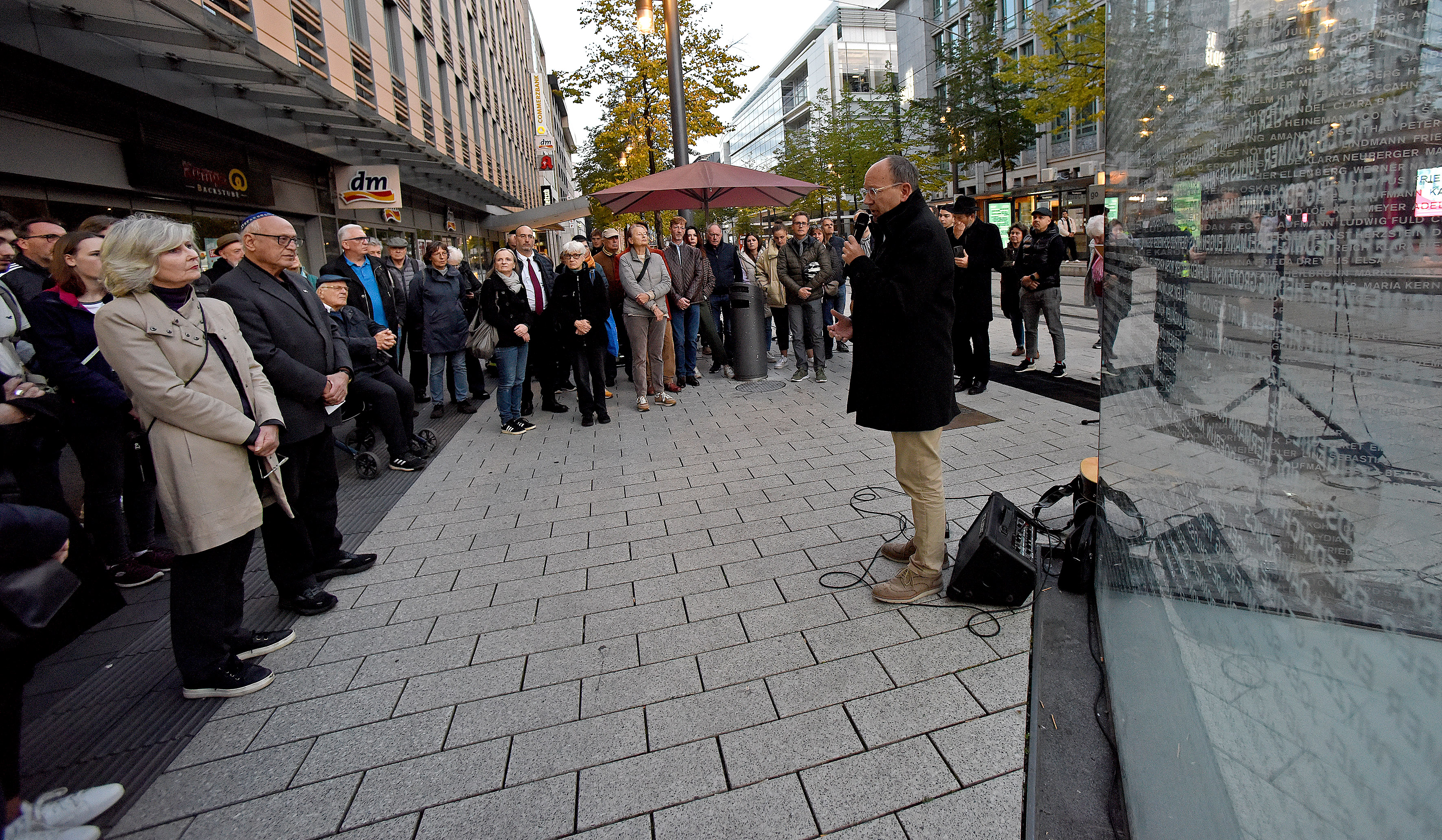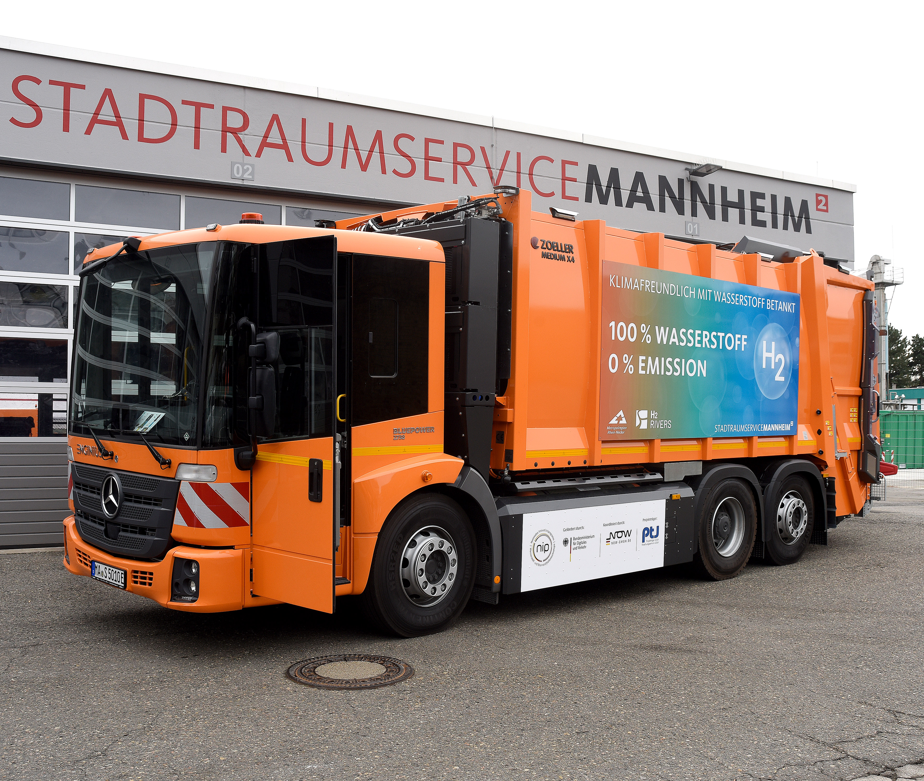 Oberbürgermeister Christian Specht (2. v. l.) freut sich gemeinsam mit den Eigenbetriebsleitern des Stadtraumservice Markus Roeingh und Alexandra Kriegel sowie mit Dr. Doris Wittneben (2. v. r.) von der Metropolregion Rhein-Neckar über das neue Wasserstofffahrzeug für die Abfallwirtschaft