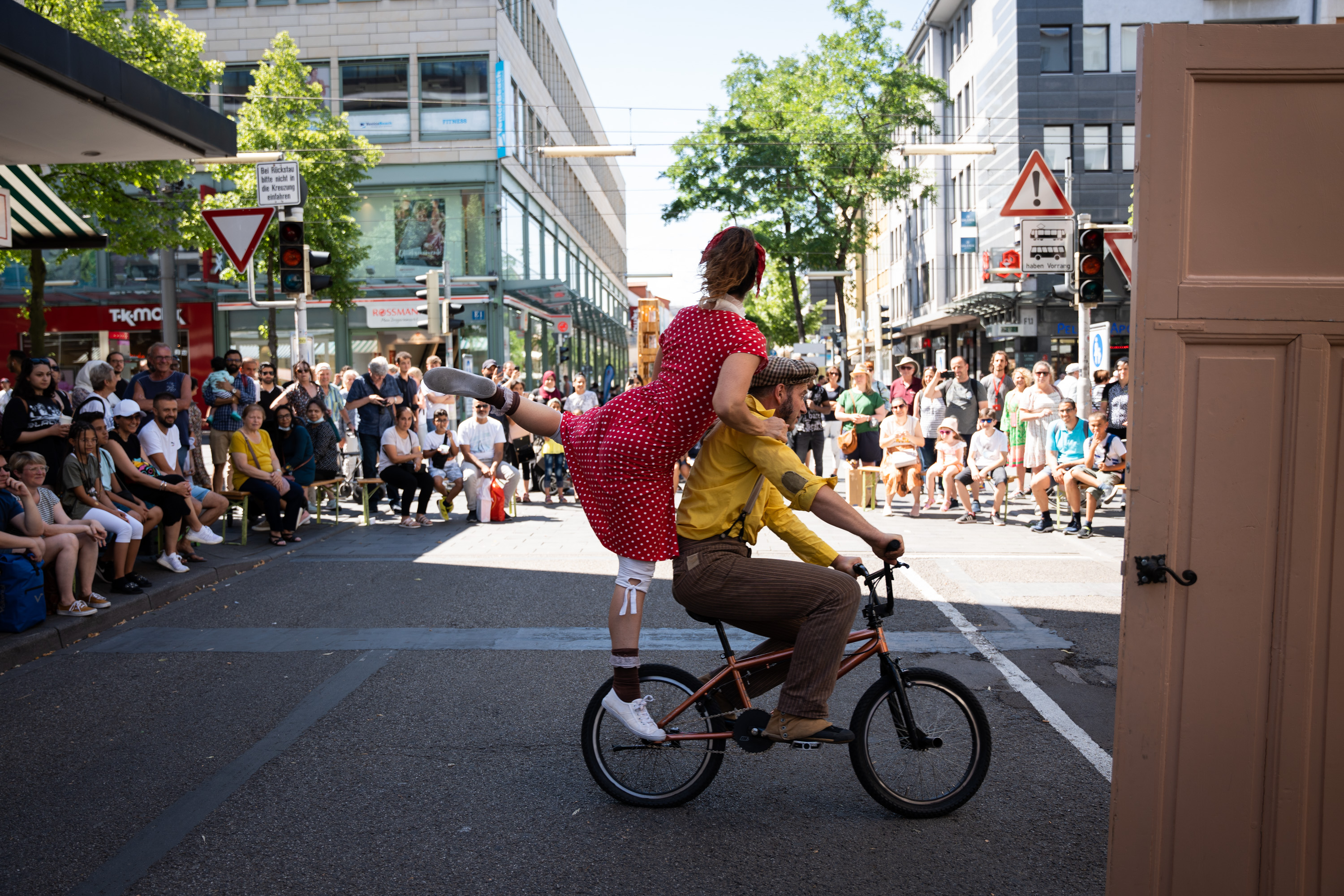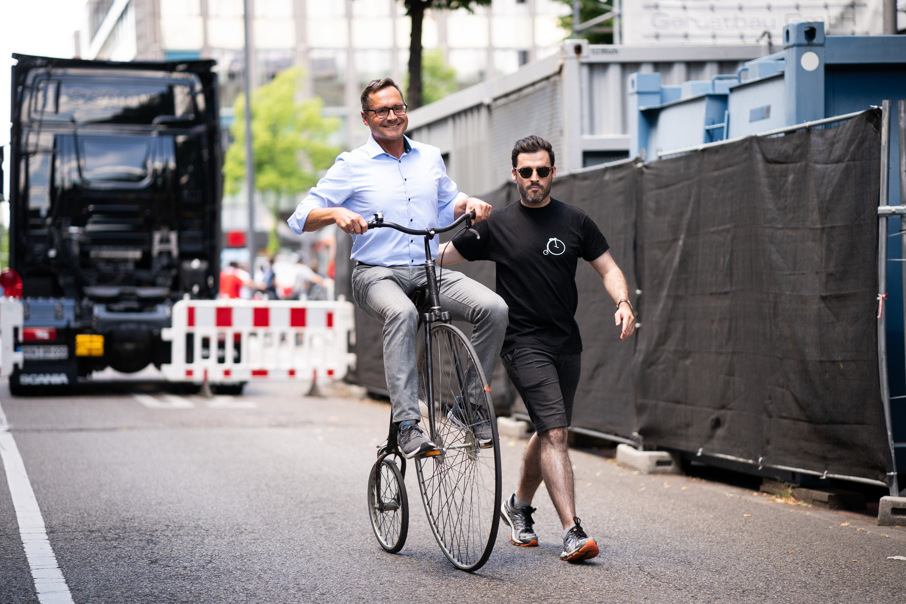 Bei "Monnem Bike - das Festival" konnten die Besucherinnen und Besucher sich an ungewöhnlichen Formen der Radkultur ausprobieren - so auch Bürgermeister Ralf Eisenhauer (links).