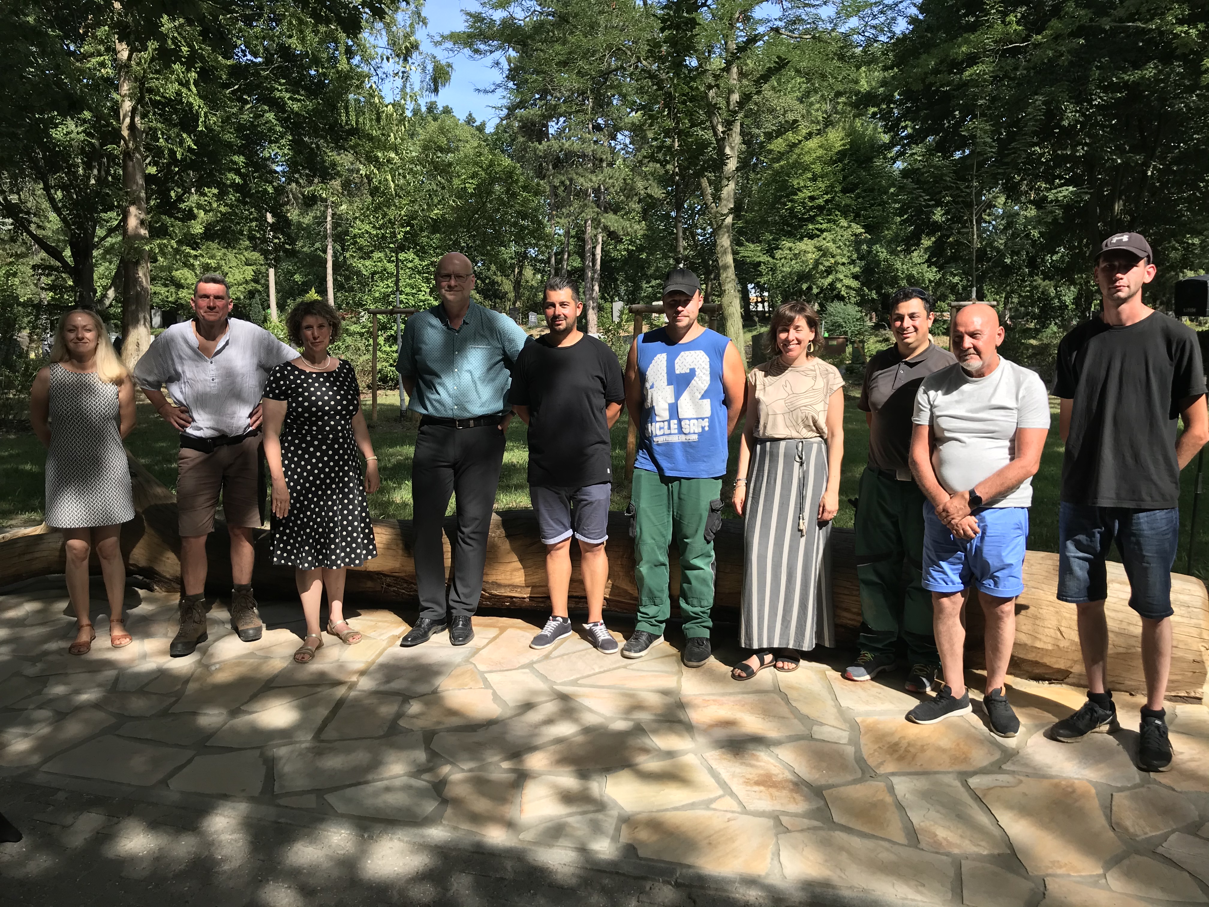 Bürgermeisterin Prof. Dr. Diana Pretzell (3. v. l.) und Eigenbetriebsleiter der Friedhöfe Andreas Adam (4. v. l.) mit den engagierten Mitarbeiterinnen und Mitarbeitern der Friedhöfe.