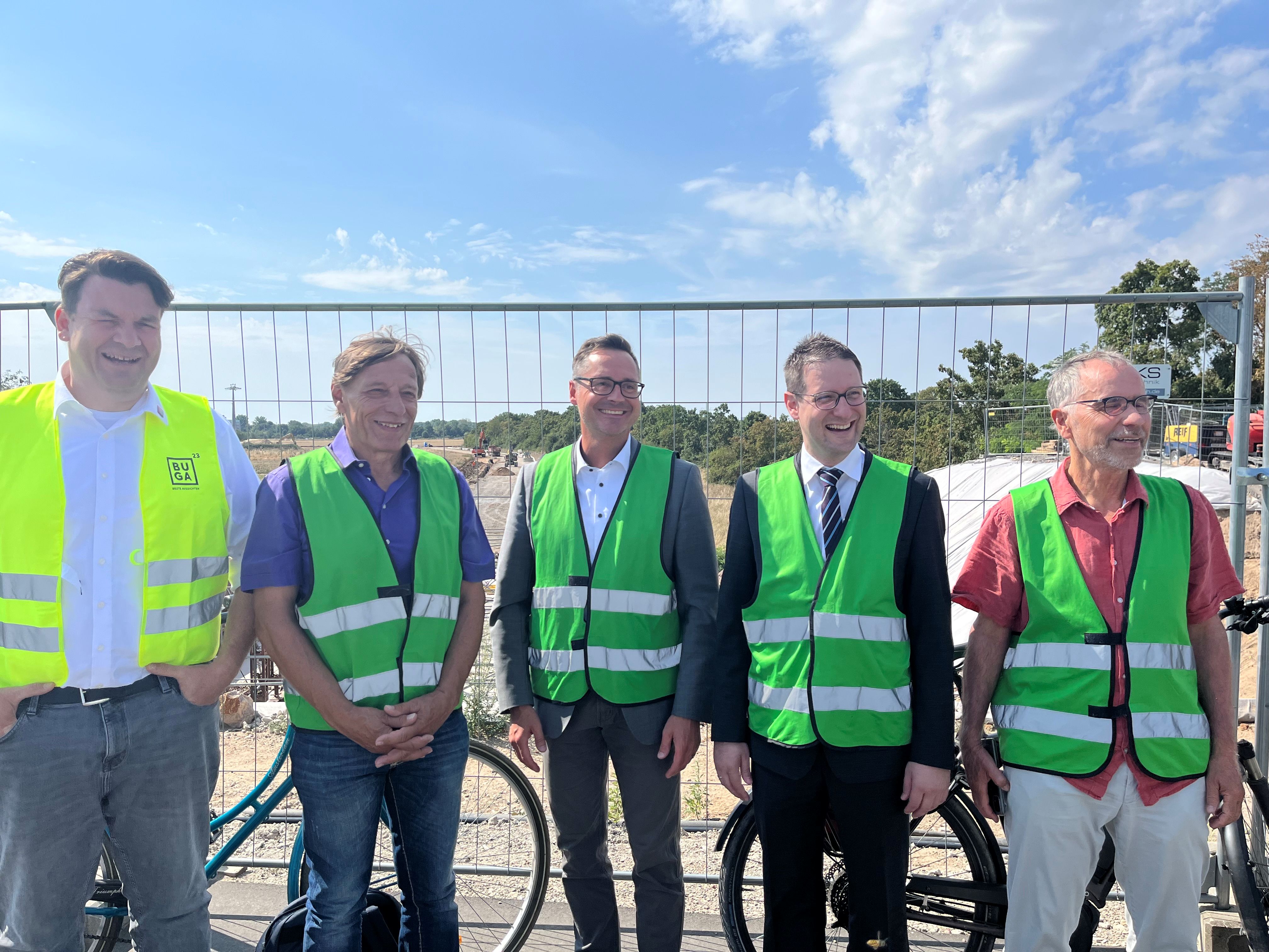 Freuten sich gemeinsam über den Fortschritt im Projekt Radschnellweg Mannheim-Viernheim-Weinheim: Dr. Christian Lerch, Leiter Parkanlage und Infrastruktur der Bundesgartenschau Mannheim 2023 gGmbH (links), Mannheims Baubürgermeister Ralf Eisenhauer (Mitte) und Weinheims Oberbürgermeister Manuel Just (2.v.r.).