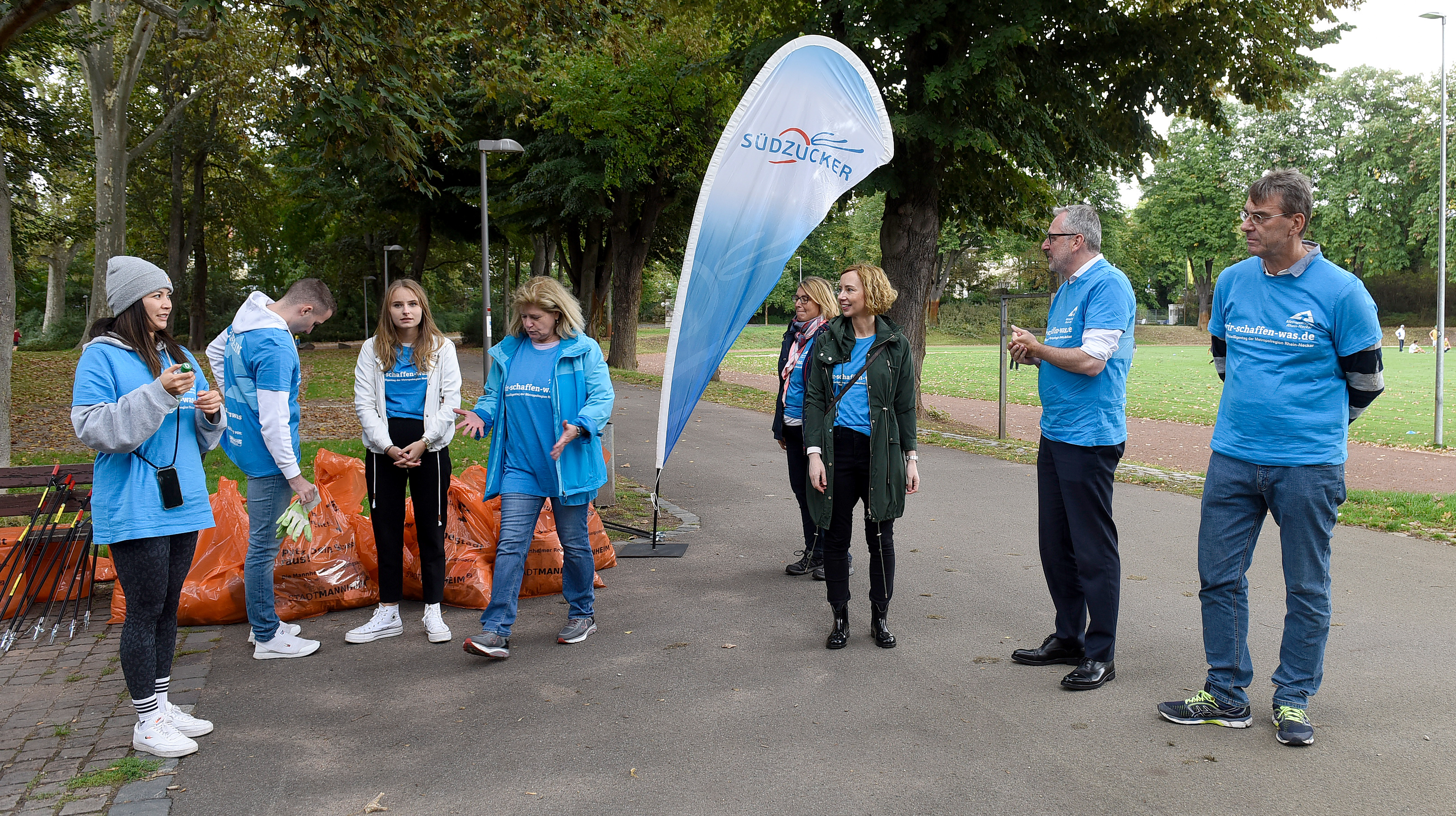 Unser Bild zeigt Oberbürgermeister Dr. Peter Kurz zu Besuch bei einer Reinigungsaktion am Unteren Luisenpark, die durch Mitarbeitende der Südzucker AG organisiert wurde.