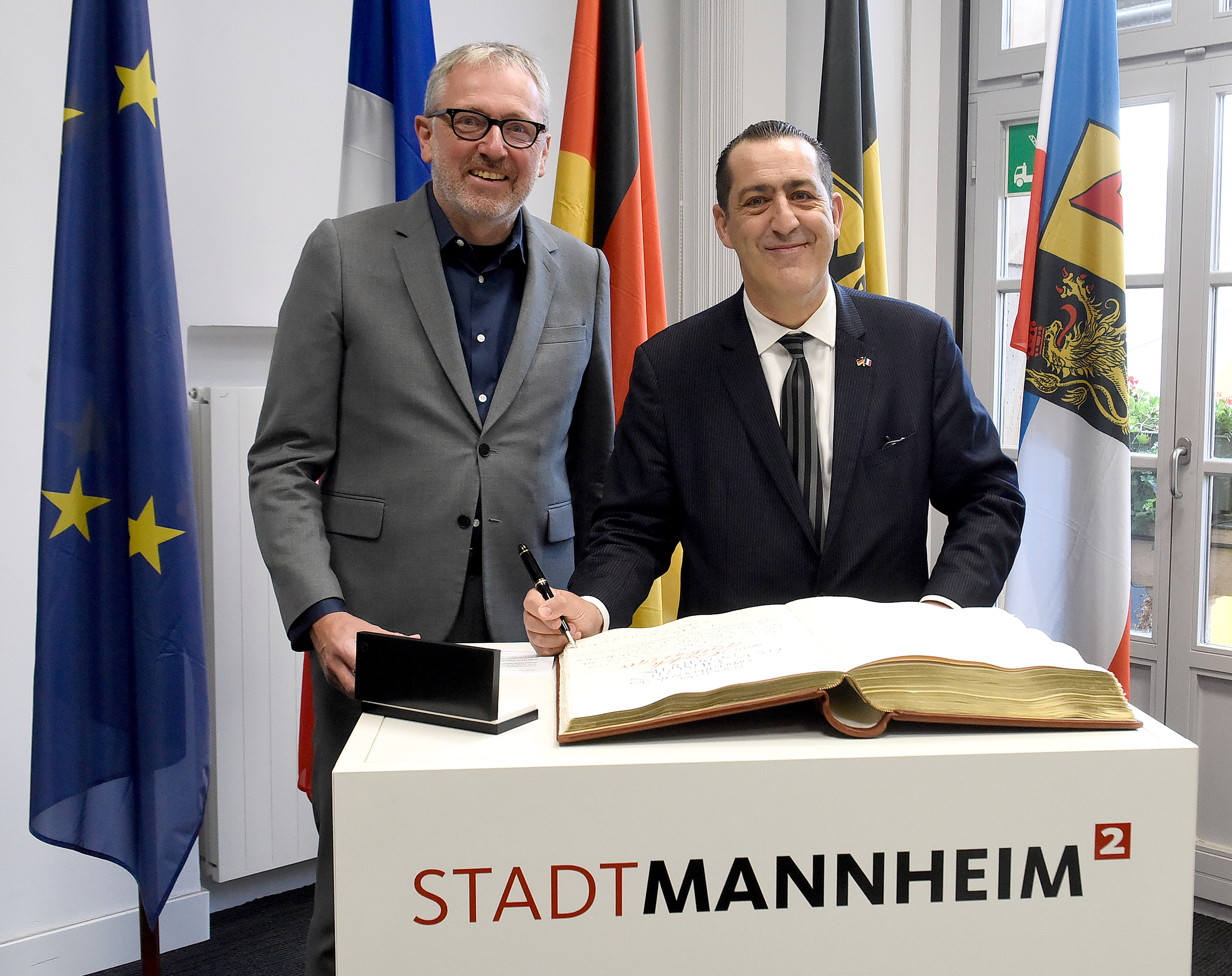 Unser Bild zeigt Oberbürgermeister Dr. Peter Kurz mit dem französischen Generalkonsul Gaël de Maisonneuve, der sich ins Goldene Buch der Stadt Mannheim eingetragen hat.