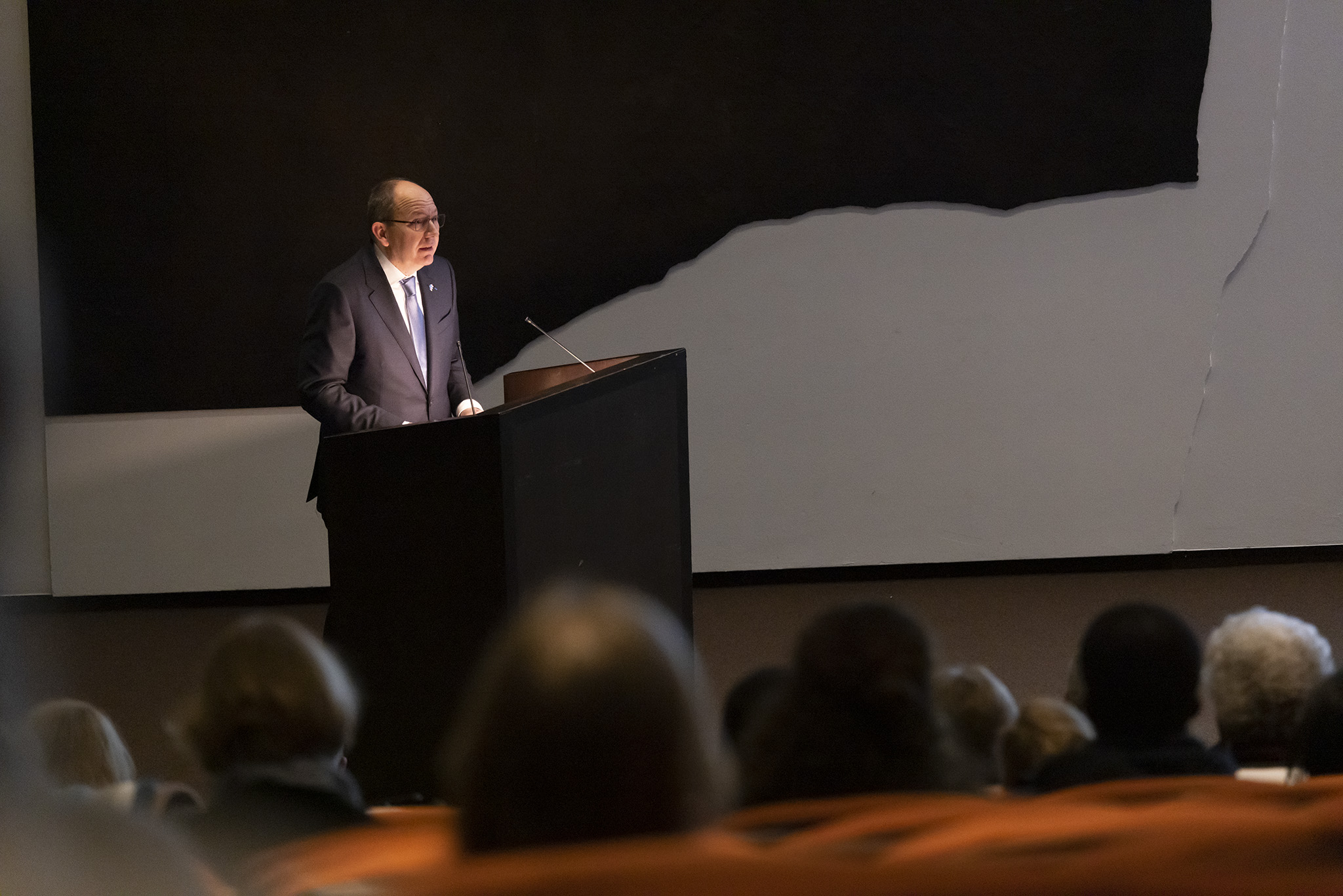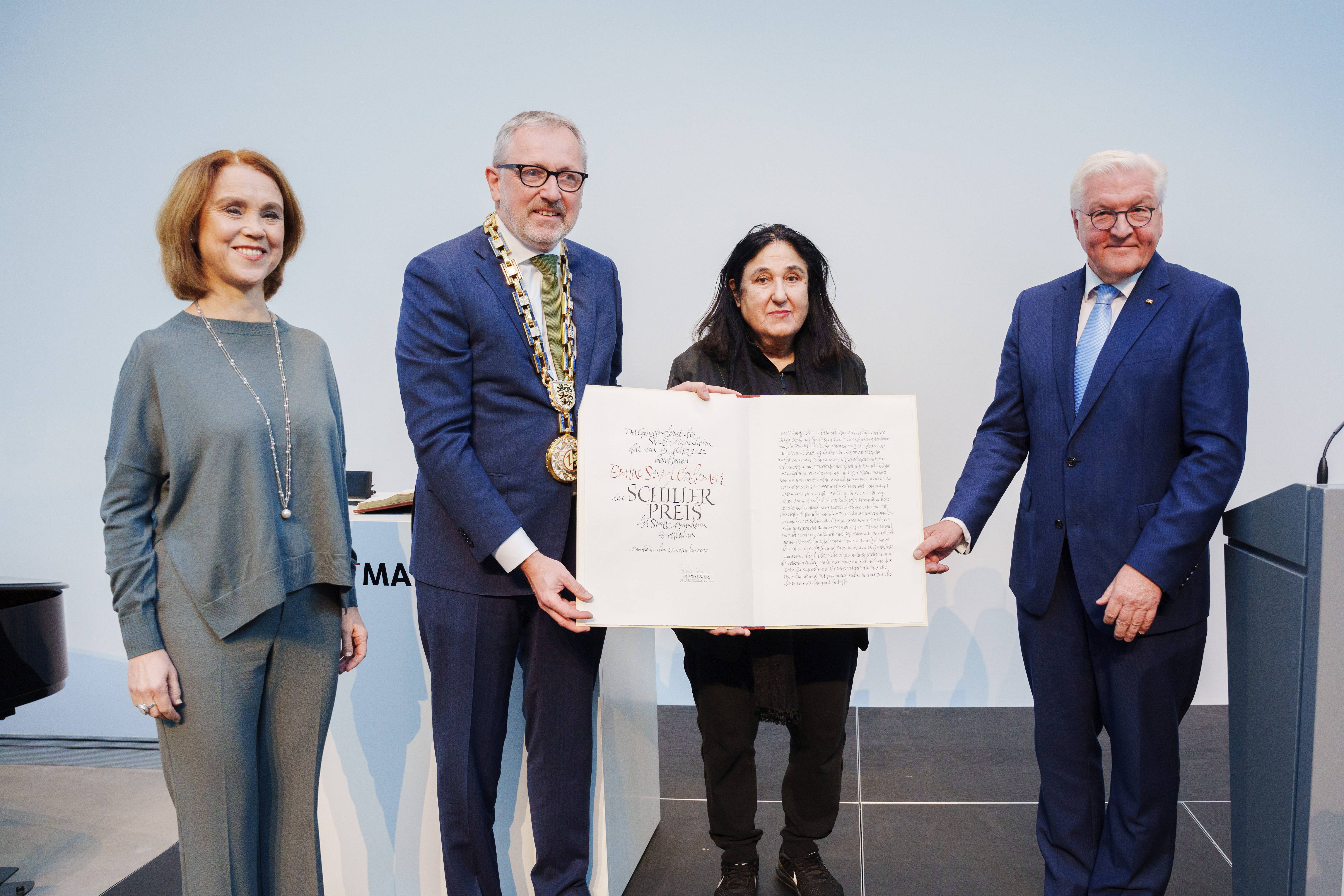 Petra Olschowski, baden-württembergische Ministerin für Wissenschaft, Forschung und Kunst, Oberbürgermeister Dr. Peter Kurz, Preisträgerin Emine Sevgi Özdamar und Laudator Bundespräsident Frank-Walter Steinmeier (v.l.n.r.) bei der Übergabe des Schillerpreises 2022 der Stadt Mannheim