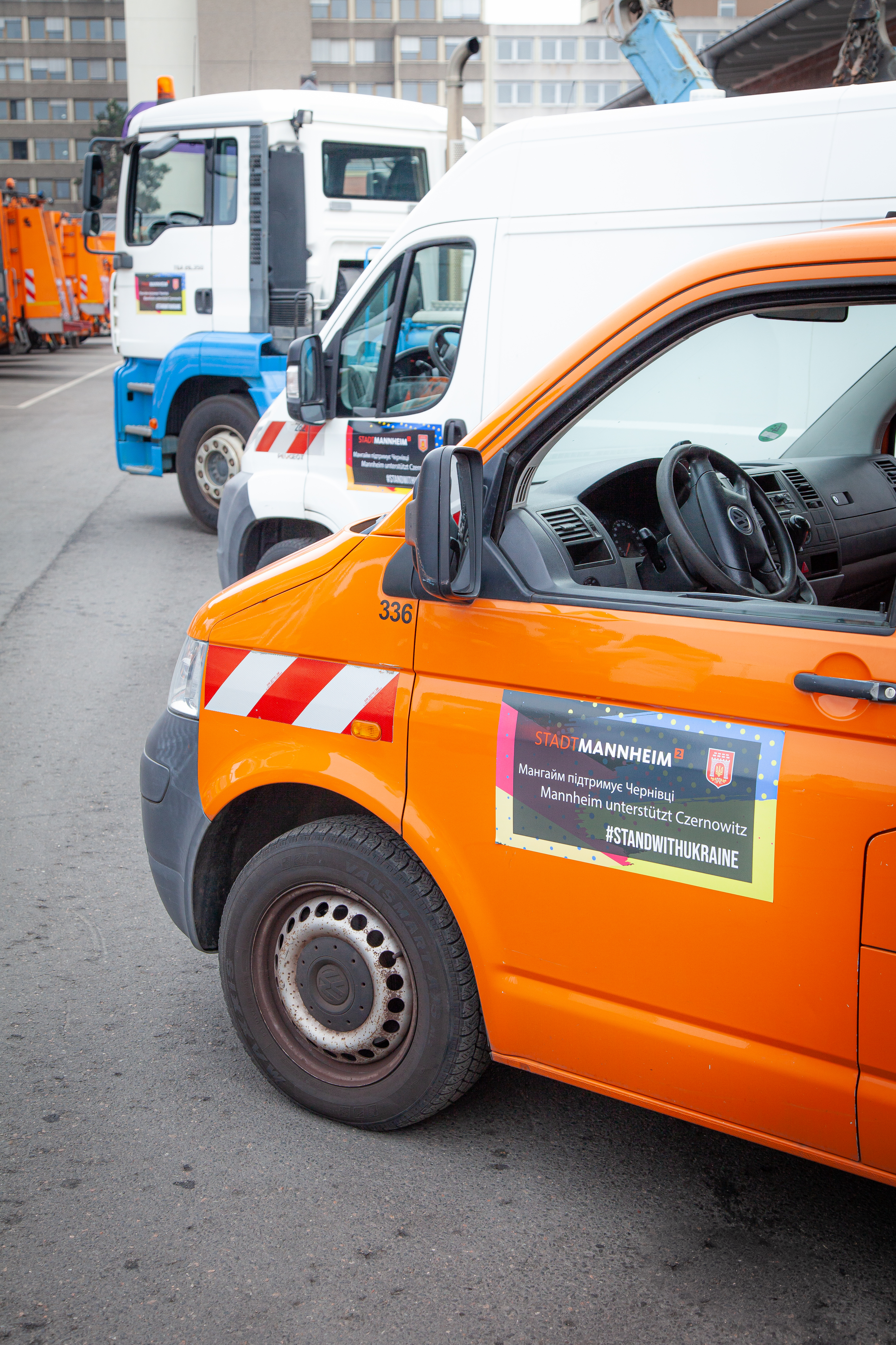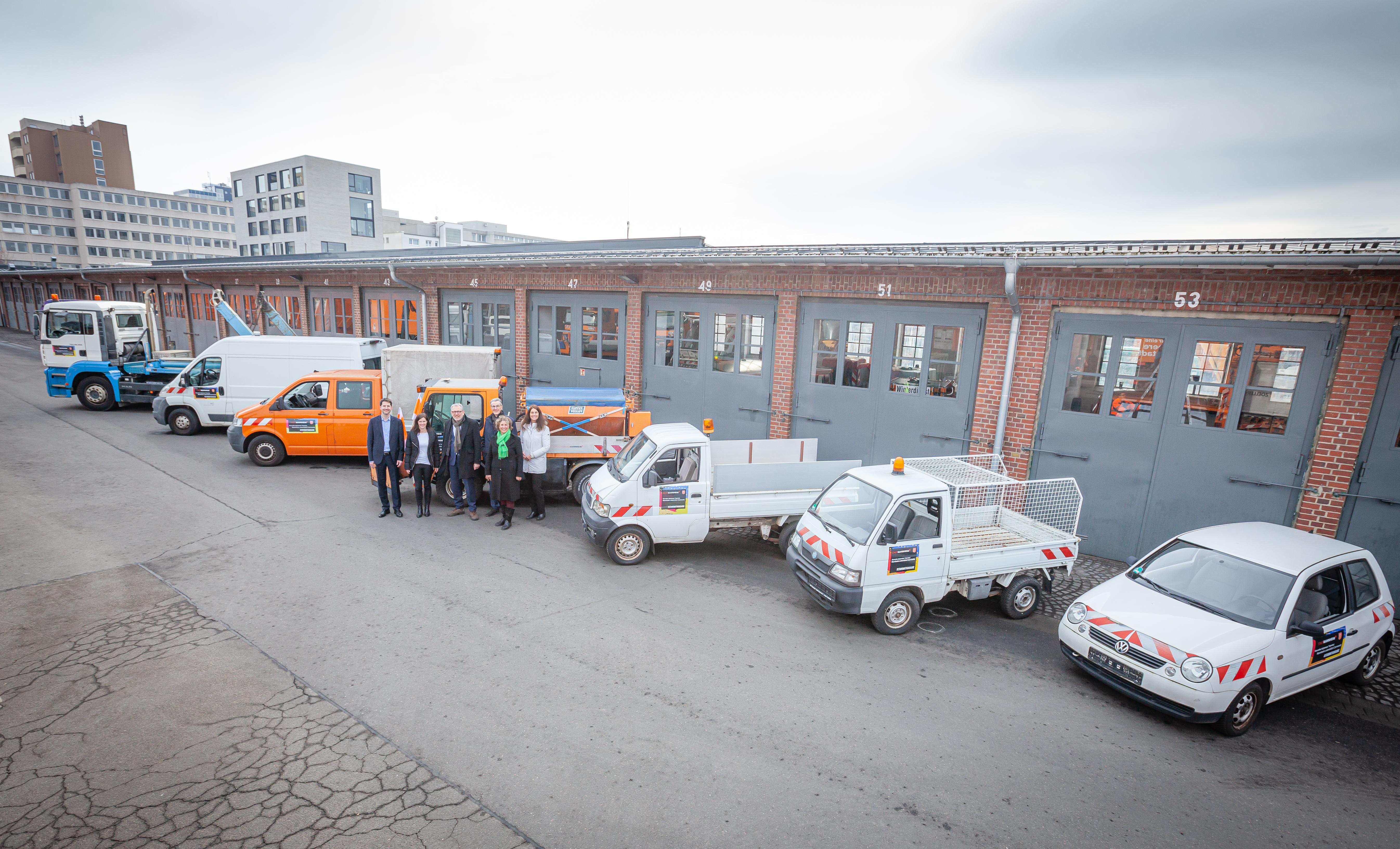 Kommunale Fahrzeuge für Czernowitz: Unser Foto zeigt (von links) Fachbereichsleitung David Linse, Stefanie Miller, (beide Fachbereich Internationales, Europa und Protokoll), Oberbürgermeister Dr. Peter Kurz, Alexander Mauritz (Eigenbetriebsleitung Stadtentwässerung), Bürgermeisterin Prof. Dr. Diana Prezell und Alexandra Kriegel (Mitglied der Eigenbetriebsleitung Stadtraumservice).