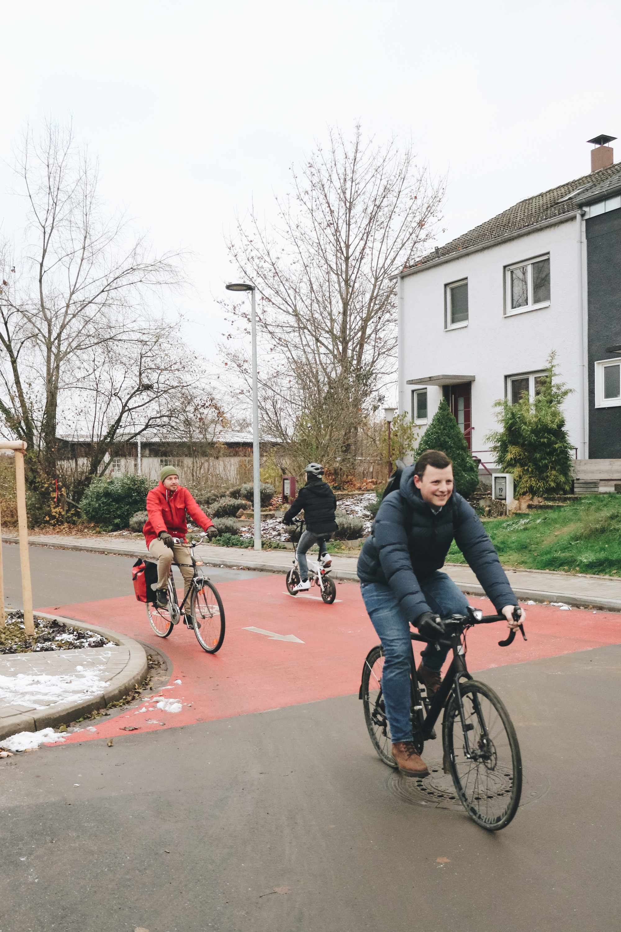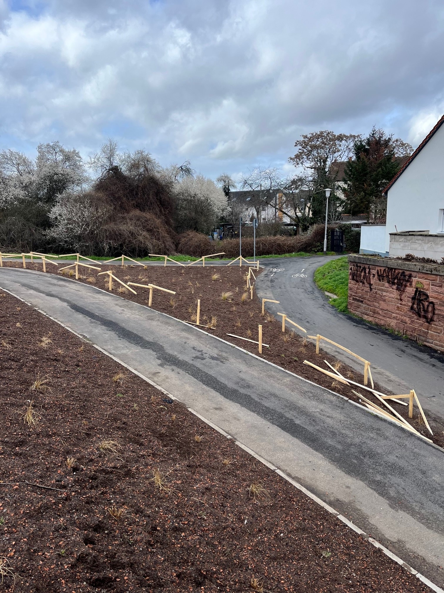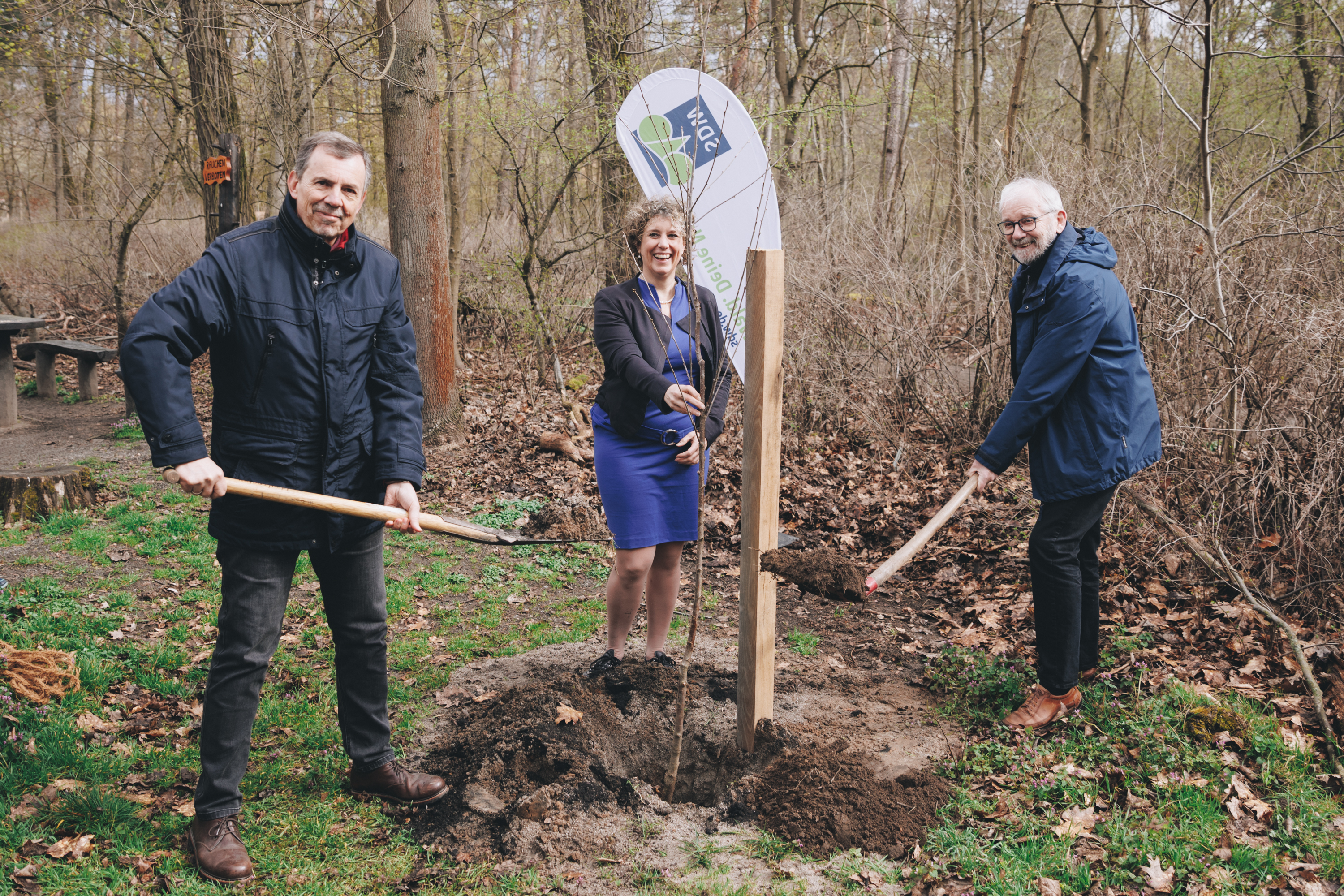 Sebastian Eick (1. Vorsitzender SDW), Bürgermeisterin Prof. Dr. Diana Pretzell, Wolfgang Katzmarek (1. Vorsitzender Freunde des Karlsterns) beim Pflanzen einer Vogelkirsche (v.l.n.r.)