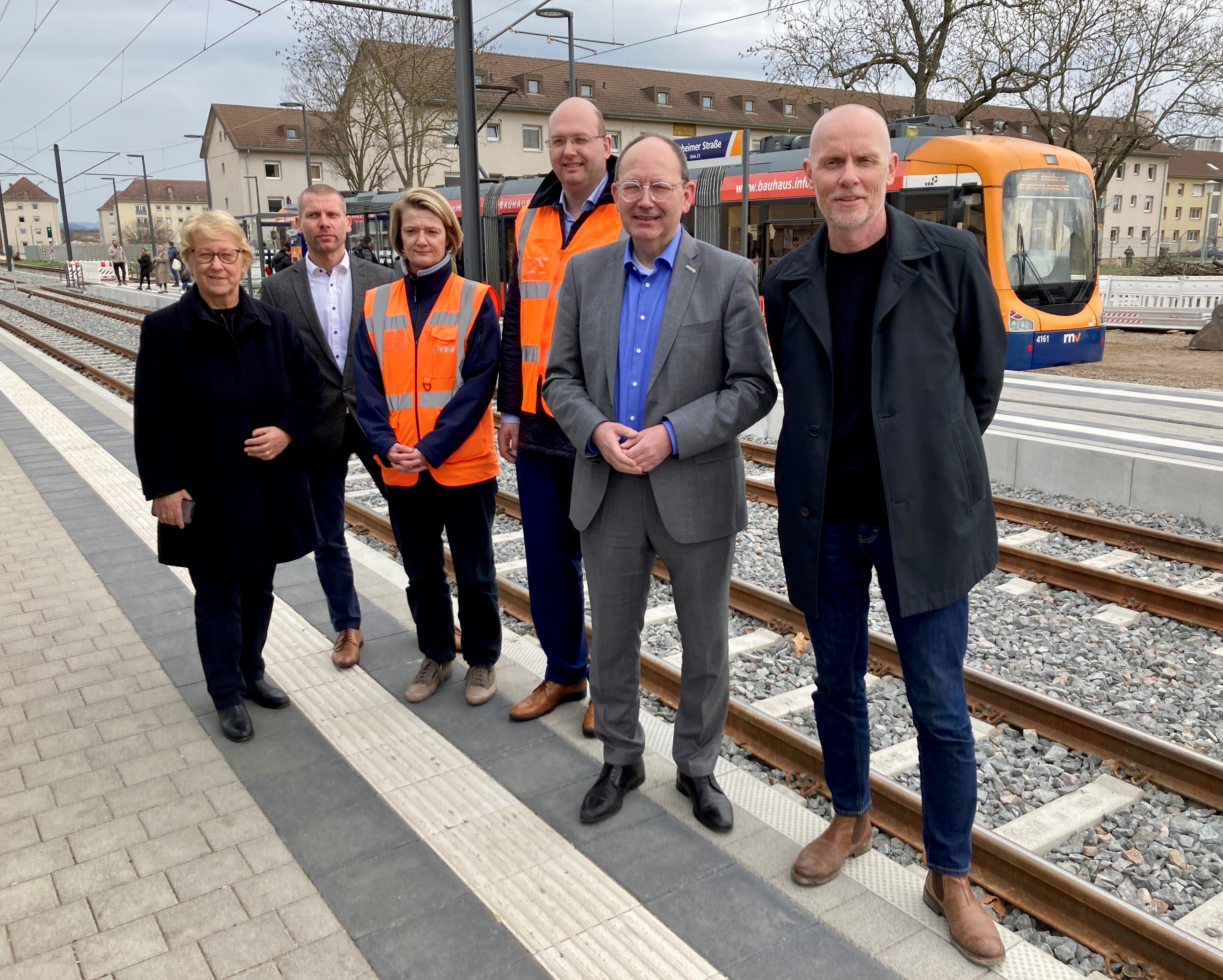 v.l.n.r.: Dr. Birgit Reinemund (Gemeinderatsmitglied), Frank Dommasch (Leiter des Bereichs Infrastruktur der rnv), Andrea Böttger (Projektleiterin der rnv), Marcus Geithe (Geschäftsführer der MV Mannheimer Verkehr GmbH), Christian Specht (Erster Bürgermeister und ÖPNV-Dezernent), Achim Judt (Geschäftsführer der MWSP)