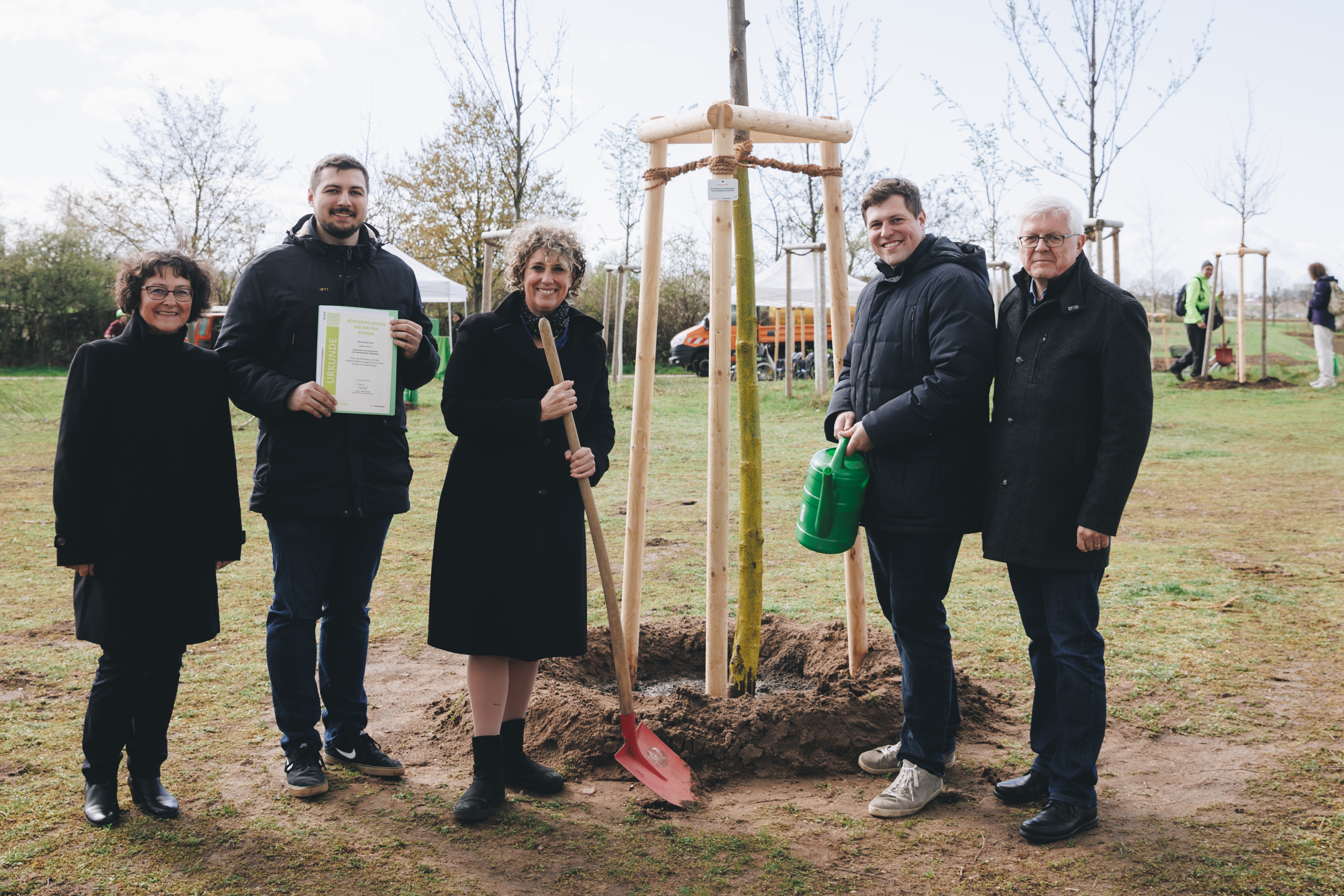 Bürgermeisterin Prof. Dr. Diana Pretzell mit Familie Krassowka an deren frisch gepflanzter Purpurerle. Von links nach rechts: Susanne Krassowka, Konstantin Krassowka, Frau Pretzell, Johannes Krassowka, Rainer Krassowka.