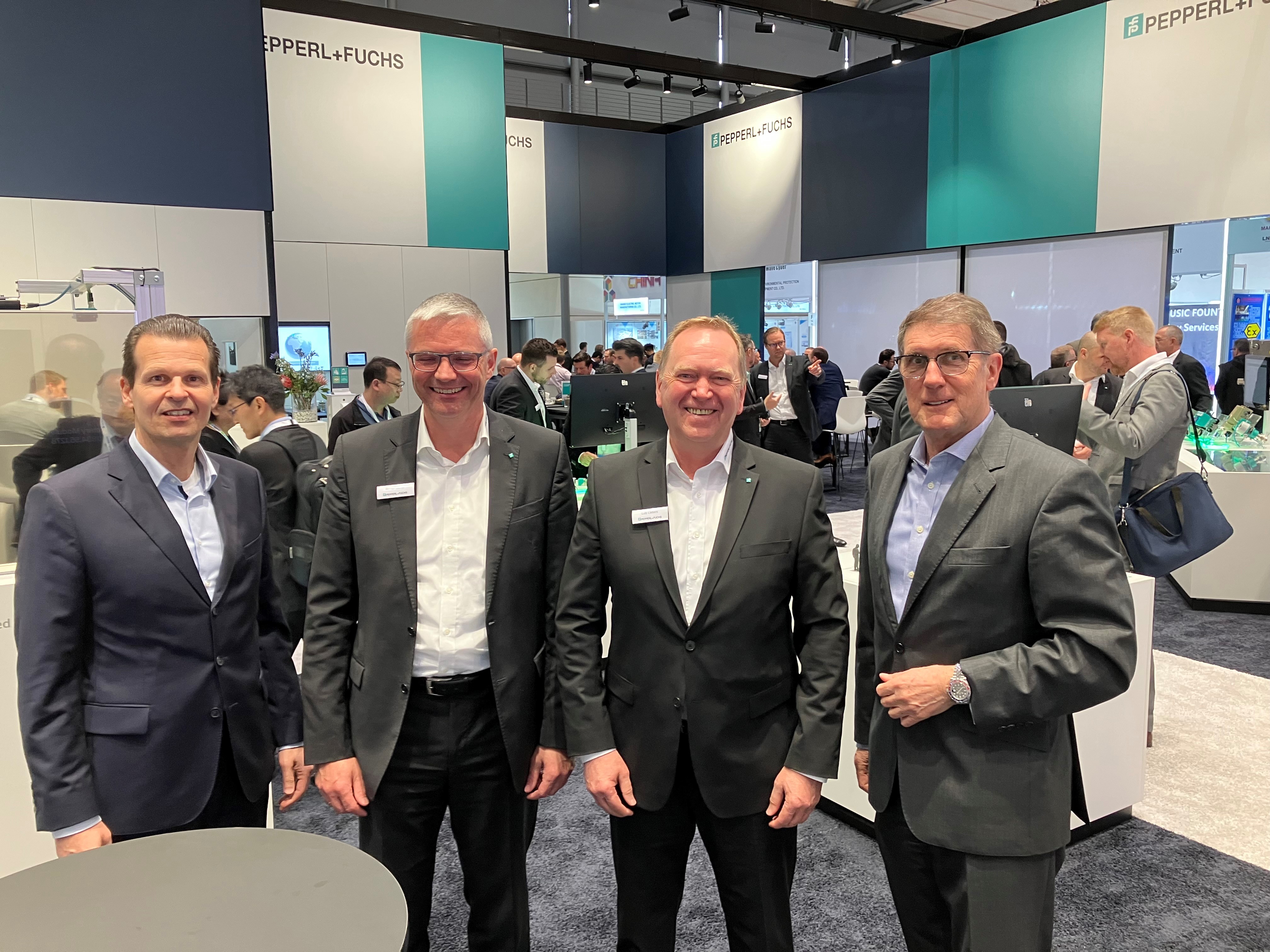Dr. Elmar Bourdon (Key Account Wirtschaftsförderung), Reiner Müller und Lutz Liebers (beide Pepperl + Fuchs), Wirtschaftsbürgermeister Michael Grötsch