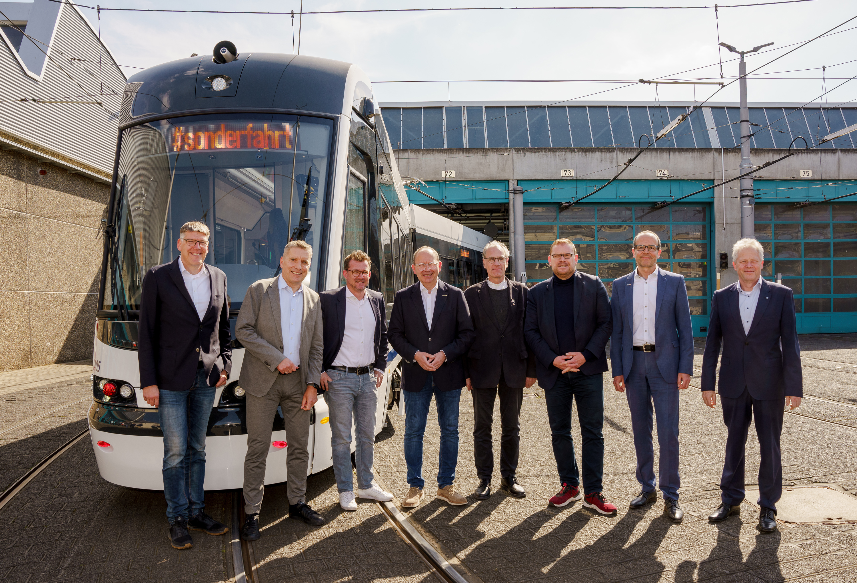 v.l.n.r.: Frank Ehemann, Bereichsleiter Fahrzeuge und Projektleiter RNT 2020 bei der rnv, Martin in der Beek, Technischer Geschäftsführer der rnv, Raoul Schmidt-Lamontain, Bürgermeister für Klimaschutz, Umwelt und Mobilität der Stadt Heidelberg, Christian Specht, Erster Bürgermeister und ÖPNV-Dezernent der Stadt Mannheim, Alexander Thewalt, Bau- und Umweltdezernent der Stadt Ludwigshafen, Christian Schreider, Mitglied des Deutschen Bundestages, Christian Volz, Kaufmännischer Geschäftsführer der rnv und Dr. Kay Biebler, Senior Project Director bei Skoda Group, bei einer RNT-Pressefahrt am Mittwoch, 3. Mai.