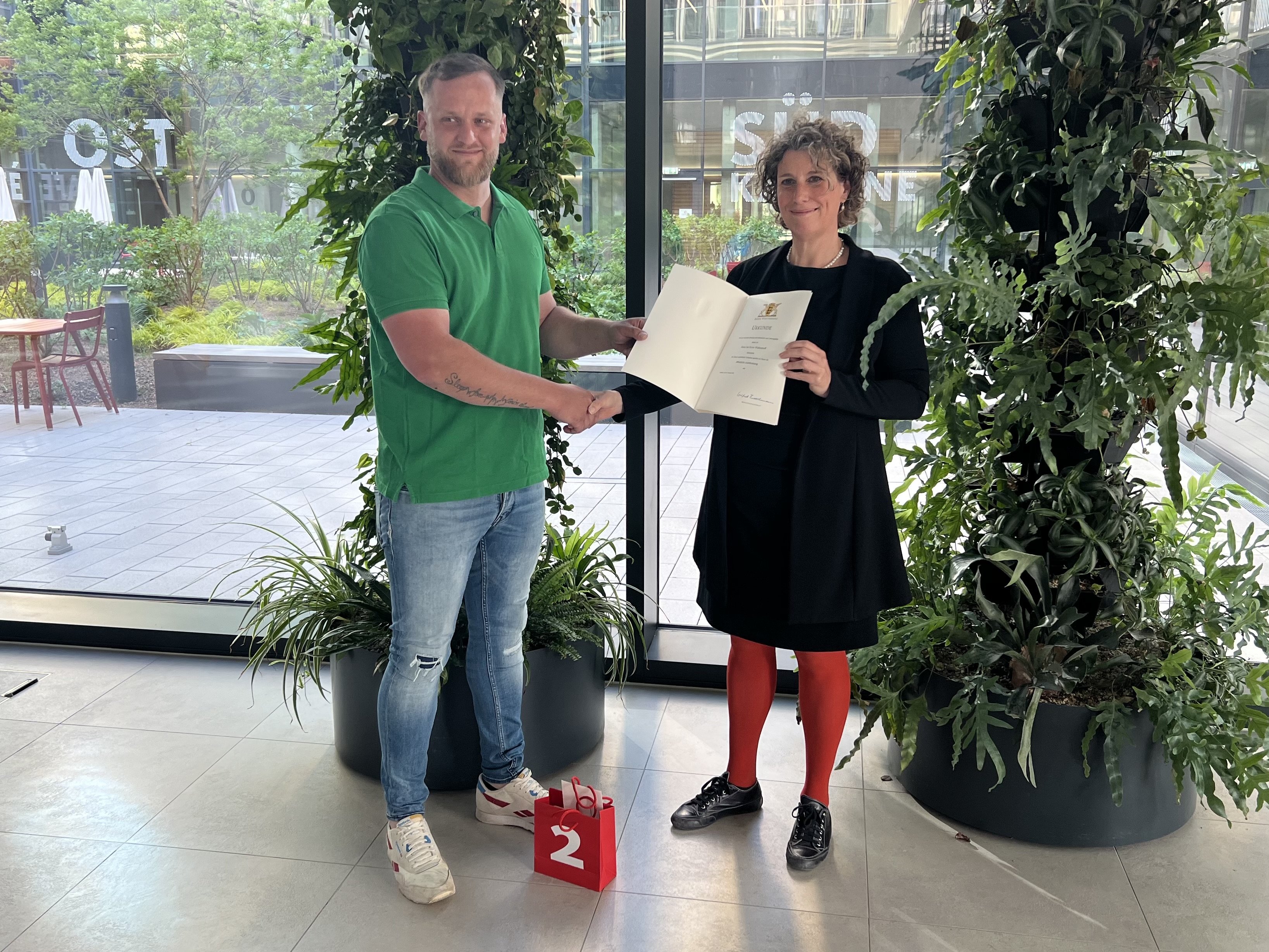 Bürgermeisterin Prof. Dr. Diana Pretzell spricht Jan Wallendorff im Namen von Ministerpräsident Winfried Kretschmann eine öffentliche Anerkennung für die versuchte Rettung eines Menschen in Lebensgefahr aus und übergab die zugehörige Urkunde.