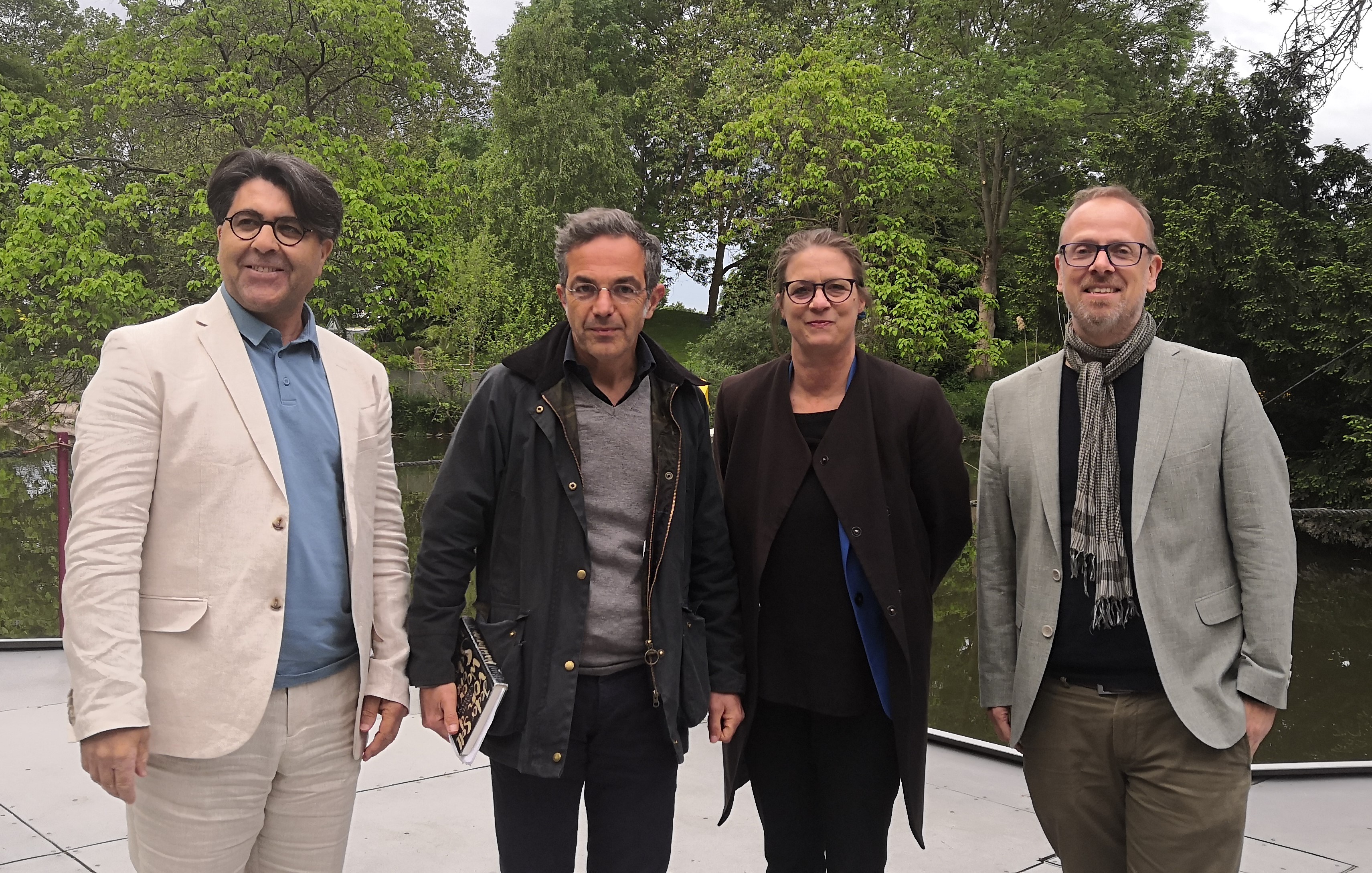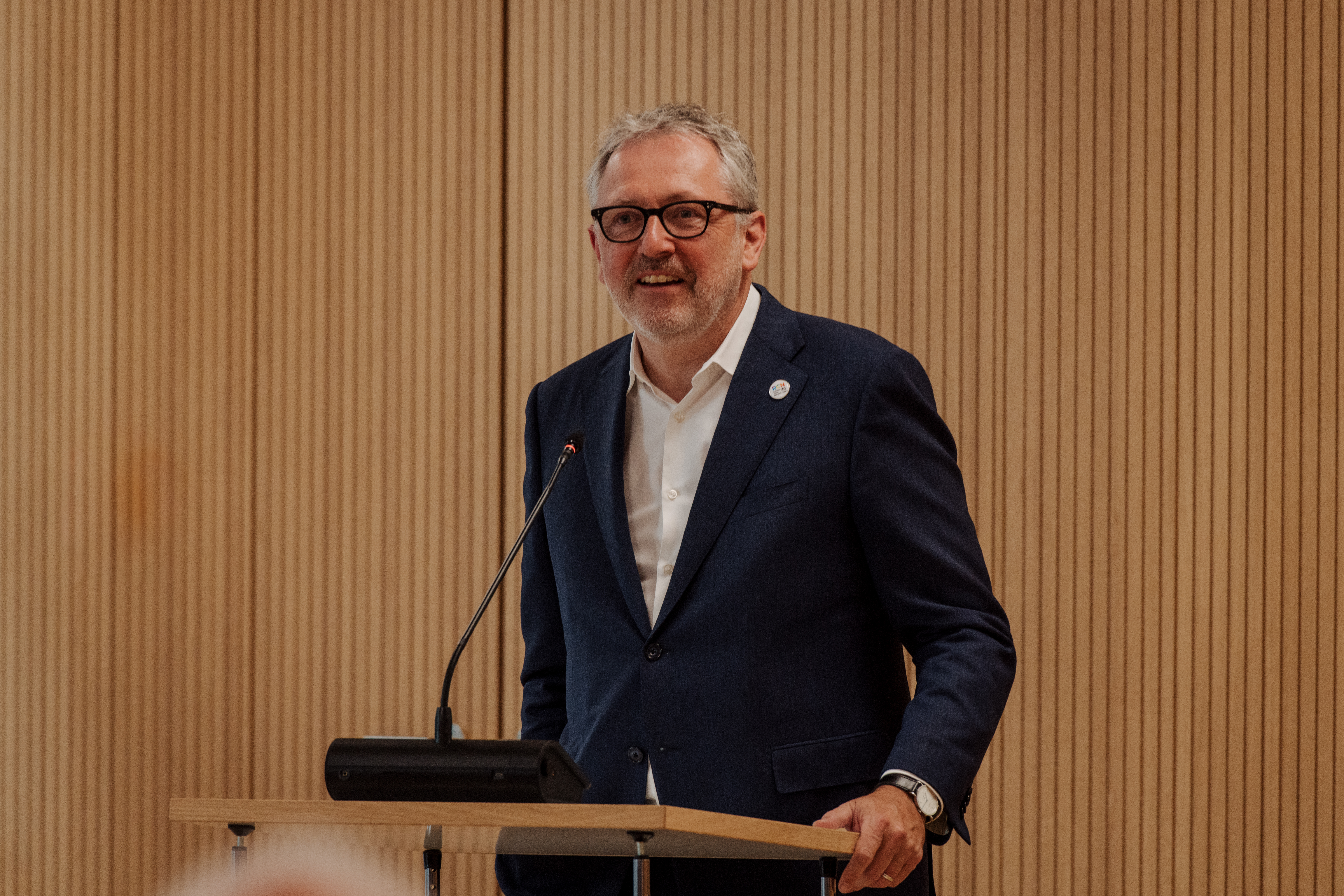 Oberbürgermeister Dr. Peter Kurz bei der Podiumsdiskussion mit Staatssekretär im Ministerium für Umwelt, Klima und Energiewirtschaft Baden-Württemberg, Dr. Andre Baumann, dem stellvertretenden Bürgermeister für Mobilität, städtische Logistik und öffentlichen Raum der Stadt Lyon, Valentin Lungenstrass, und der stellvertretenden Leiterin der EU-Städte-Mission in der Europäischen Kommission, Rosalinde van der Vlies.