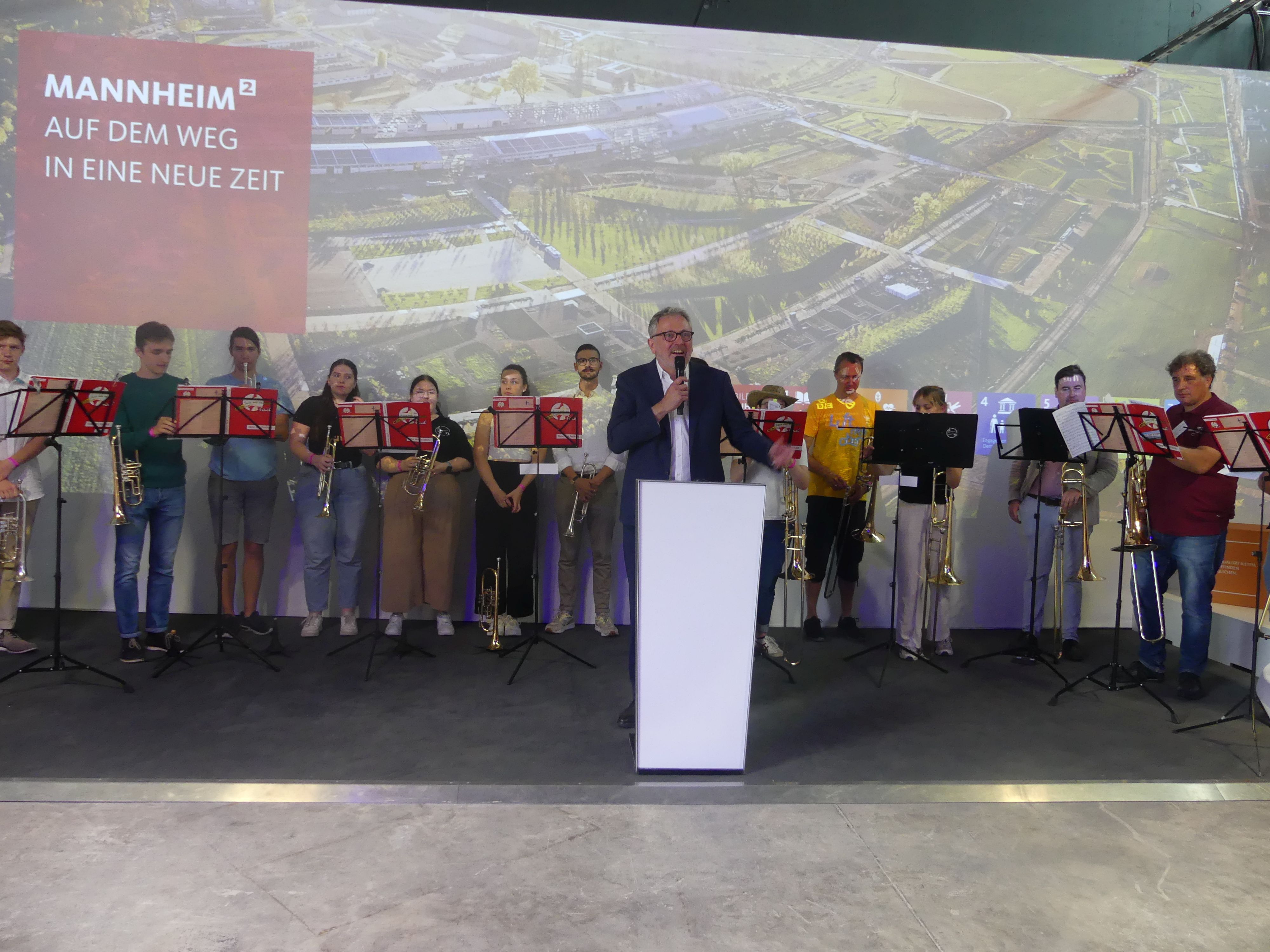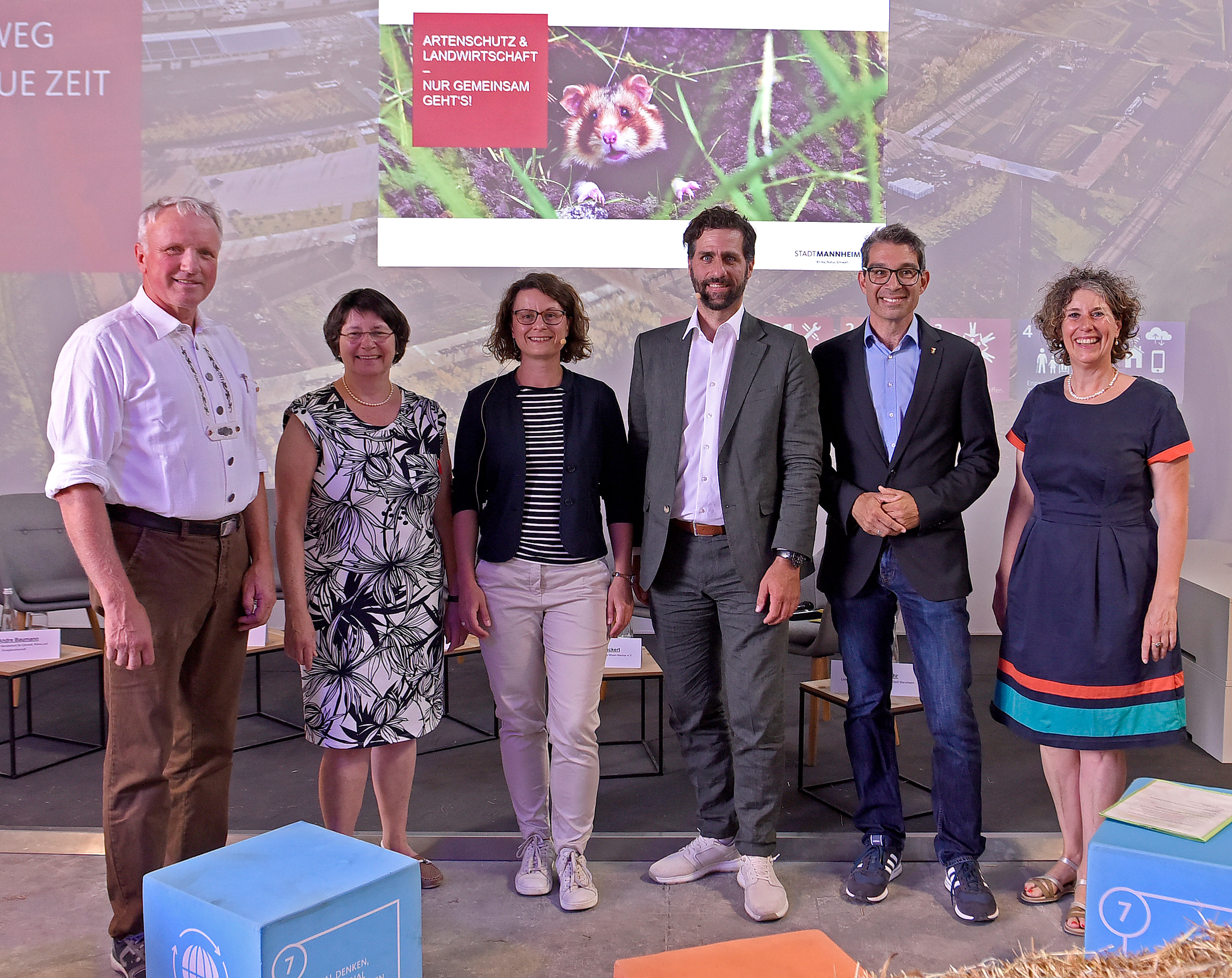 Wolfgang Guckert, Vorsitzender des Kreisbauernverbandes Rhein-Neckar e.V., Nicole Gross, Leiterin des Amtes für Landwirtschaft und Naturschutz Rhein-Neckar-Kreis, Dr. Sabine Mahr, Leiterin der Unteren Naturschutzbehörde der Stadt Mannheim, Michael Eick, Leiter der Akademie für Natur- und Umweltschutz des Ministeriums für Umwelt, Klima und Energiewirtschaft, Dr. Andre Baumann, Staatssekretär des Ministeriums für Umwelt, Klima und Energiewirtschaft und Bürgermeisterin Prof. Dr. Diana Pretzell.