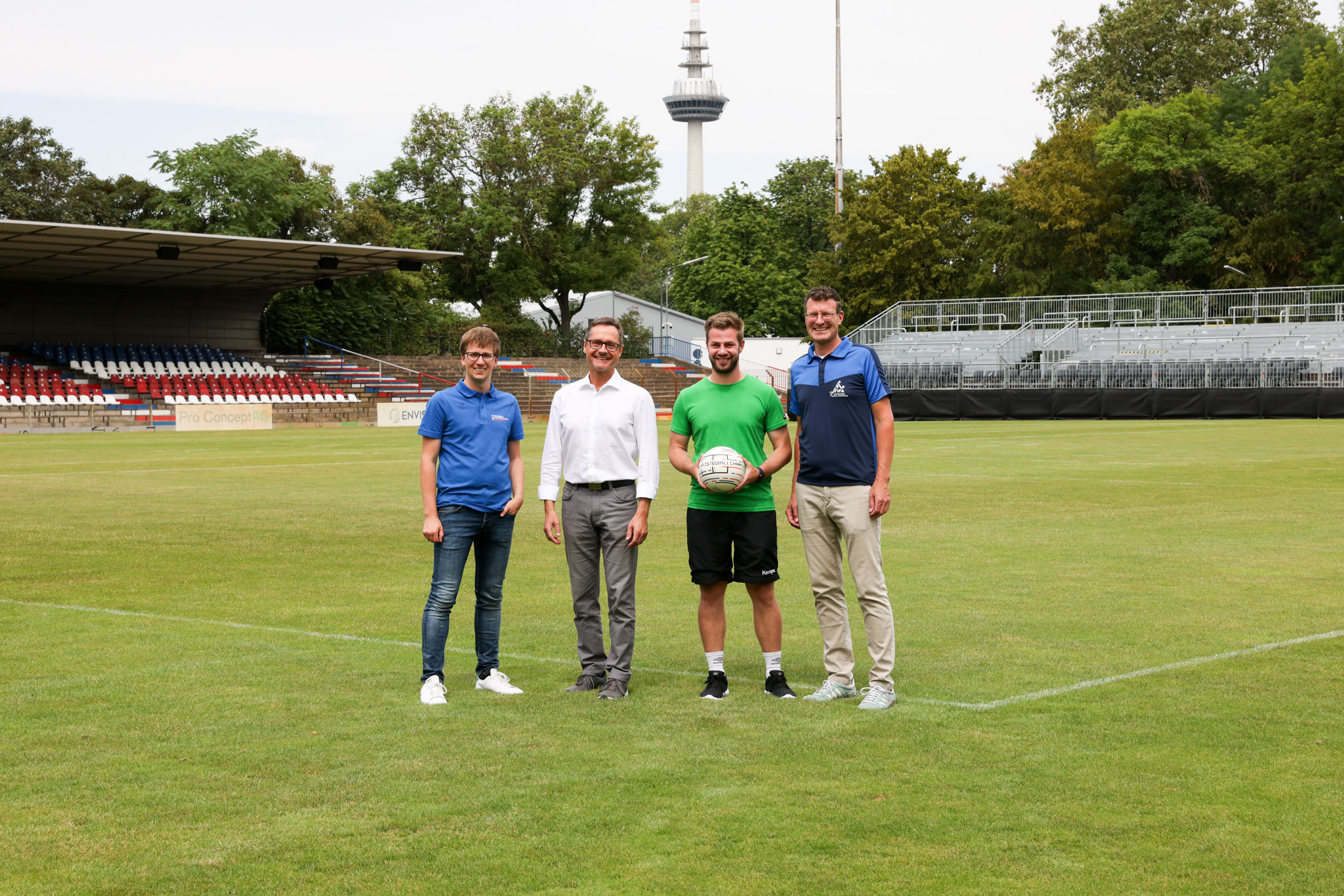 Freuen sich gemeinsam auf die Faustball-Weltmeisterschaft, die unter anderem im Rhein-Neckar-Stadion ausgetragen wird (von links): WM-Geschäftsführer Sönke Spille, Mannheims Sportbürgermeister Ralf Eisenhauer, Nationalspieler Jonas Schröter und IFA-Präsident Jörn Verleger.