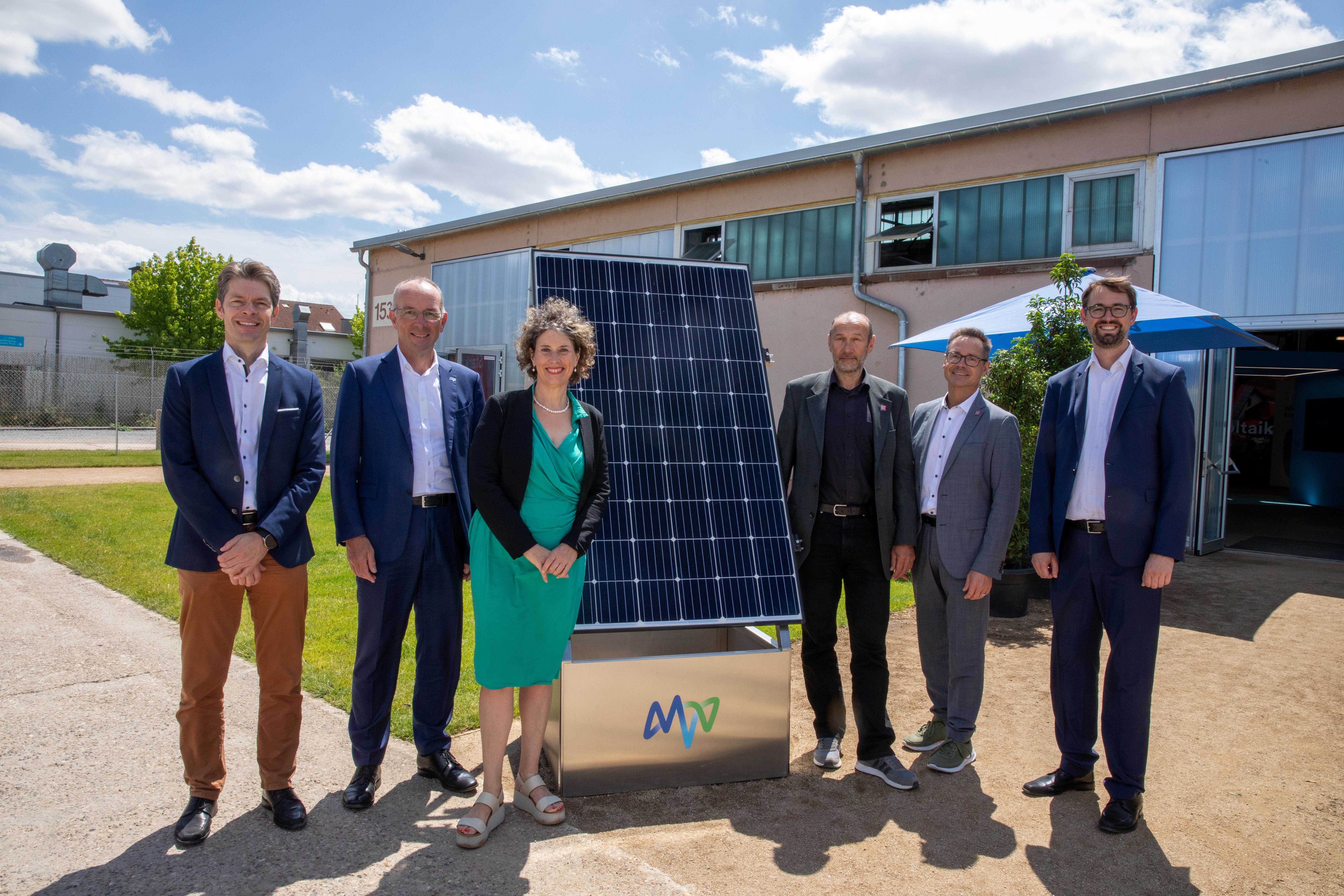 Schieben gemeinsam die Photovoltaik-Offensive in Mannheim an (von links): Dr. Robert Thomann (sMArt City GmbH Mannheim), Ralf Klöpfer (MVV), Bürgermeisterin Prof. Dr. Diana Pretzell, Michael Schnellbach (BUGA 23), Bürgermeister Ralf Eisenhauer, Johannes Müller (sMArt City GmbH Mannheim). Nicht auf dem Foto: Christian Specht, Erster Bürgermeister und designierter Oberbürgermeister der Stadt Mannheim.