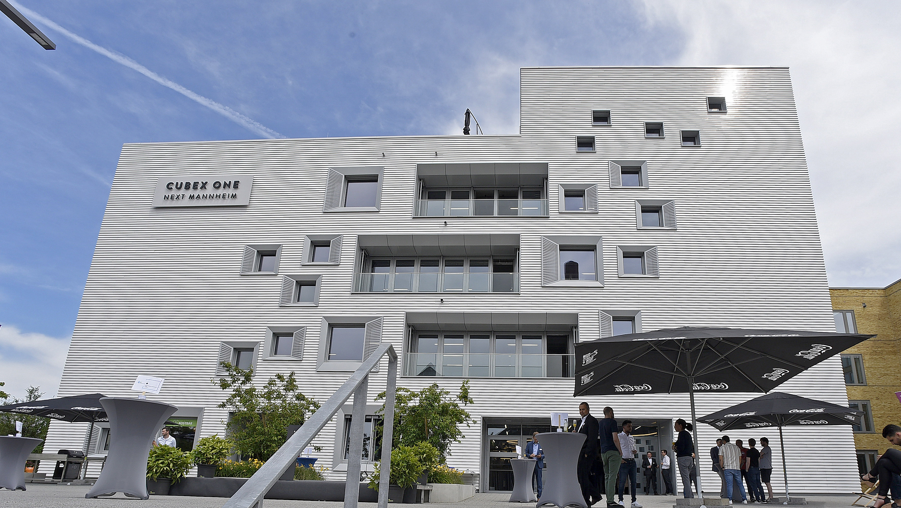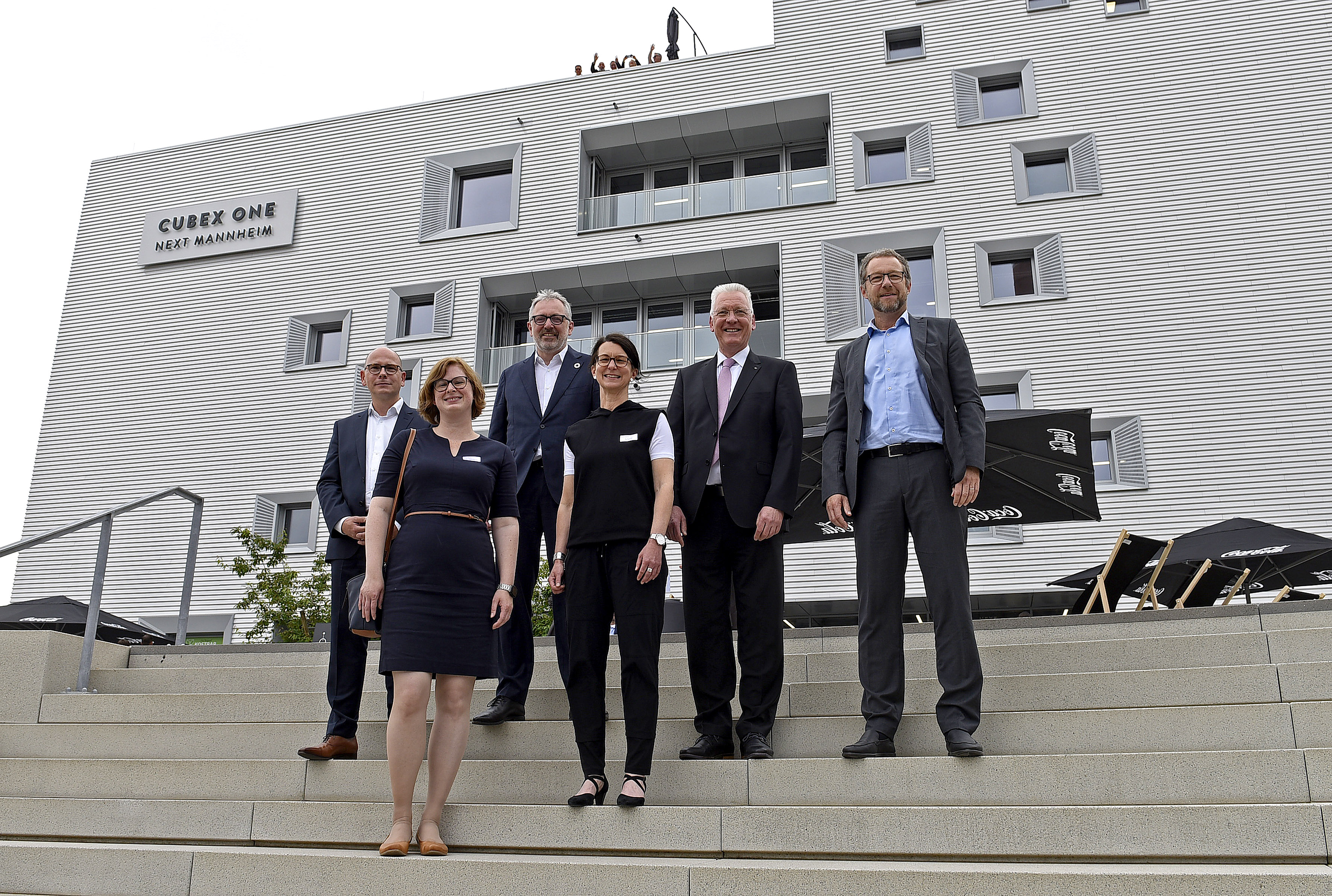 Dr. Arndt Oschmann (Referatsleiter Steuerung EFRE, Ministerium für Wirtschaft, Arbeit und Tourismus Baden-Württemberg), Prof. Dr. Hans-Jürgen Hennes (Medizinischer Geschäftsführer des Universitätsklinikums Mannheim), Oberbürgermeister Dr. Peter Kurz, Dr. Claudia Rabe (NEXT MANNHEIM, Deputy Managing Director / Head of Tech, Startup-Support, International), Prof. Dr. Matthias Weidemüller (Prorektor für Innovation und Transfer der Universität Heidelberg), Katharina Fox (Clustermanagerin Gesundheitswirtschaft im Fachbereich für Wirtschafts- und Strukturförderung)