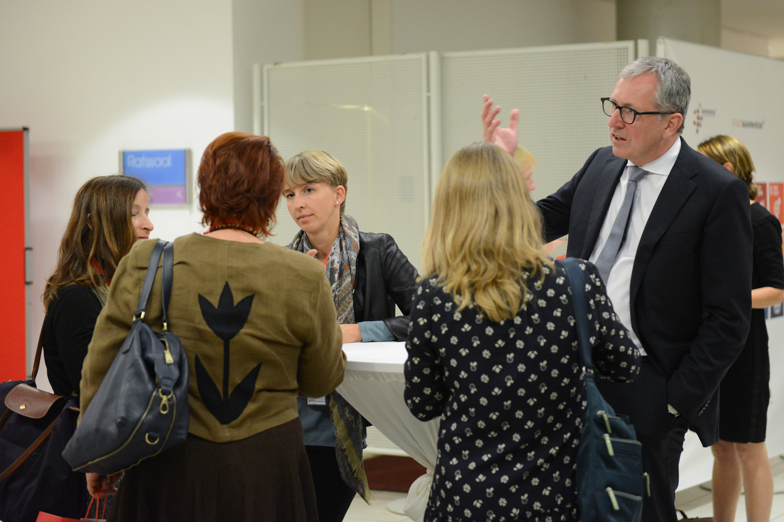 Seine Exzellenz Willem van de Voorde, Botschafter des Königreichs Belgien in Deutschland, trägt sich im Beisein der Bürgermeister Lothar Quast und Christian Specht, der Stadträte Dirk Grunert und Professor Achim Weizel, des Oberbürgermeisters Dr. Peter Kurz sowie des Stadtrats Bernd Kupfer (v. l.) ins Goldene Buch der Stadt Mannheim ein.