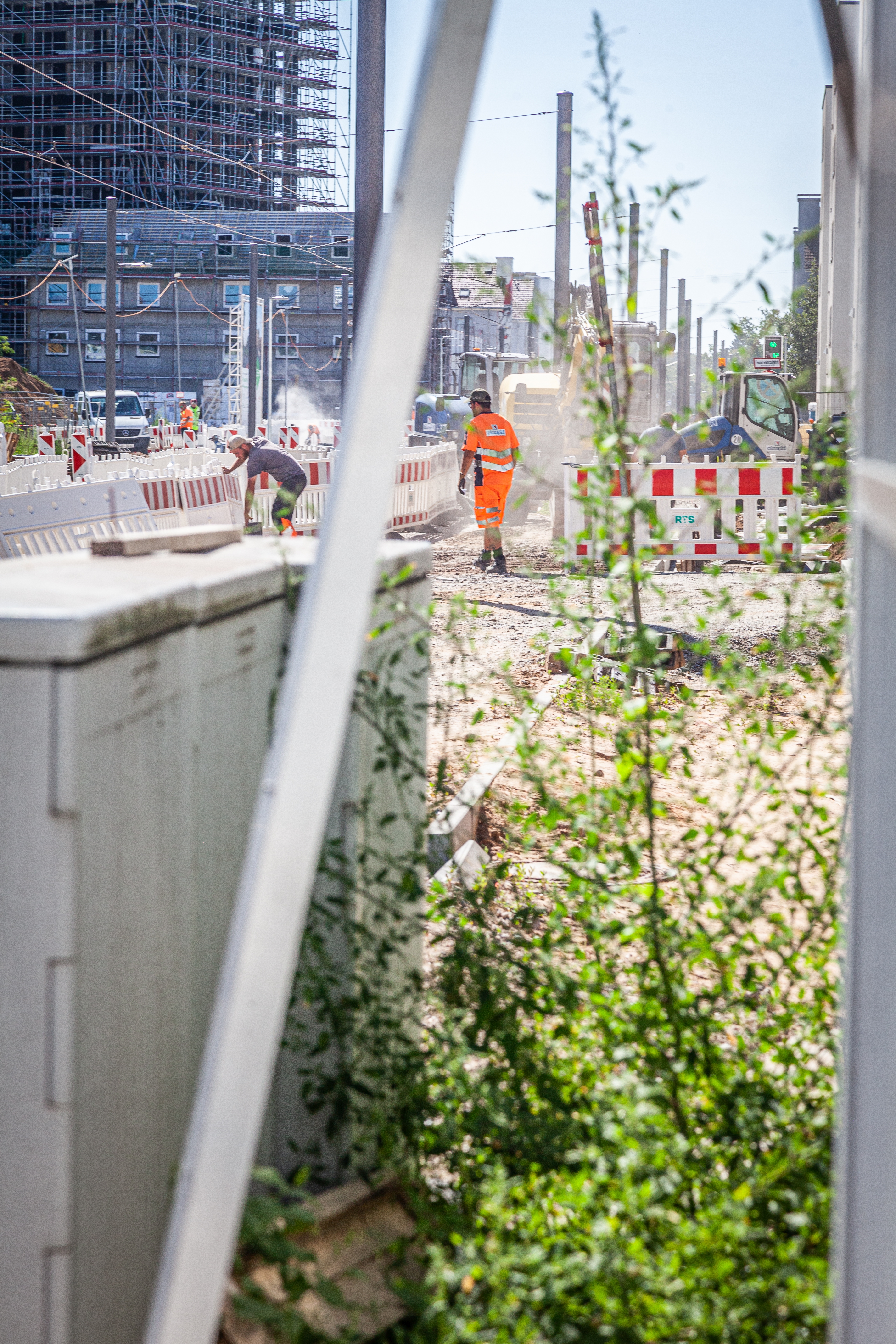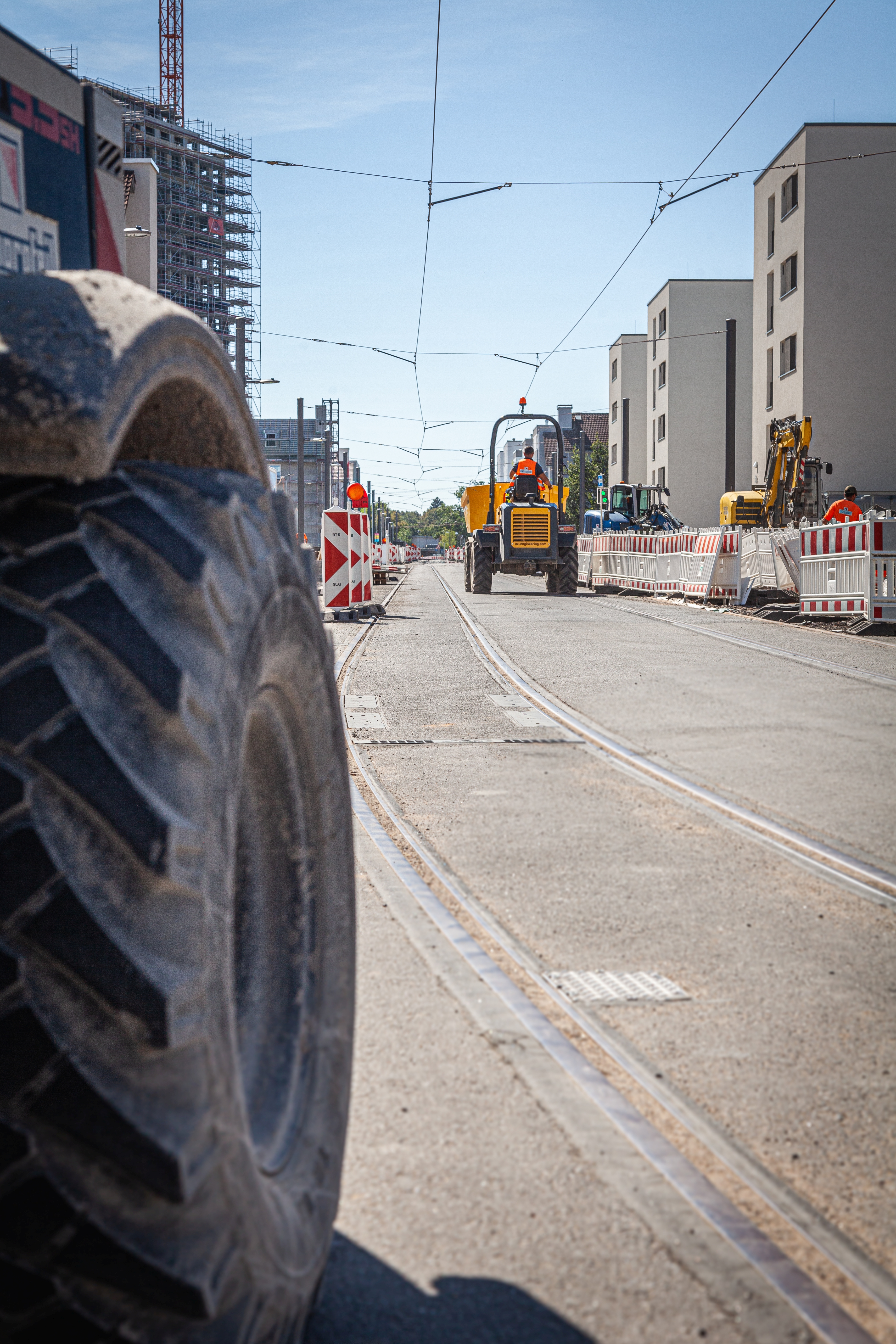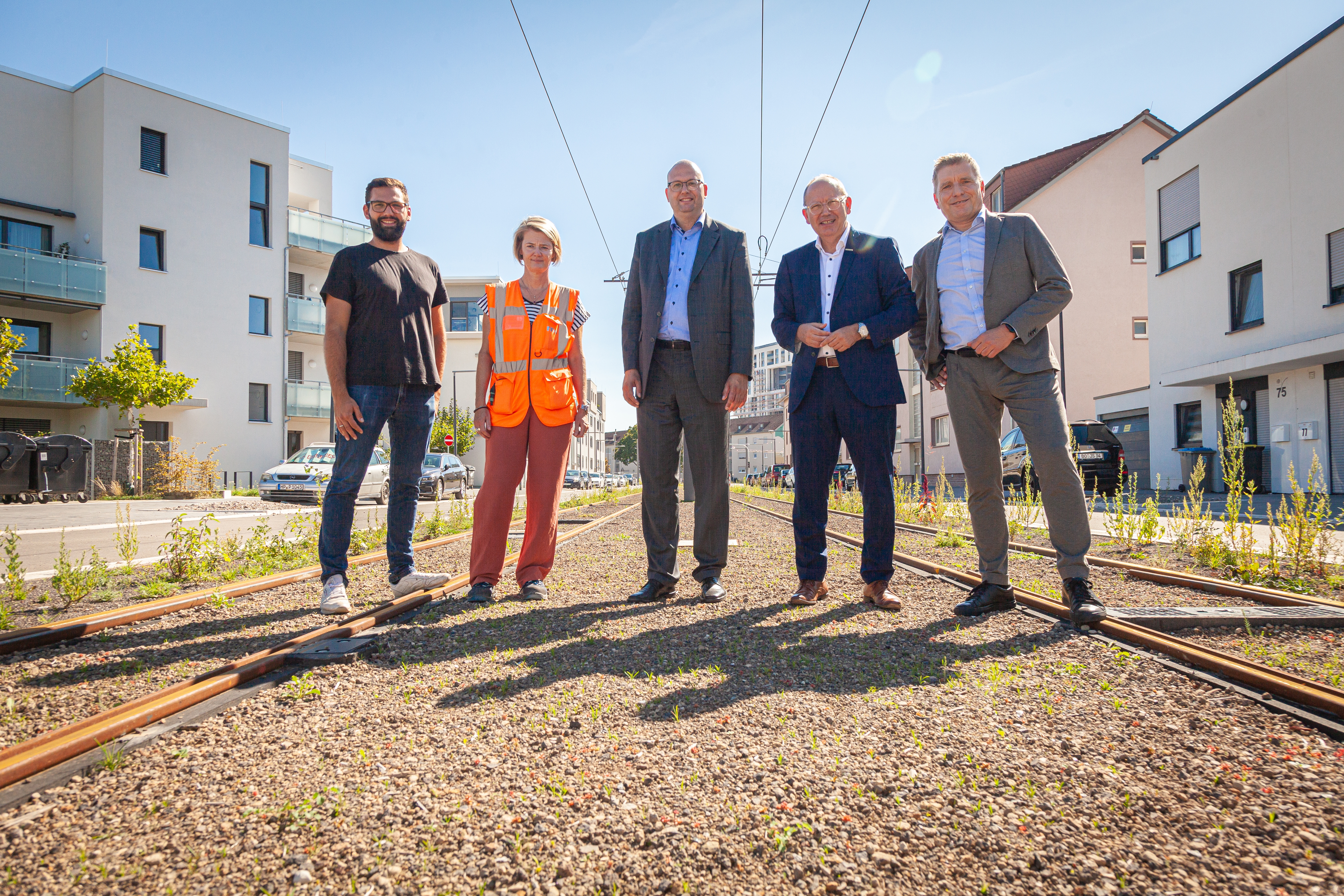 Philipp Knerr, Planung Bau bei der MWSP, Andrea Böttger, Projektleiterin der rnv, Marcus Geithe, Geschäftsführer der MV Mannheimer Verkehr GmbH (MV), Oberbürgermeister Christian Specht sowie Martin in der Beek, Technischer Geschäftsführer der Rhein-Neckar-Verkehrt GmbH (rnv), vor einem Teil der neuen Strecke