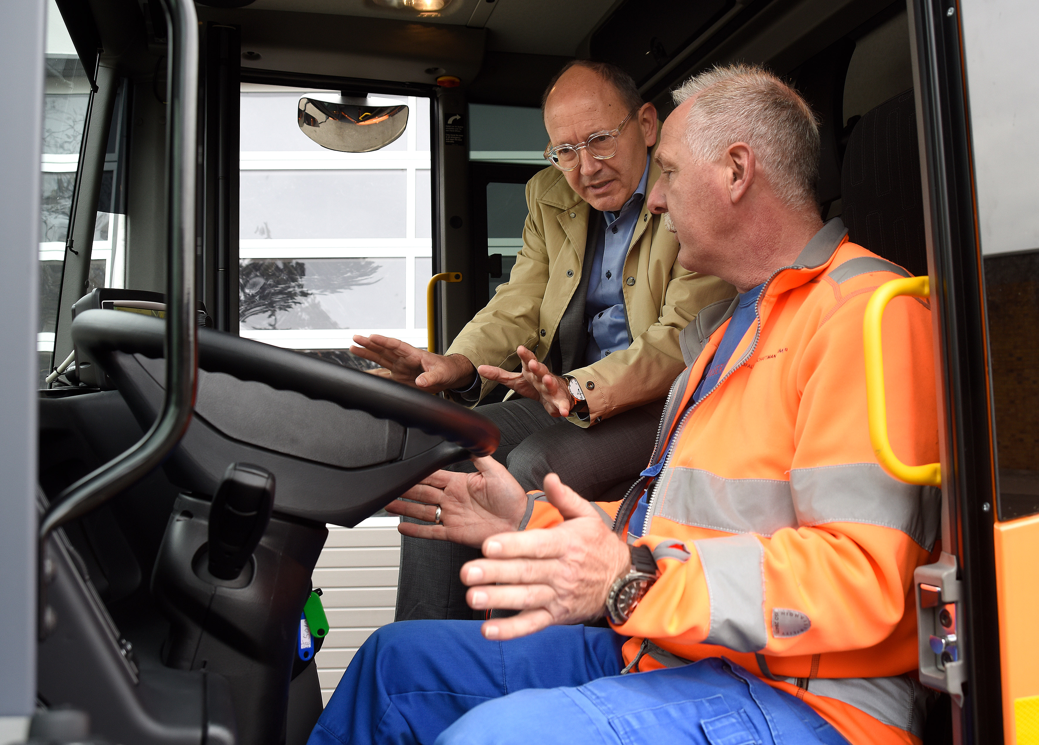 Oberbürgermeister Christian Specht lässt sich die Funktionen des neuen Fahrzeugs erklären