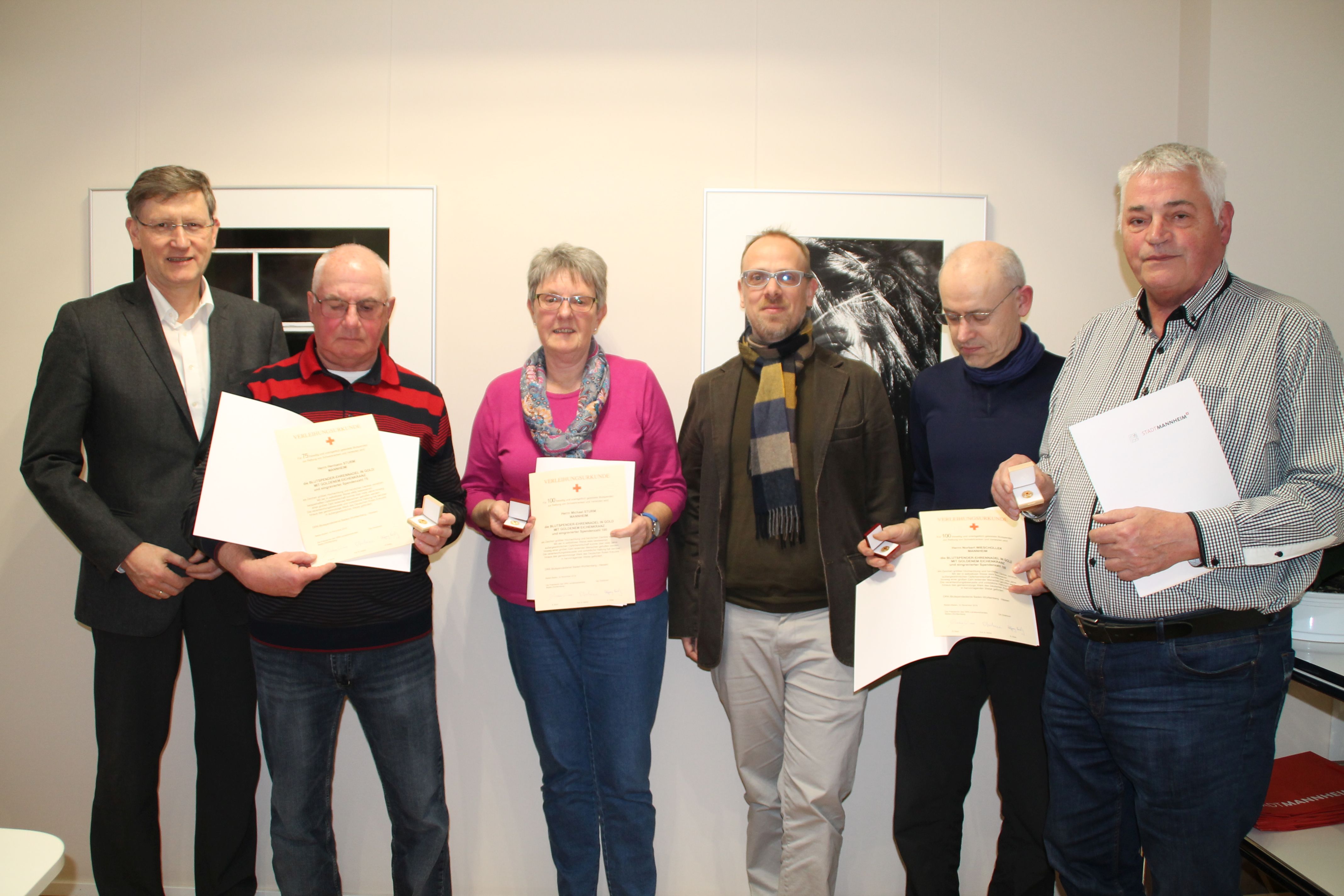 Die Blutspender*innen, der mehr als 75 bzw. 100 Spenden abgegeben hatten wurden mit der goldenen Ehrennadel des DRK und Urkunde von Gesundheitsbürgermeister Dirk Grunert (3.v.r) geehrt (v.r: Friedrich Zeitvogel, Norbert Wieschollek, Angelika Sturm, die die Urkunde und Medaille für ihren Sohn Michael Sturm in Empfang nahm sowie Herrmann Sturm neben Prof. Dr. Harald Klüter, Ärztlicher Leiter des DRK-Blutspendedienstes Baden-Württemberg-Hessen.