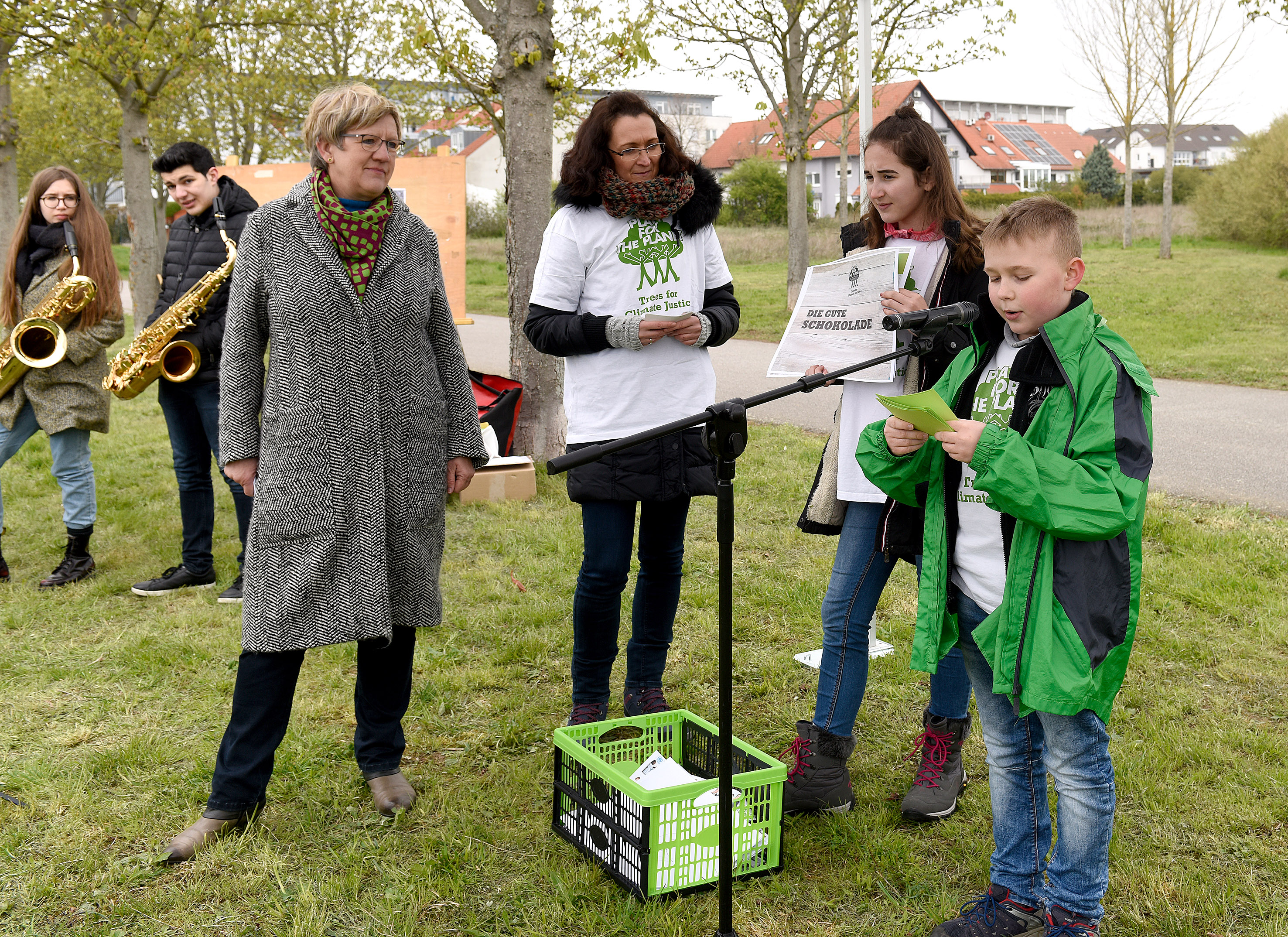Junge Botschafter von Plant-for-the-Planet beim Vortrag im Rahmen der Baumpflanzfeier im Bürgerpark
