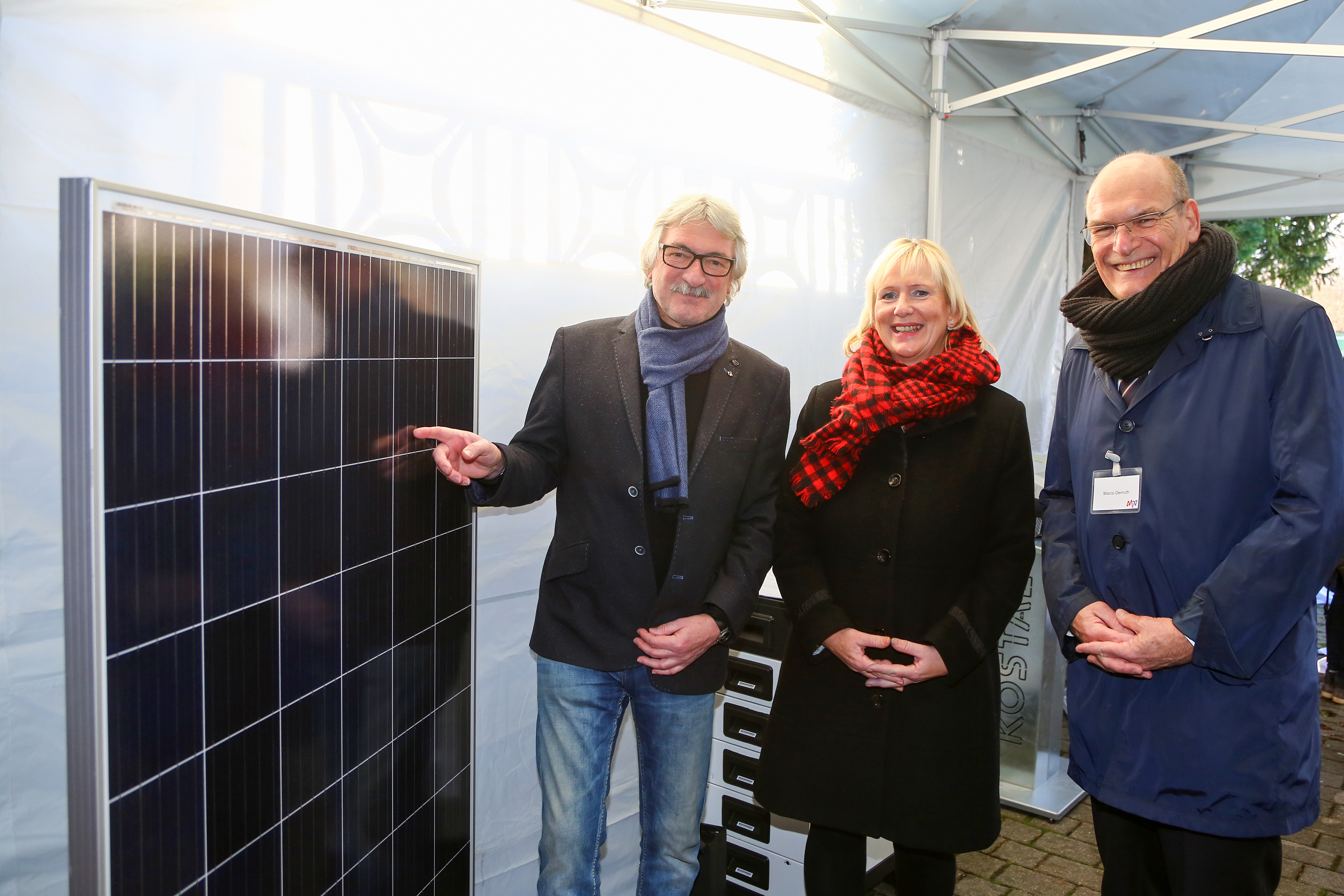 von links nach rechts: Herr Heißler, der einen Zuschuss für seine Solaranlage bekam, Frau Schönfelder (Geschäftsführerin Klimaschutzagentur Mannheim) und Herr Demuth (Bereichsleiter Vertrieb Regional MVV Energie)