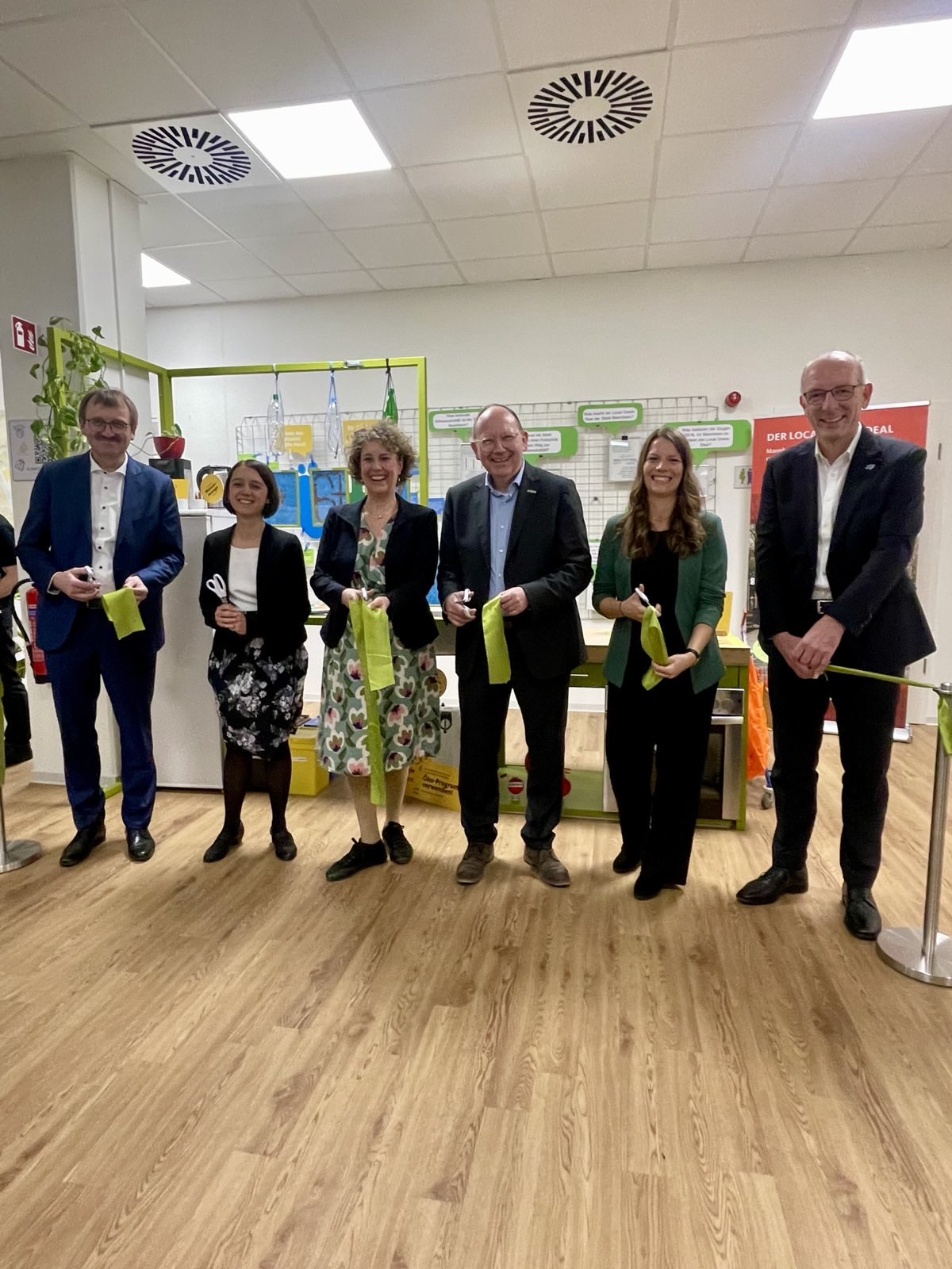 Karl-Heinz Frings, Geschäftsführer der GBG-Unternehmensgruppe, Marianne Crevon, Geschäftsführerin Klimaschutzagentur, Erste Bürgermeisterin Prof. Dr. Diana Pretzell, Oberbürgermeister Christian Specht, Eileen Roth, Geschäftsführerin Klimaschutzagentur, Ralf Klöpfer, Mitglied des Vorstands der MVV Energie