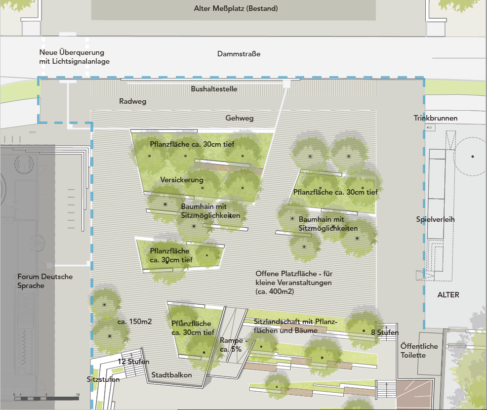 Zum Stadtjubiläum 2007 ist der Alte Meßplatz neu gestaltet worden. Jetzt soll in einem zweiten Bauabschnitt südlich des Alten Meßplatzes zwischen dem geplanten Forum Deutsche Sprache (FDS) und dem Projekt ALTER ein neuer Stadtraum entstehen, der auch einen barrierefreien Zugang zum Neckar ermöglicht. Das hat der Gemeinderat in seiner heutigen Sitzung beschlossen.