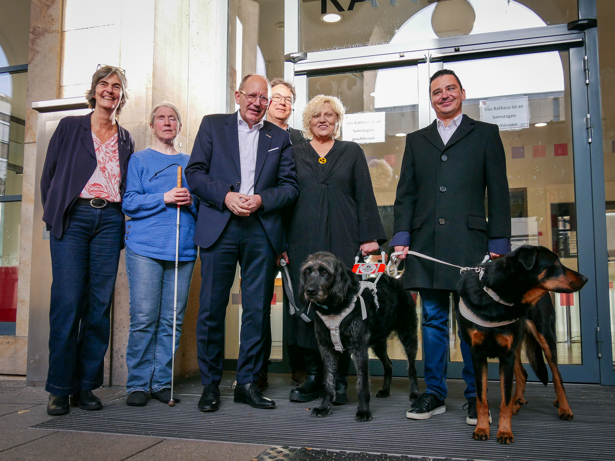 Kurz vor dem Internationalen Tag der Menschen mit Behinderungen am 3. Dezember brachten Oberbürgermeister Christian Specht und die Beauftragte für die Belange von Menschen mit Behinderungen, Ursula Frenz, gemeinsam mit Vertreterinnen und Vertretern des Vereins Pfotenpiloten und des Badischen Blinden und Sehbehinderten Vereins (BBSV) den ersten Aktionsaufkleber am Haupteingang des Rathaus E 5 an. Assistenzhunde waren hier auch schon vorher erlaubt. Seit 2021 regelt zudem das Assistenzhundegesetz (§12e–l Behindertengleichstellungsgesetz) die Zutrittsrechte eindeutig.