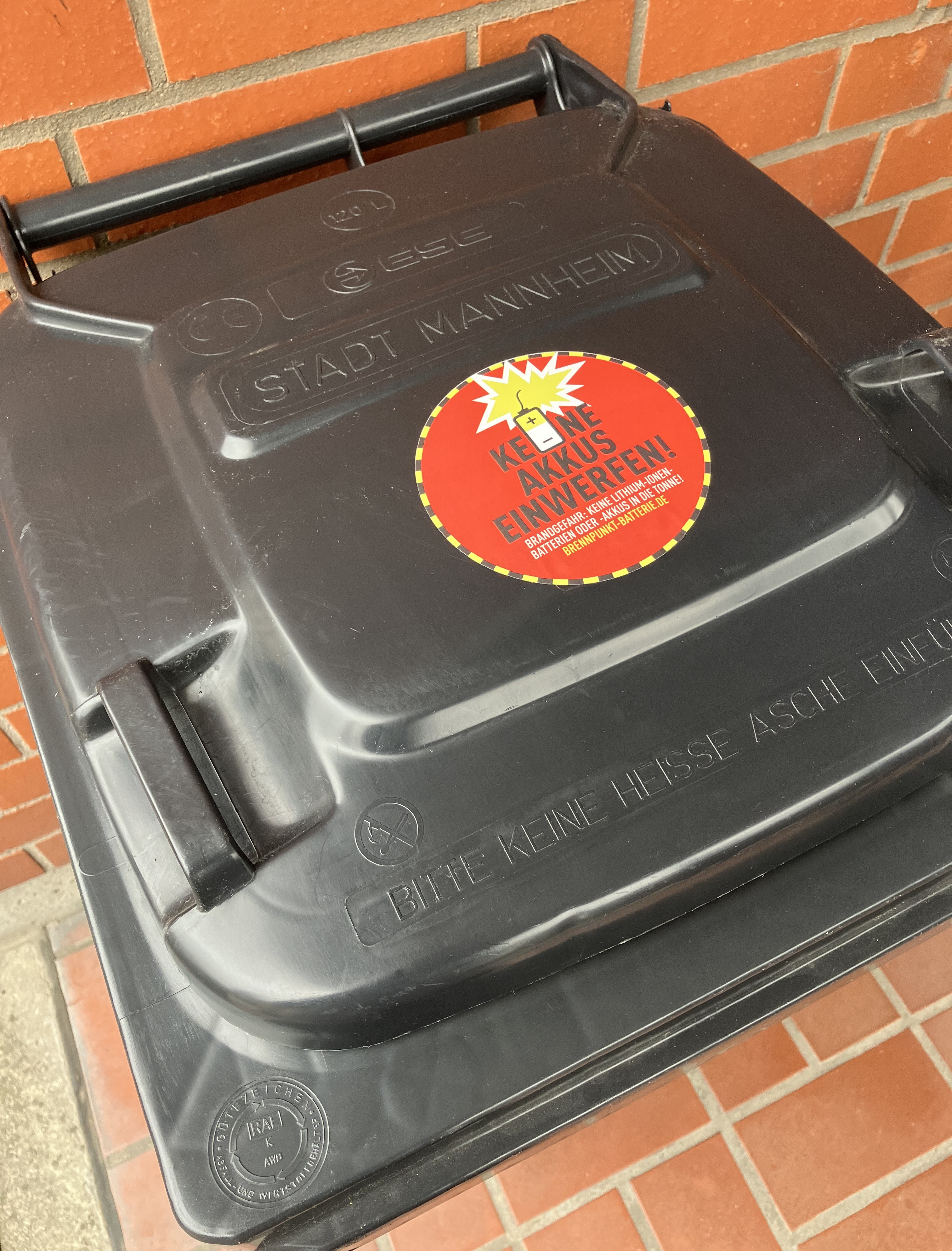 Um gezielt auf die richtige Entsorgung von Batterien und Akkus hinzuweisen, startet der Stadtraumservice Mannheim mit dem BDE Bundesverband der Deutschen Entsorgungs-, Wasser- und Kreislaufwirtschaft e. V. eine Aktion und beklebt alle Hausmülltonnen im Stadtgebiet Mannheim in den kommenden Monaten mit dem Hinweis „Keine Akkus einwerfen!“.