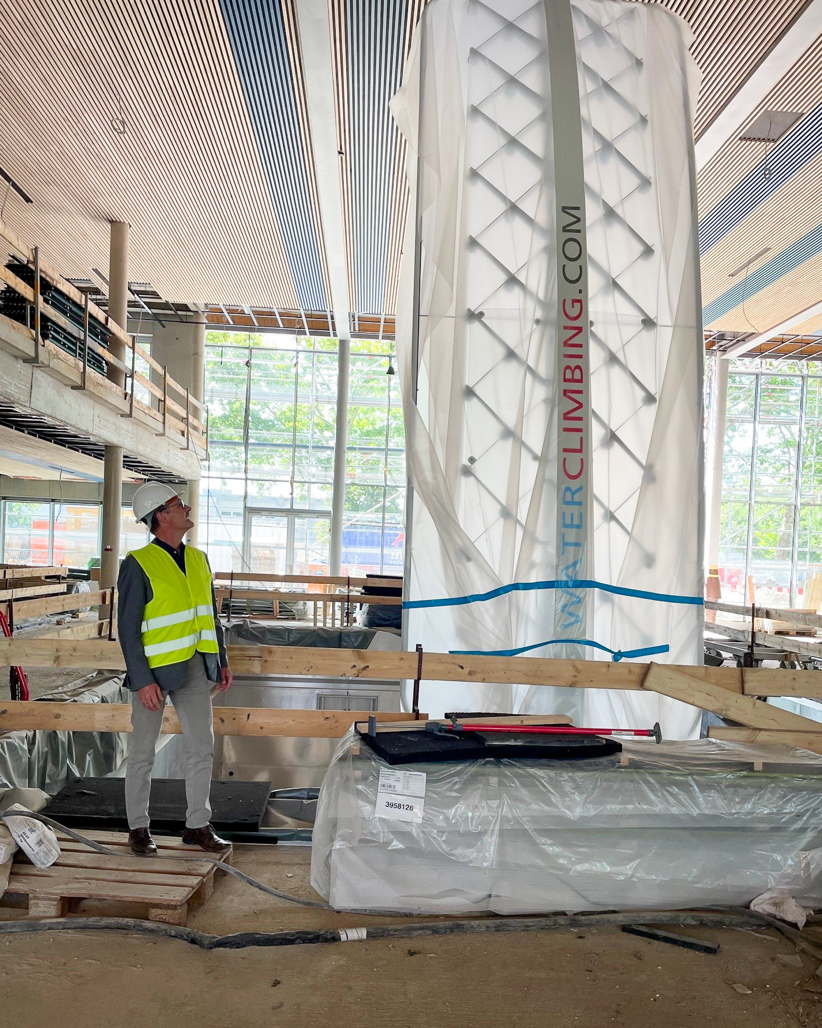 Die Kletterwand wurde jetzt geliefert und am Sprungbecken gegenüber den Sprungtürmen aufgebaut. Sie ist über 5 Meter hoch und 2 Meter breit – ein weiters Highlight im neuen Kombibad, das 2026 eröffnet wird.