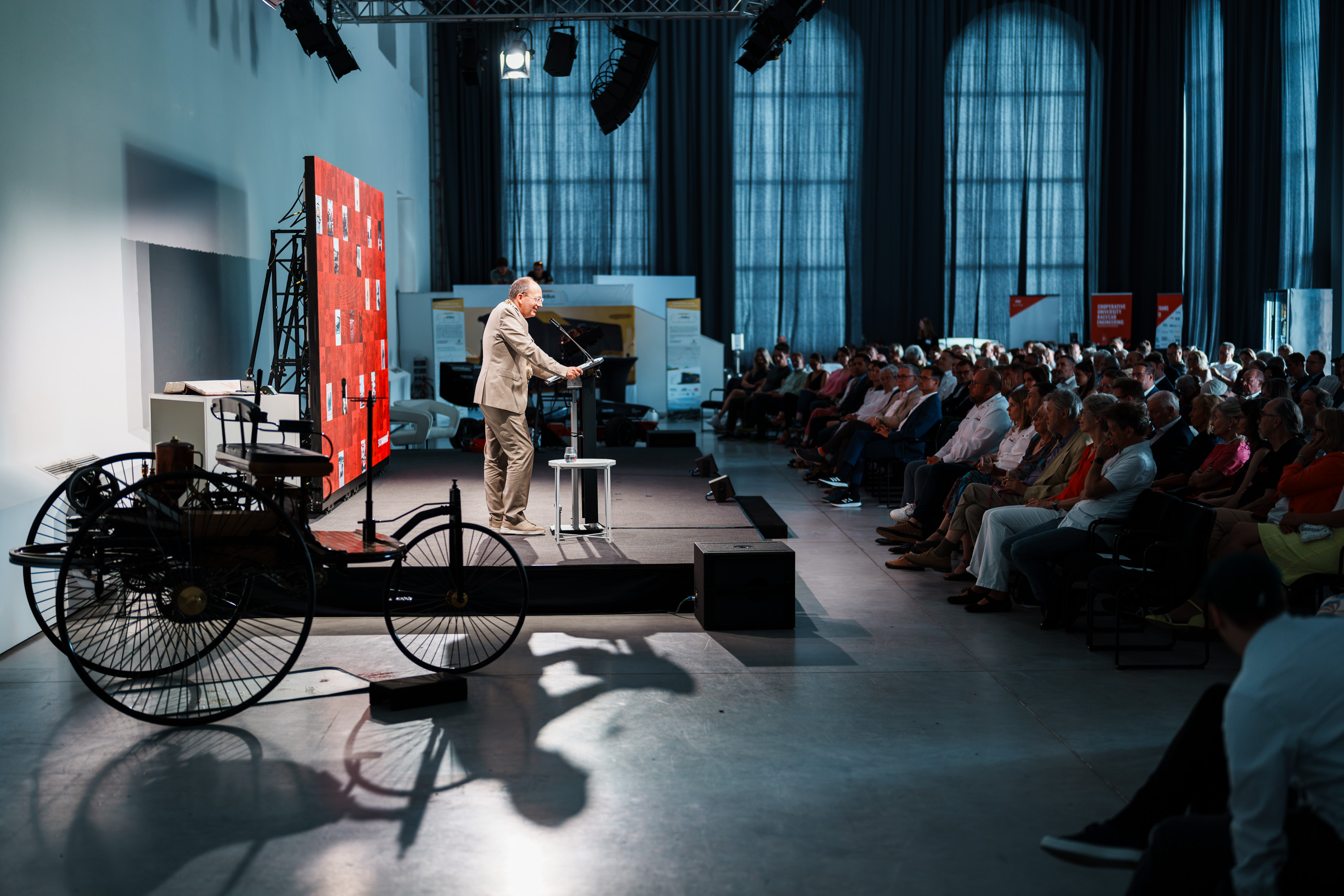 Oberbürgermeister Specht betonte in seine Rede die universelle Herausforderung des Klimawandels und die Notwendigkeit eines umfassenden Transformationsprozesses, um die Zukunft nachfolgender Generationen auf unserem Planeten zu sichern. „Die Ära des Verbrennungsmotors, die Carl Benz begründet hat, neigt sich nach rund 150 Jahren ihrem Ende zu. Es gilt, nachhaltige Lösungen zu finden und alternative Antriebe zu entwickeln“, erklärte Specht. „Die Welt hat sich verändert, wir müssen uns verändern, die Mobilität wird sich verändern“, so der OB weiter.