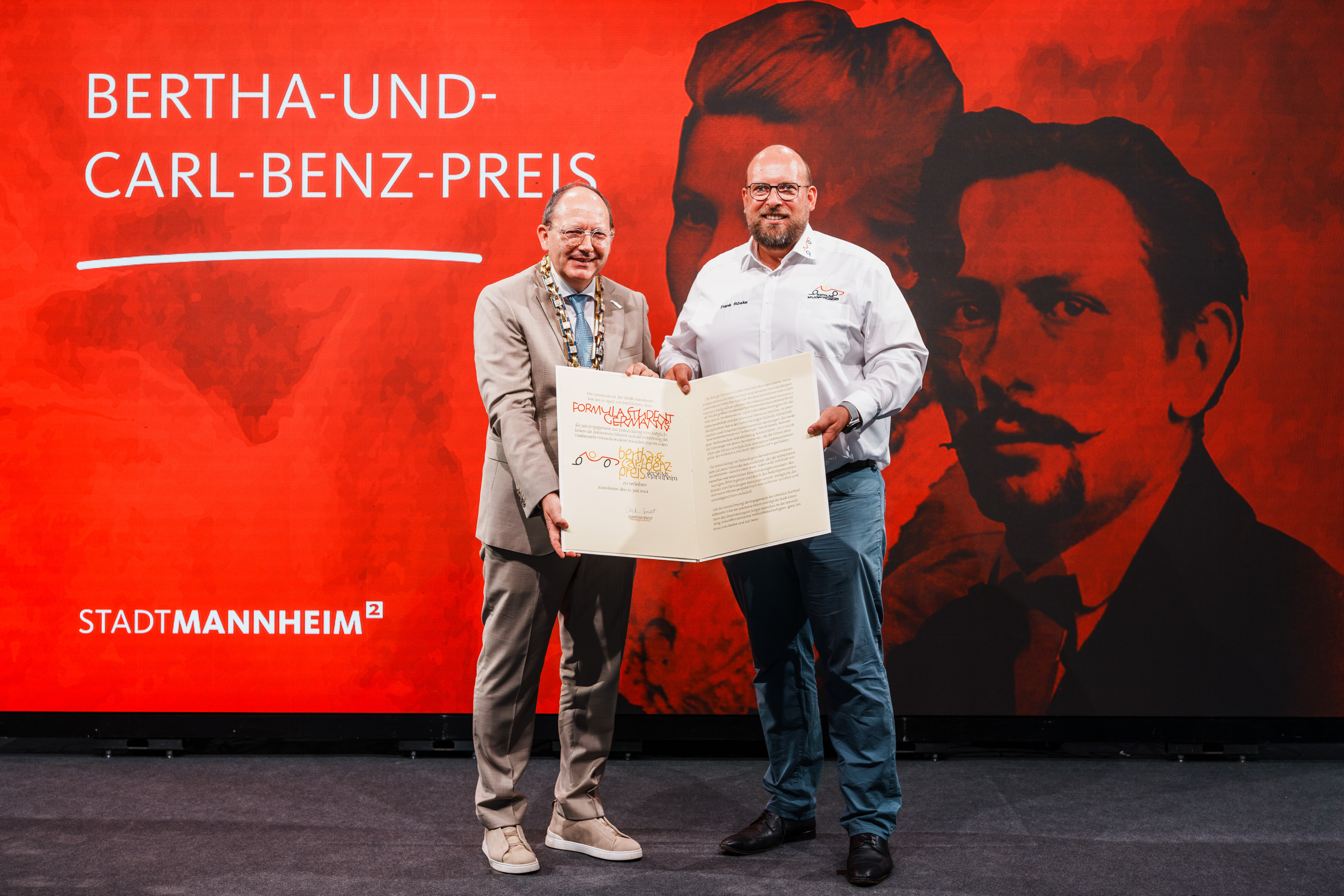 Oberbürgermeister Christian Specht hat am Sonntag (21.07.2024) bei einem Festakt den mit 10.000 Euro dotierten Bertha-und-Carl-Benz-Preis der Stadt Mannheim an den Formula Student Germany e. V. für ihren Wettbewerb Formula Student Driverless Cup (DC) verliehen. Der Preis, der zum siebten Mal vergeben wurde, ehrt Personen, Gruppen und Organisationen, die bedeutende Beiträge zur Verbesserung der Mobilität geleistet haben, insbesondere in den Bereichen umweltgerechte, soziale oder einfachere Mobilität.