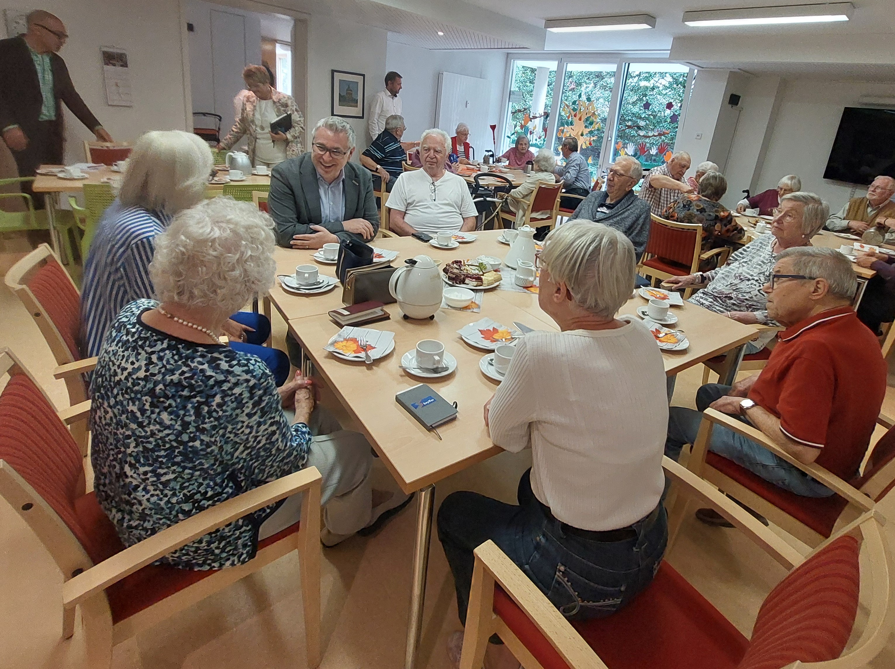 Der Empfang der 31 Bewohner*innen im Gemeinschaftsraum des Betreuten Wohnens der Theodor Fliedner Stiftung in Mannheim-Wallstadt war herzlich – mit Kaffee und Kuchen, einem Ständchen und guten Gesprächen. Bei einem Besuch vor Ort machte sich Bürgermeister Thorsten Riehle – in seiner Funktion zugleich Stiftungsratsvorsitzender der Fliedner Stiftung – einen Eindruck des Leistungsportfolios des Hauses. „Wir bieten einen bunten Strauß an Aktivitäten – bei uns kann man `Freizeitstress` erleben, wenn man das möchte“, sagte Marcus Miertsch, Geschäftsführer der Stiftung, bei der Begrüßung. Gemeinsam mit Betriebsleiter Andreas Schulmeister und Andrea Mnich vom Team des Betreuten Wohnens stellte er die Einrichtung vor. Vielfältige Angebote im Haus – vom gemeinsamen Frühstück bei speziellen Anlässen über Sitzgymnastik bis hin zum beliebten „Stadt.Land.Fluss-Spiel“ – ermöglichen es, von einer Hausgemeinschaft zu profitieren. Die sozialen Angebote und Veranstaltungen sind Teil der Betreuungspauschale des Betreuten Wohnens. Gleichzeitig können die Bewohner*innen – ob alleine oder als Paar – in ihren 45 bis 75 Quadratmeter großen vollausgestatteten Wohnungen in ihrem eigenen Reich leben. Einblicke in ihre Wohneinheiten gewährten Helga Köster, seit 2008 und damit von Beginn an Bewohnerin des Betreuten Wohnens in Wallstadt, sowie Elke Hartl Bürgermeister Riehle bei einer kleinen persönlichen Führung. Der Pflegedienst kann von den Mietern für die Grund- und Behandlungspflege sowie hauswirtschaftliche Leistungen separat beauftragt werden. „Es ist beeindruckend, wie es der Fliedner Stiftung gelingt, den Bewohner*innen des Betreuten Wohnens ein hohes Maß an Selbständigkeit und Lebensqualität bis ins hohe Alter zu ermöglichen“, so das Fazit von Bürgermeister Riehle am Ende seines Besuchs.