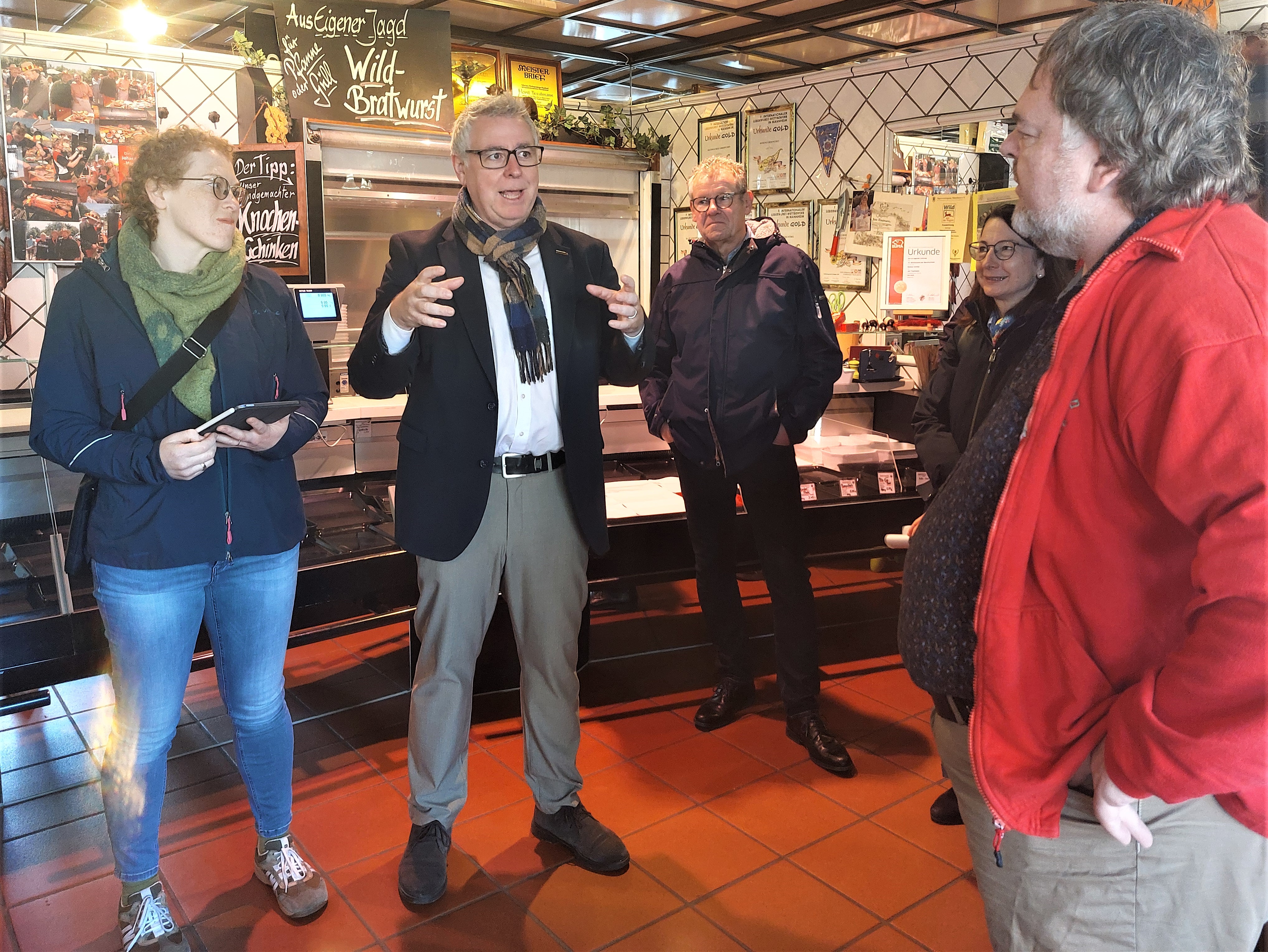 Im Anschluss daran führte der Rundgang zur Feudenheimer Hauptstraße, wo die örtliche Nahversorgung im Fokus stand. Während des ausführlichen Austauschs in der Metzgerei Trautmann und der Buchhandlung Waldkirch wurden die Belange kleinstrukturierter Betriebe deutlich. Besonders wichtig sei eine Vielfalt an Geschäften und gemeinsamen Aktionen, die den Stadtteil beleben und diesen attraktiv halten, brachten Barbara Waldkirch („Wir sind ein niederschwelliges soziales Angebot. Wir brauchen Aktivitäten.“) und Horst Trautmann („Die Einkaufsstraße darf nicht erodieren. Wir müssen die Leute auf die Gass‘ bringen) zum Ausdruck. Bürgermeister Riehle unterstützte das Ansinnen, verwies aber auch auf die Verantwortung der Immobilieneigentümer bei Neuvermietungen.